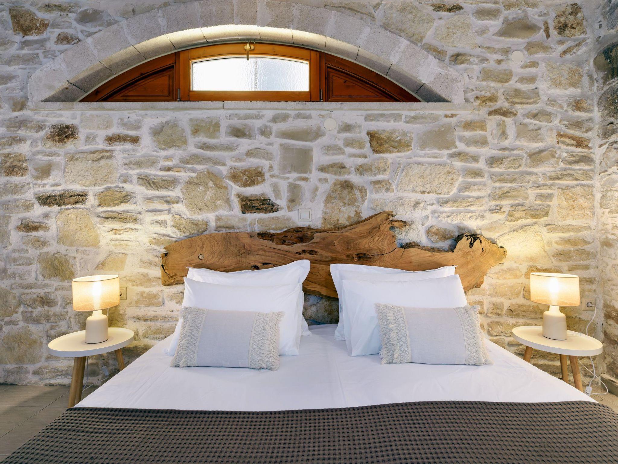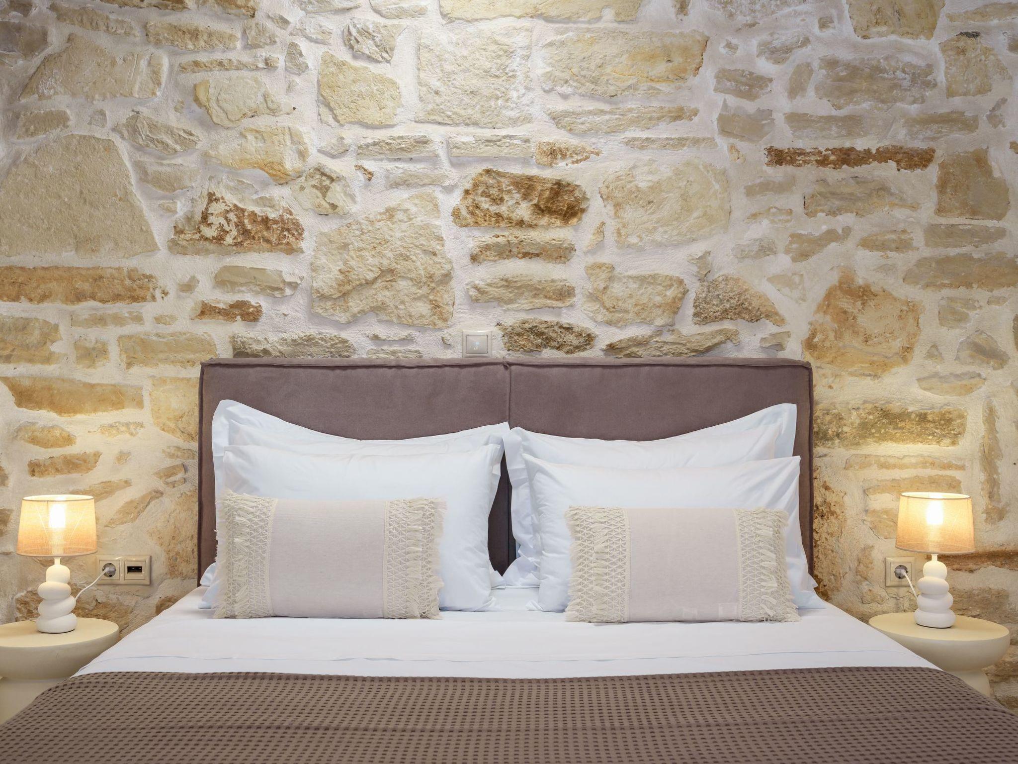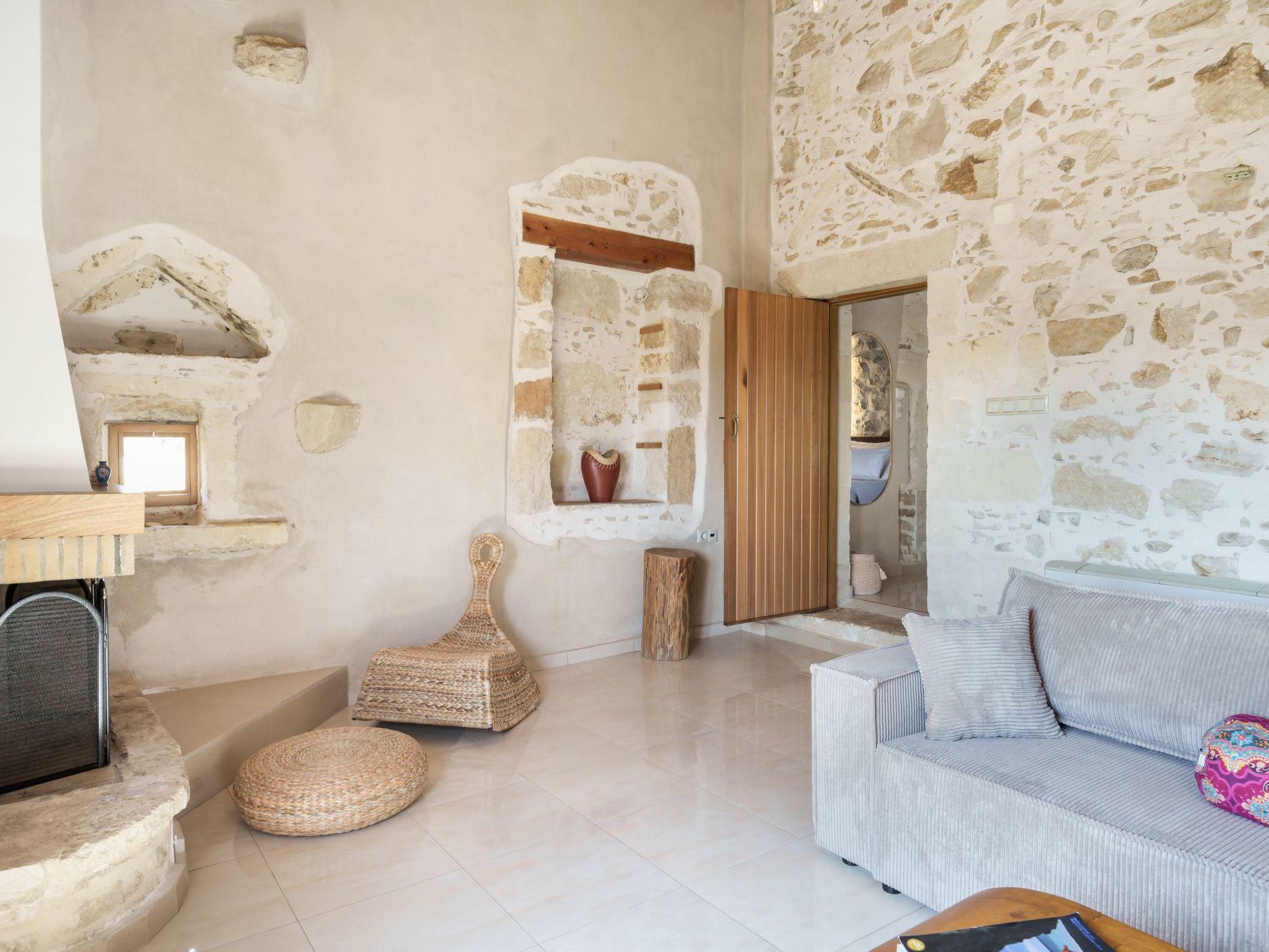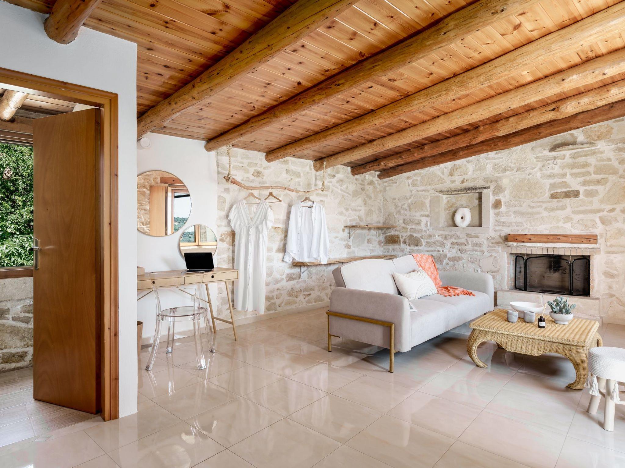 The first apartment is the largest of the three, featuring two spacious ensuite bedrooms with king-size beds and air conditioning. A cosy living room with a built-in fireplace and comfortable seating creates a welcoming atmosphere for unwinding. The fully equipped kitchen includes a dishwasher, oven, stove, and a Nespresso machine, making it ideal for guests who enjoy home-style cooking while on vacation in Crete.