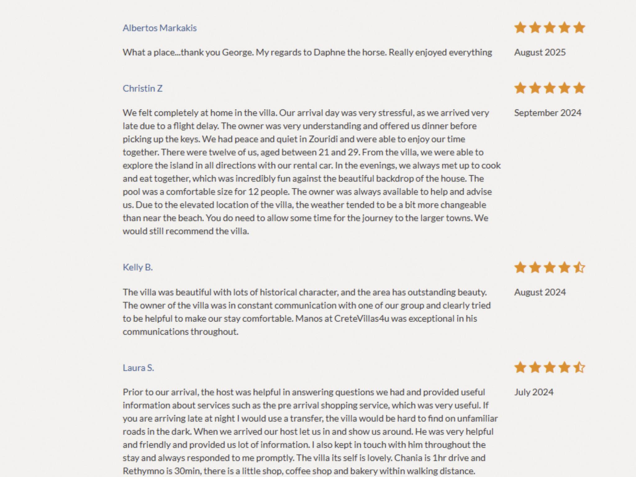 To ensure a stress-free holiday experience, we will send you a link to our GuestGuide4u approximately two weeks prior to your arrival. This guide will include many details for the house, recommendations for local activities in Crete, suggested restaurants, and other helpful travel information.