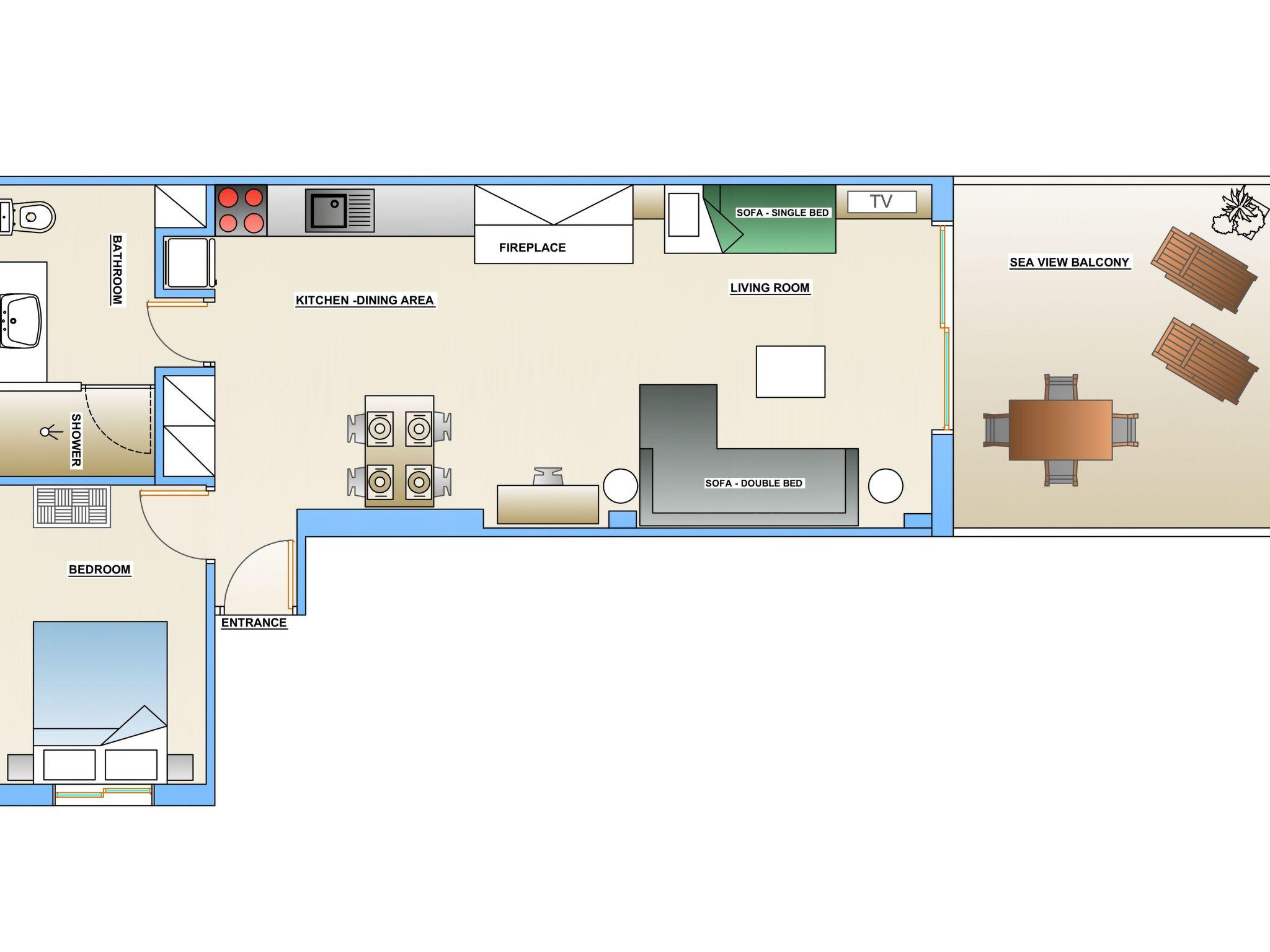 Apartment have a living room with a sofa bed, a bedroom with a double bed, a kitchen, and a bathroom with shower.