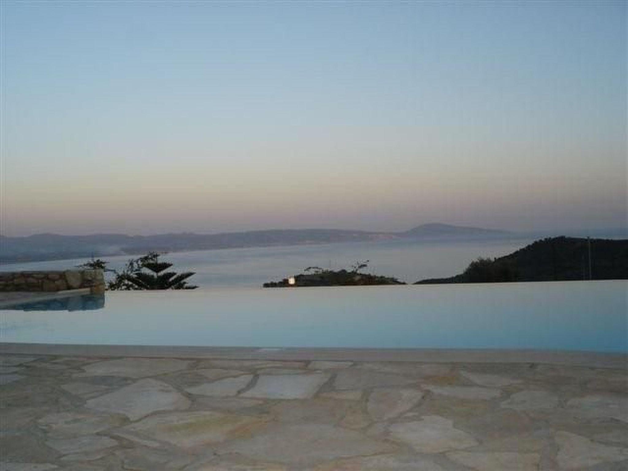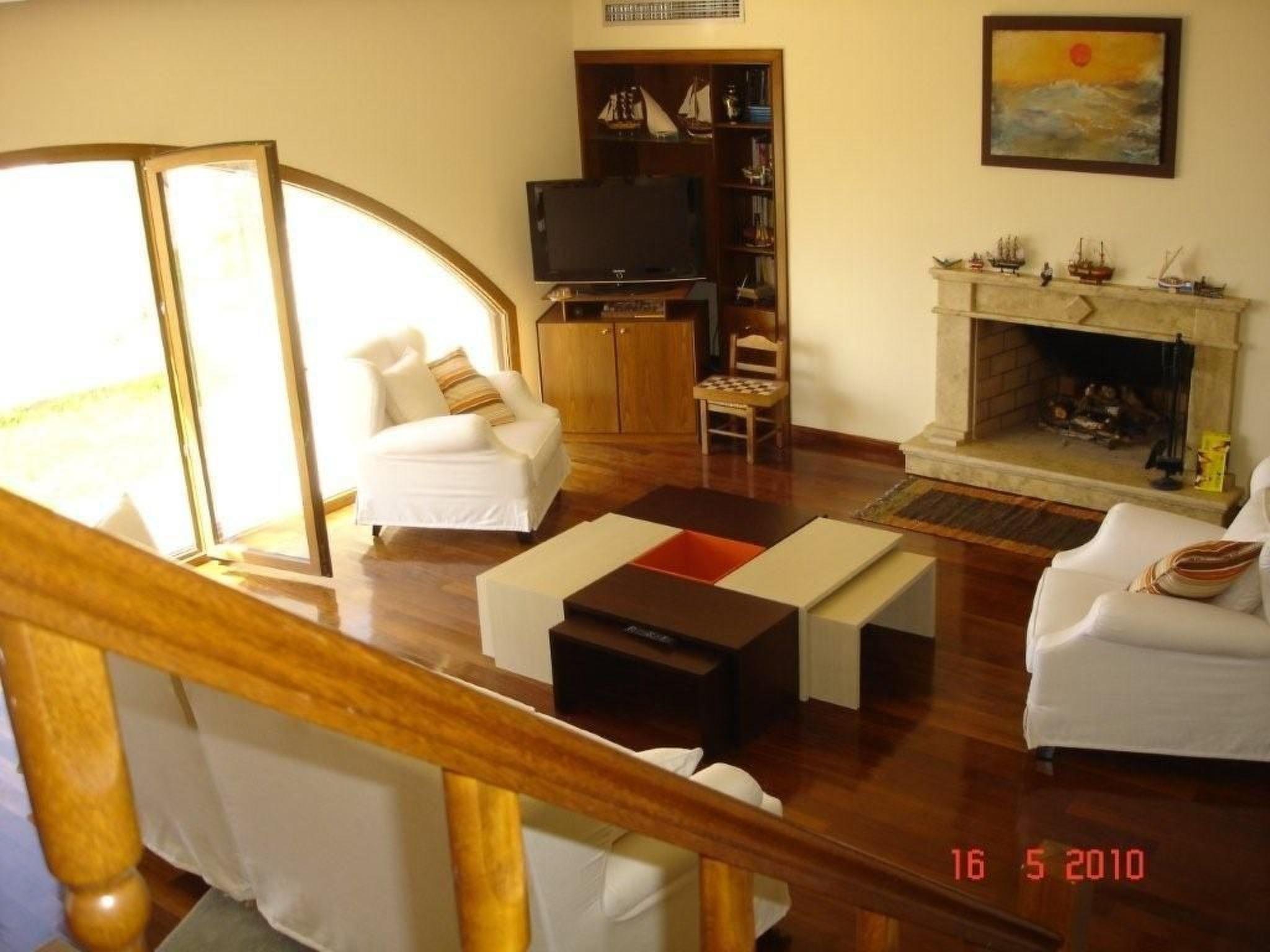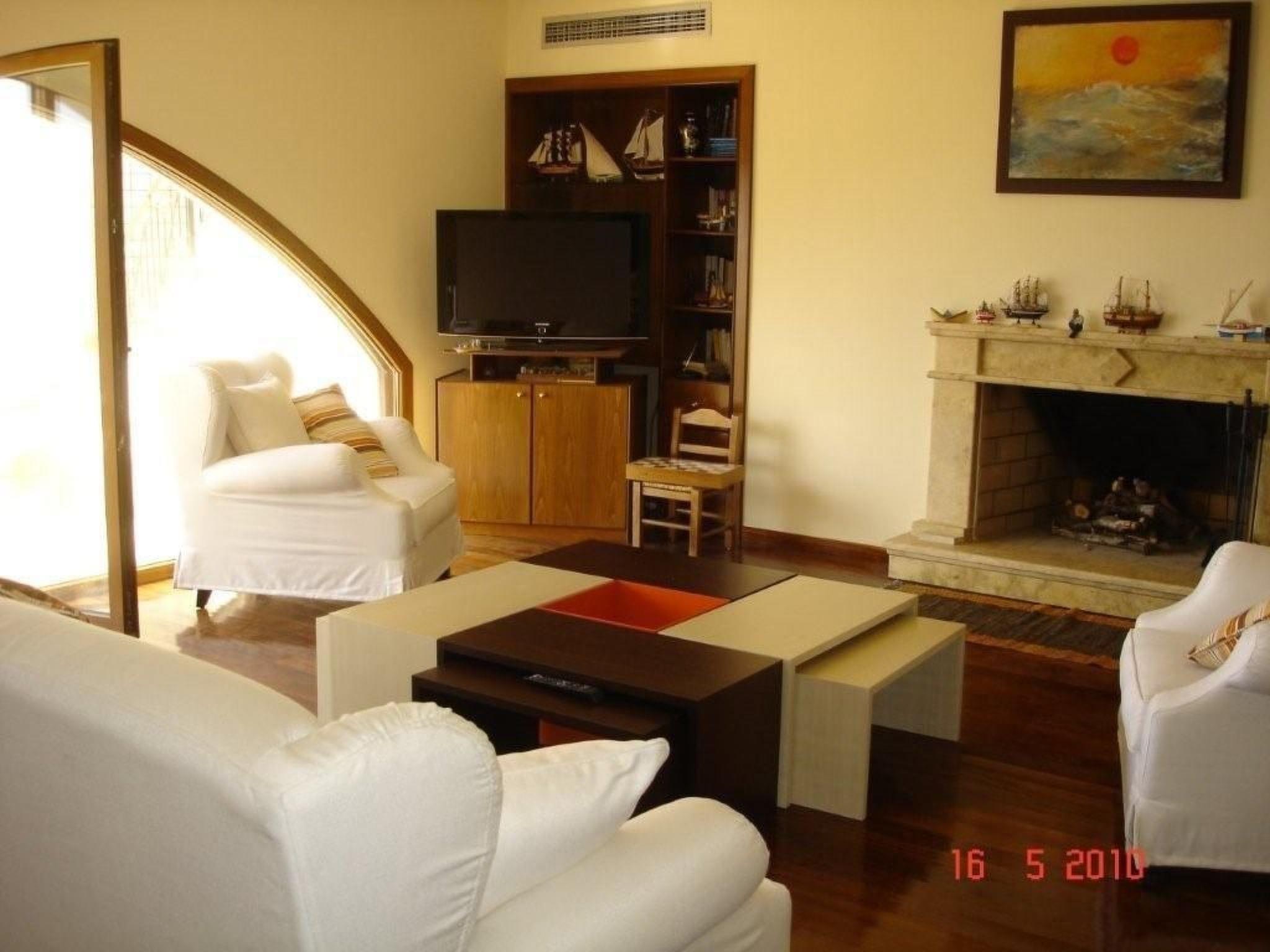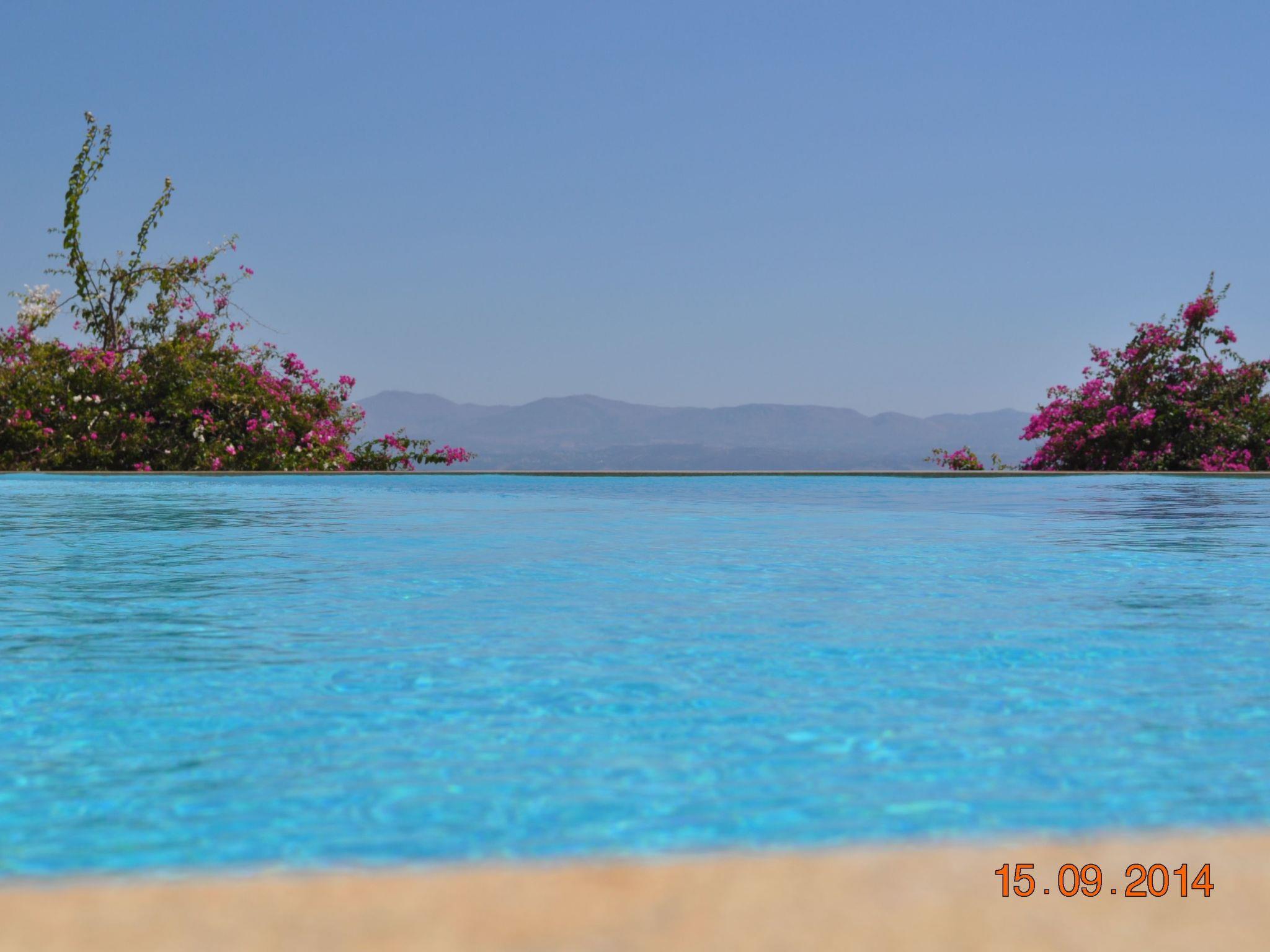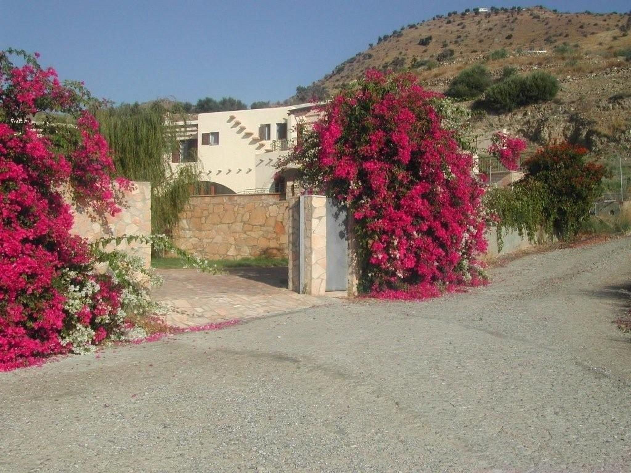 Some informations concerning the house The house, situated on the hill Platyvola over the beach of Agia Galini Village, stands in the middle of 8.300 m2 property which also includes 170 small olive trees and 67 vines. A marvelous view to the sea extends from the house and the whole property. We can see the islands of Paximadi, the villages of Agia Galini and Matala and the surrounding hills of very old olive trees. The architectural design of the house is inspired from the Cretan construction style of the post Minoan period. The house complex is formed by two different buildings: the main house “Spiti” and the secondary house “Paraspito”. The Paraspito is our guest house. On the first floor there is a large bedroom, a bathroom with WC, a kitchenette, a dining room and a large balcony. At the ground floor are the swimming pool’s WC and a covered area, cool and shady used as an eating place. Conforming to the style of the post Minoan period, the house complex is surrounded by a wall. Cretans used such walls as a defense against pirates that often visited the south part of Crete. In our case the wall, is the swimming pool’s wall! From the guesthouse’s balcony we can directly dive at the deepest part of the swimming pool, which is a 14x7 meters overflow type. NB the swimming pool remains closed from 15 November to the end of March every year. Looking out from the living room of the main house, you see the blue water of the swimming pool becoming one with the blue of the sea. The property’s main entrance is a heavy metallic rolling gate flanked by beautiful bougainvilleas. As you enter you find two stone covered alleys. One goes to the entrance of the court under the guest house and one goes to the garage. As we open the garage’s wooden rolling door we enter an area of 200 m2. Here is also stored a small boat with a 25hp Mercury outboard engine. It is at your disposal for fishing or fun. The left part of the garage houses the pool room and its equipment. We go up through a slated stair and arrive to the swimming pool patio, an area covered with Cretan flat ceramic colored stones and a grass court. At our left there is a 100 m2 swimming pool. In front of us is the guest house and at our right the main house. We enter the main house by a wooden door under an arched area where we take our breakfast at summer. We walk in the living room on iroco wooden floor. All floors of the house (salon, dining room, corridors, internal stair and bedrooms) have wooden iroco with the exception of the bathrooms and the kitchen. At our right side there is the dining room adjoining a fully equipped kitchen and a WC. The wooden staircase takes us to the first floor. Here are four large bedrooms, each one with its own bathroom and WC. Each bedroom has its own large balcony with a beautiful view to the sea. From the balcony of the master bedroom we can go down to the court through an external slated stair.