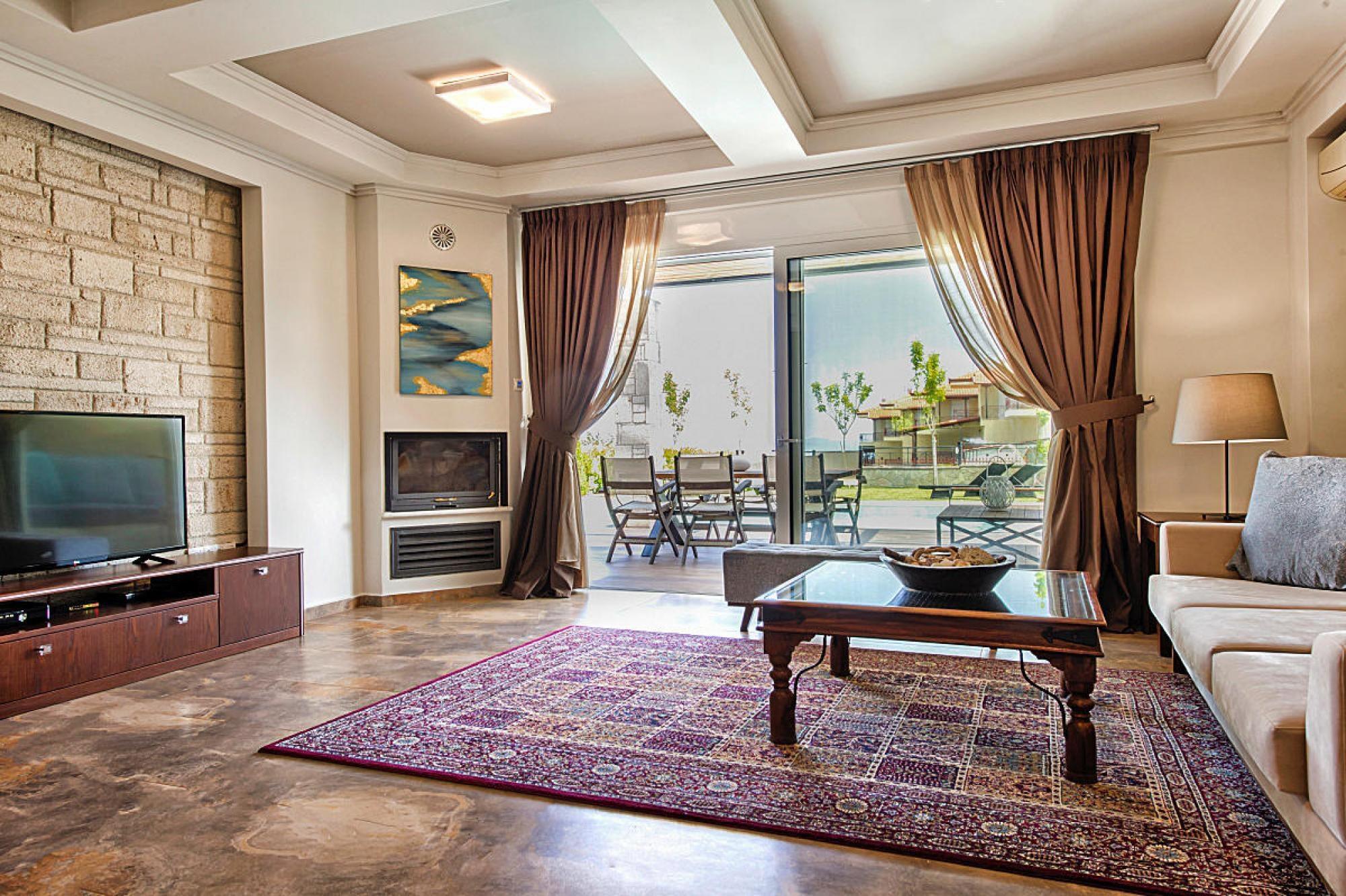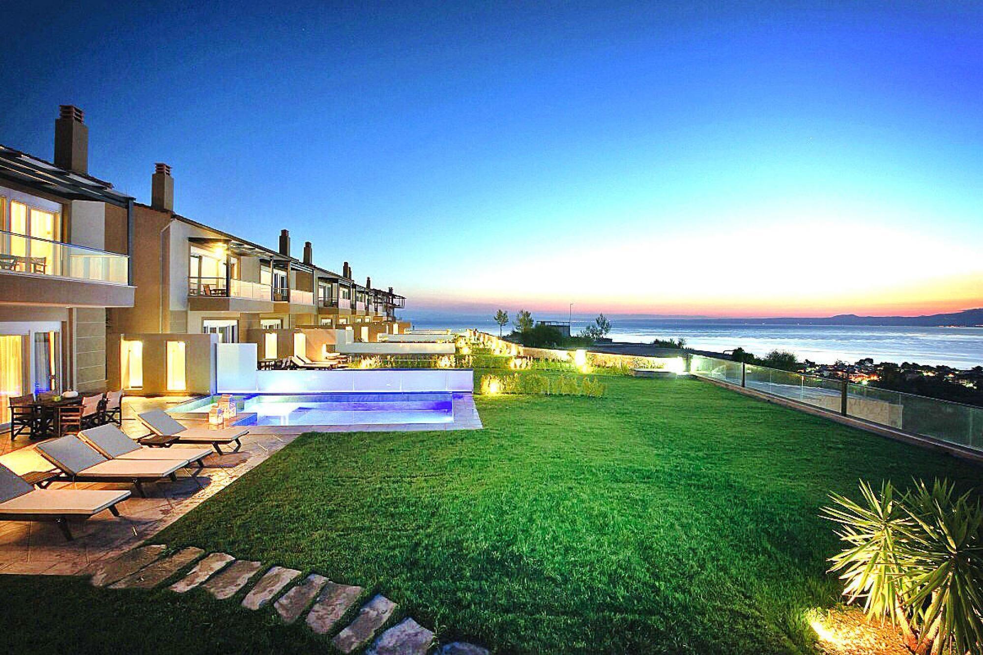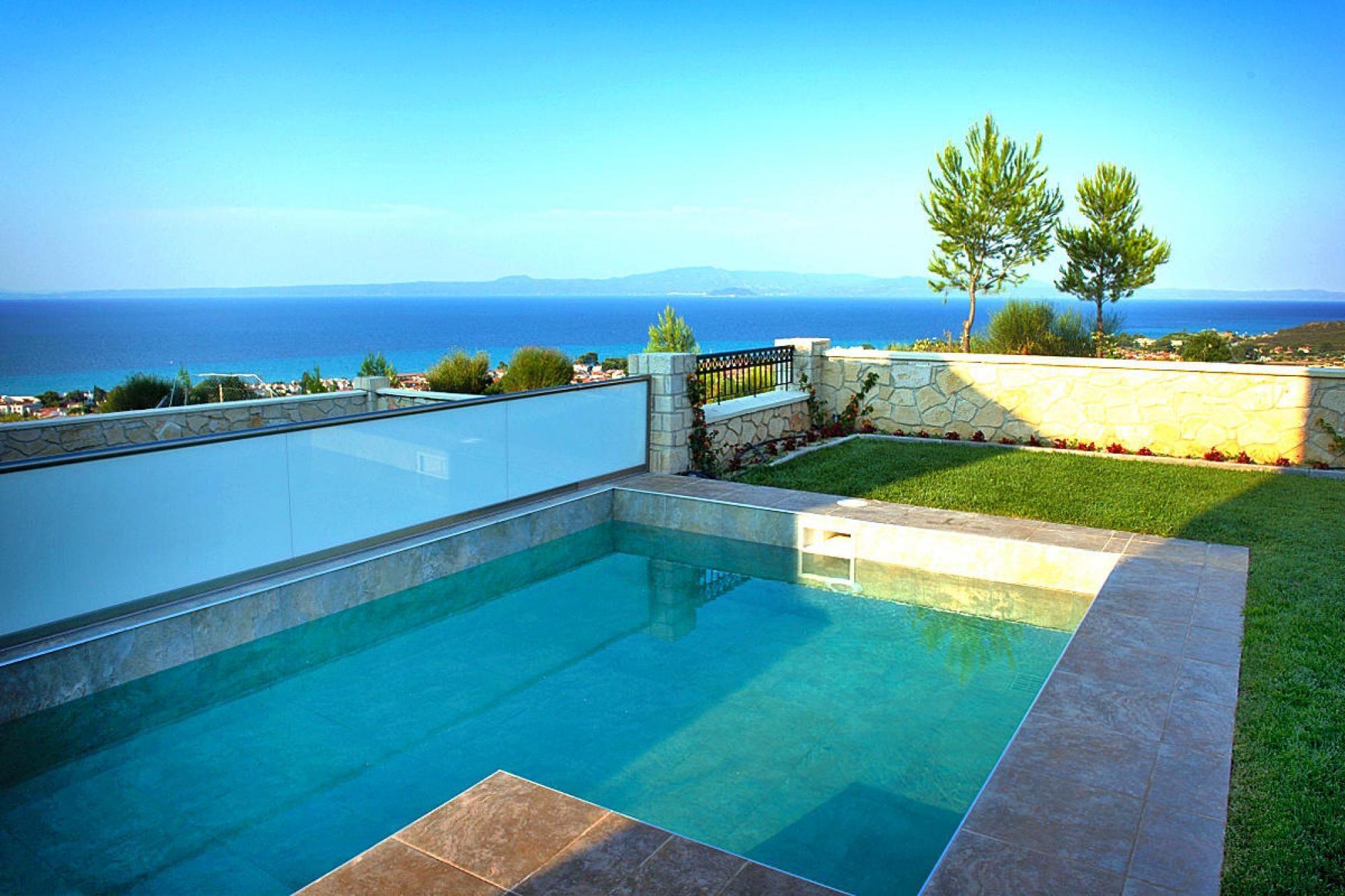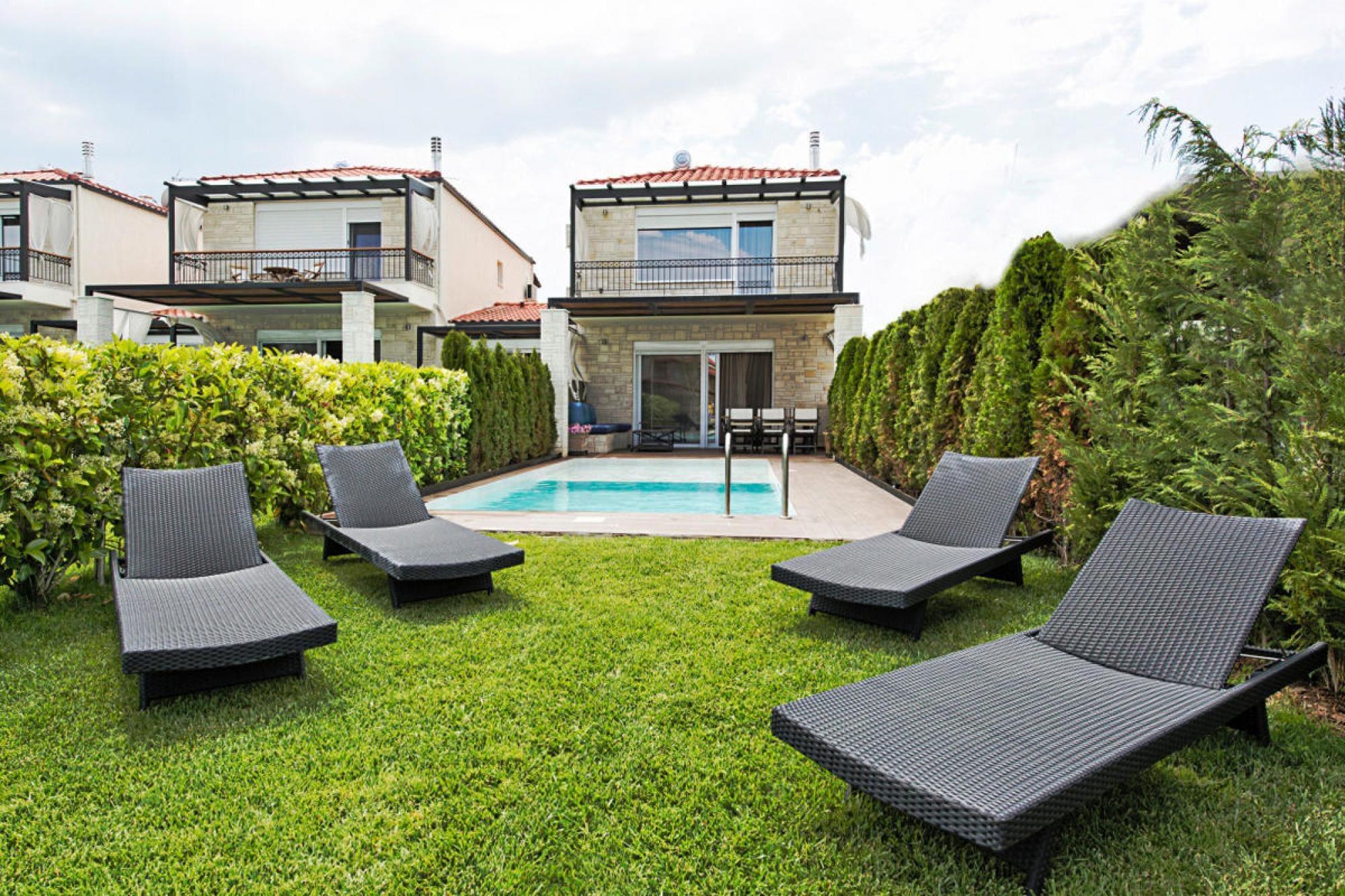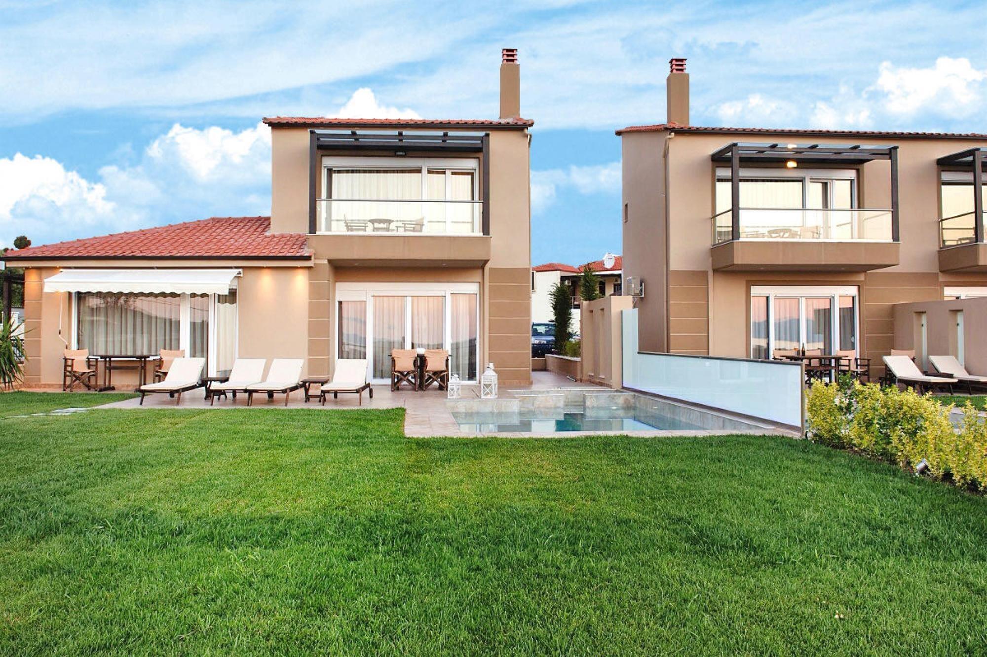 Luksuriøst villakompleks på en imponerende bjergskråning over Chanioti med en vidunderlig udsigt over det blå hav og den modsatte halvø Sithonia. De otte smagfuldt og komfortabelt indrettede feriehuse (bygget i 2014) har hver en velholdt have med en møbleret terrasse og en privat swimmingpool med hydromassage. Her kan du slappe af med en kølig drink og nyde fantastiske solopgange. Et resorts egen SPA med indendørs pool, sauna og fitnessrum er gratis til rådighed for dig. Forskellige wellness-behandlinger kan benyttes mod betaling. Den livlige turistby Chanioti med sin lange sandstrand og smukke promenade ligger omkring 1 km væk. Her finder du et godt udvalg af taverner, caféer, barer og butikker. opvarmet pool for 50 euro om dagen. Tjenester inkluderet: velkomstpakke TRÅDLØS INTERNETADGANG Regelmæssig shuttlebus til stranden og byens centrum Energiomkostninger, sengelinned, håndklæder, slutrengøring Mobilitet: Ikke egnet til personer med nedsat mobilitet