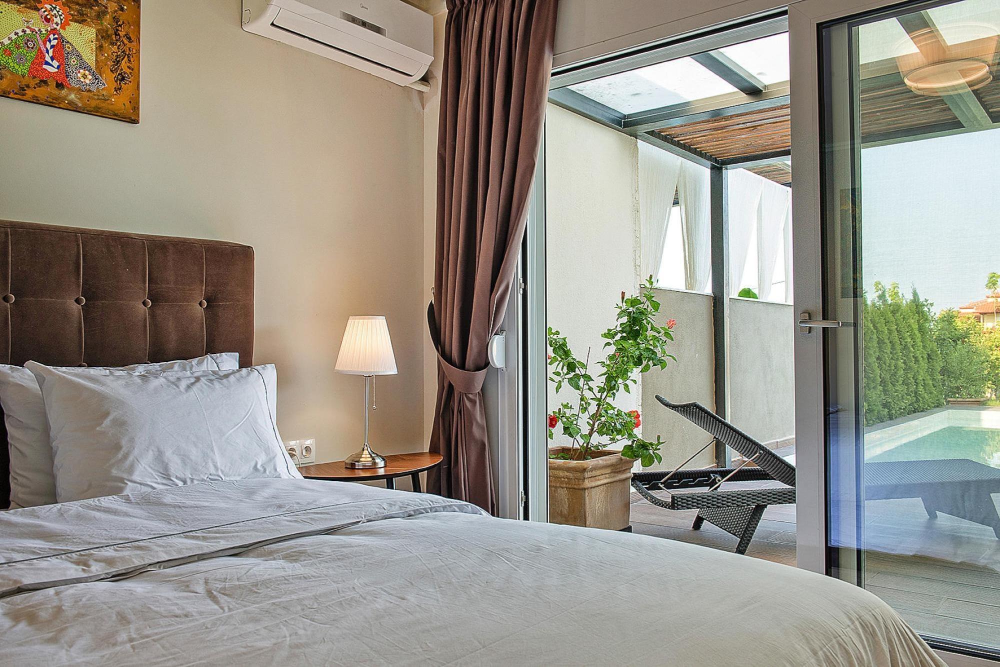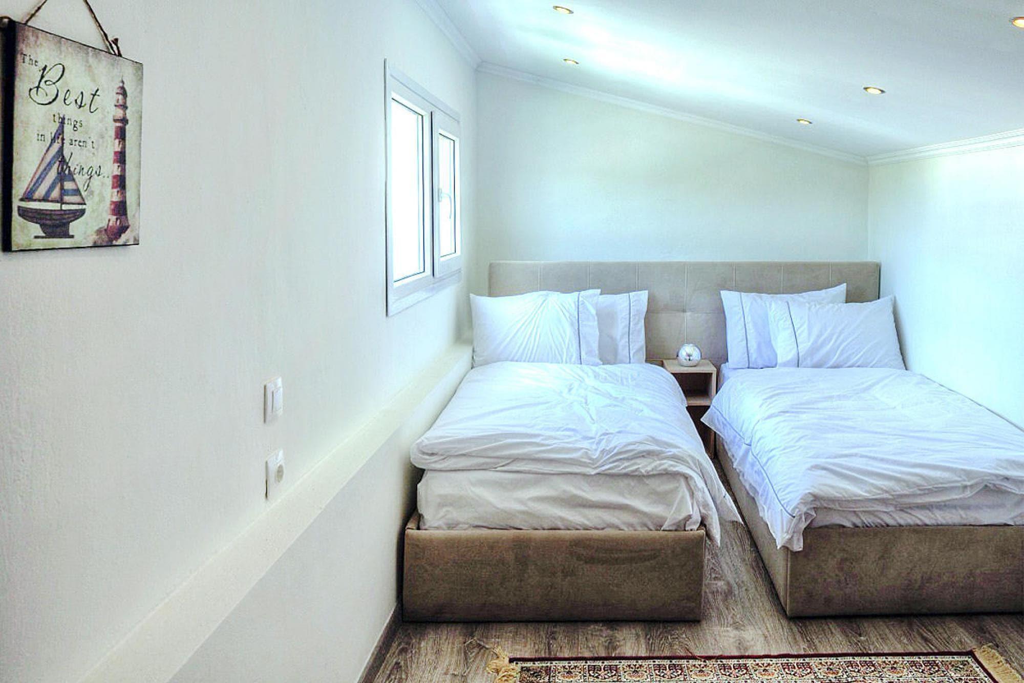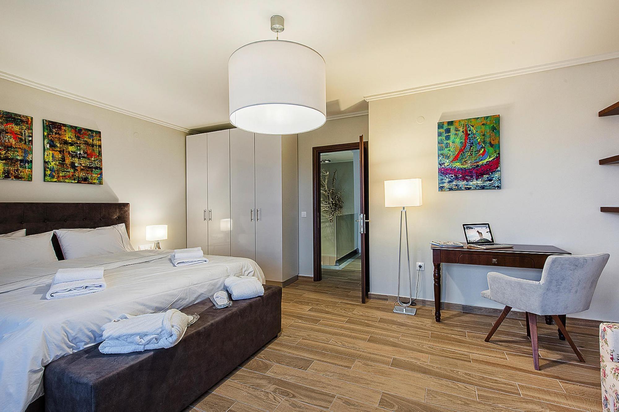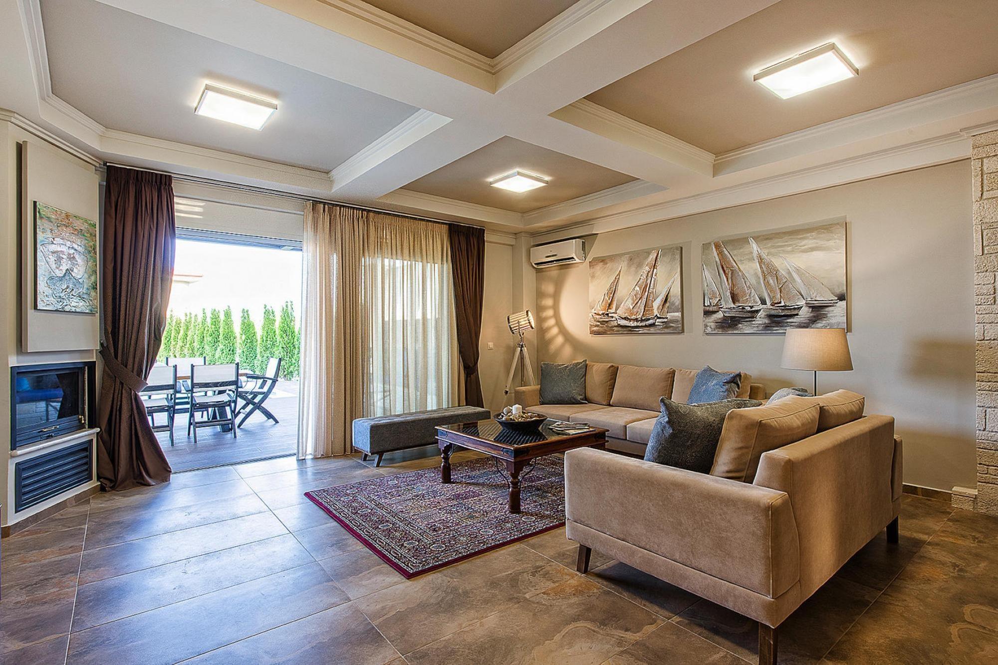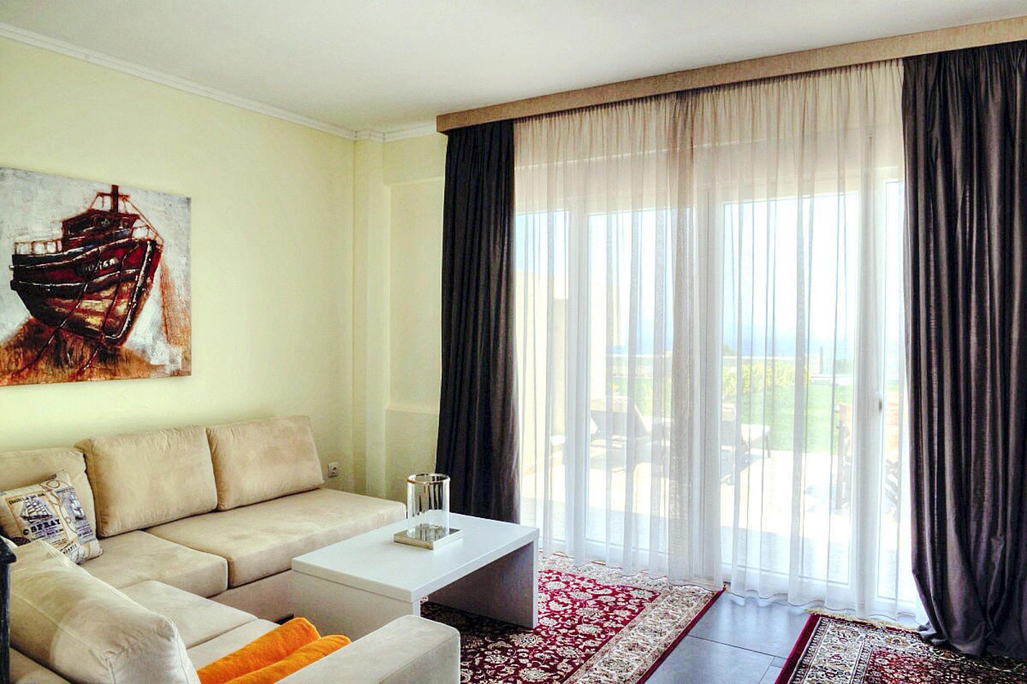 Luksuriøst villakompleks på en imponerende bjergskråning over Chanioti med en vidunderlig udsigt over det blå hav og den modsatte halvø Sithonia. De otte smagfuldt og komfortabelt indrettede feriehuse (bygget i 2014) har hver en velholdt have med en møbleret terrasse og en privat swimmingpool med hydromassage. Her kan du slappe af med en kølig drink og nyde fantastiske solopgange. Et resorts egen SPA med indendørs pool, sauna og fitnessrum er gratis til rådighed for dig. Forskellige wellness-behandlinger kan benyttes mod betaling. Den livlige turistby Chanioti med sin lange sandstrand og smukke promenade ligger omkring 1 km væk. Her finder du et godt udvalg af taverner, caféer, barer og butikker. opvarmet pool for 50 euro om dagen. Tjenester inkluderet: velkomstpakke TRÅDLØS INTERNETADGANG Regelmæssig shuttlebus til stranden og byens centrum Energiomkostninger, sengelinned, håndklæder, slutrengøring Mobilitet: Ikke egnet til personer med nedsat mobilitet