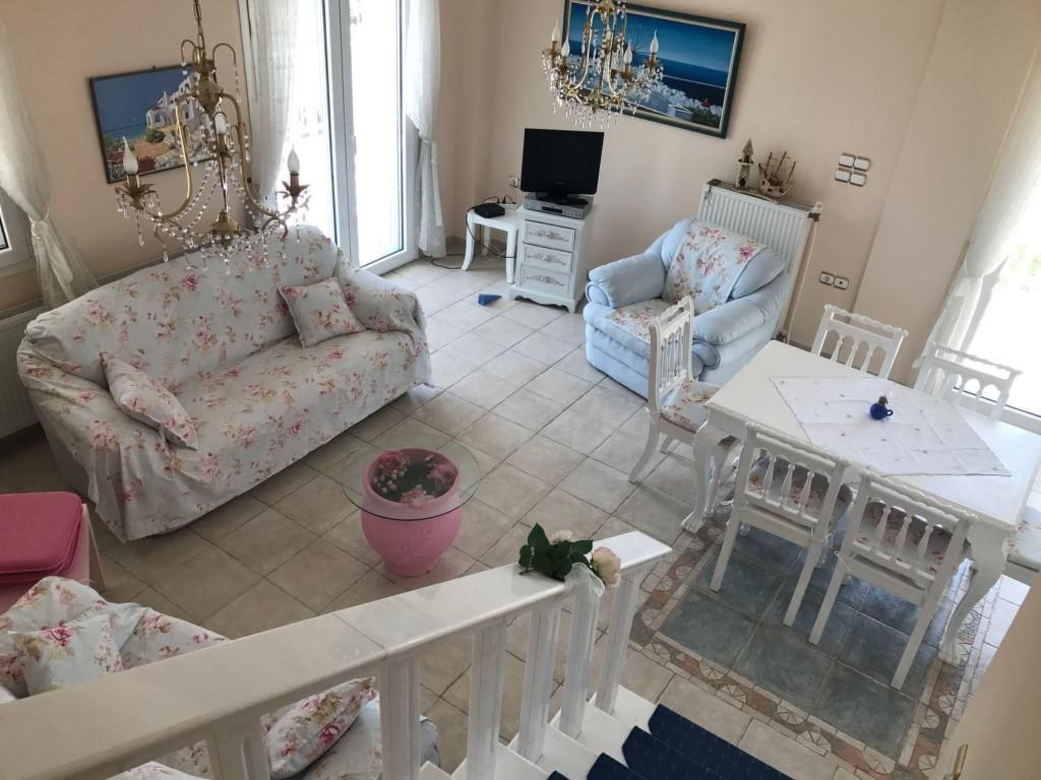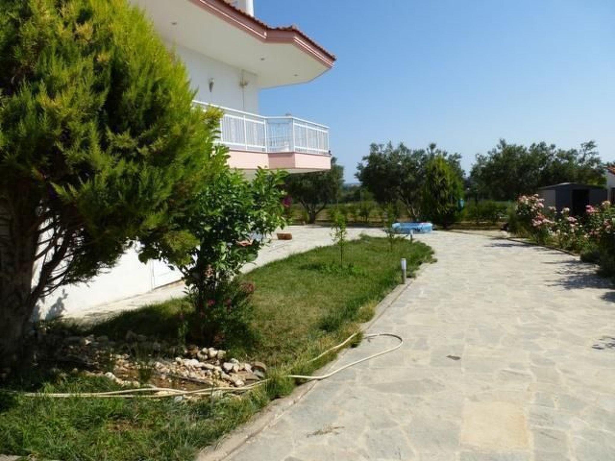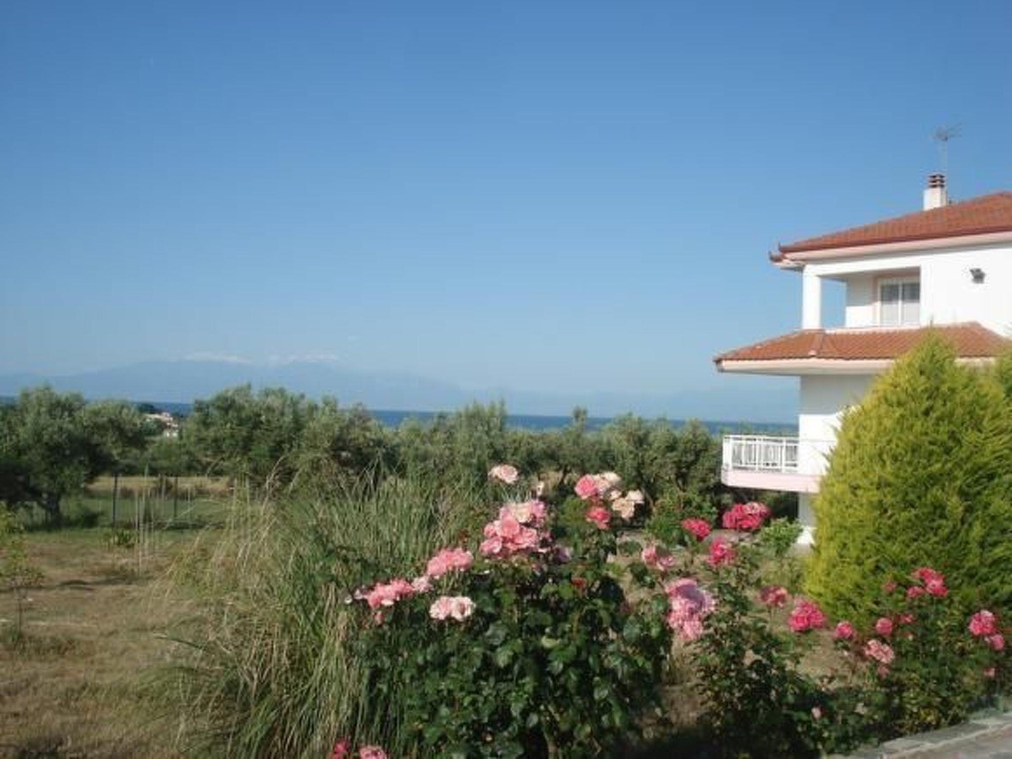 The beach is about 700-800 metres away. It is ten minutes to a bus stop. It is not absolutely essential to hire a car, but it is recommended. The famous holiday town of Chalkidiki is about 30 minutes away by car. Places of interest nearby are the historical town of Thessaloniki (old town, Agora, White Tower) and in the Chalkidiki area the Petralona cave and Afytos. You can combine visiting sights and swimming in the sea on your holiday. The town of Thessaloniki is also accessible on a lovely boat trip. There is a water park for entertainment in the area and there is a well-known shopping centre.