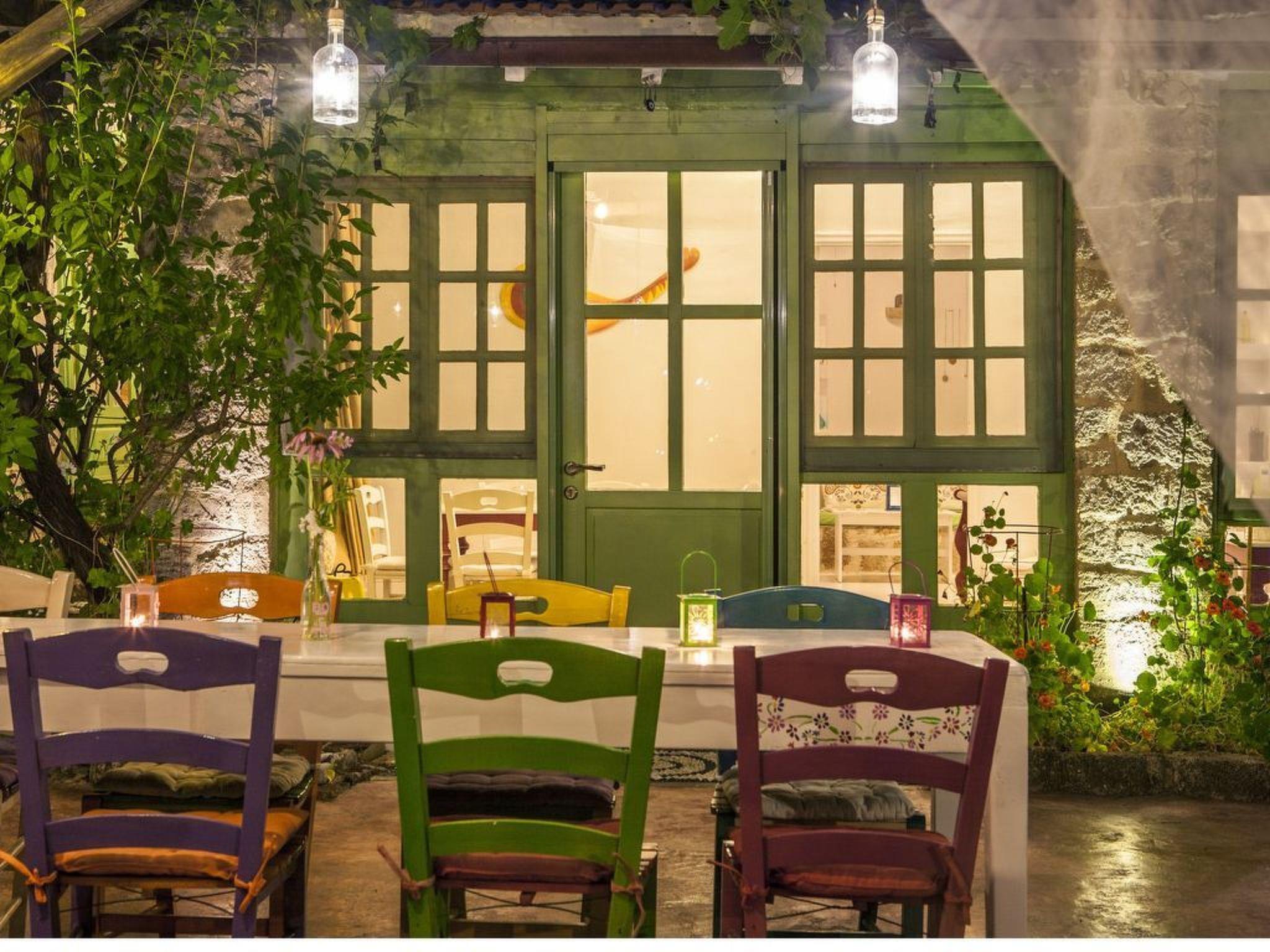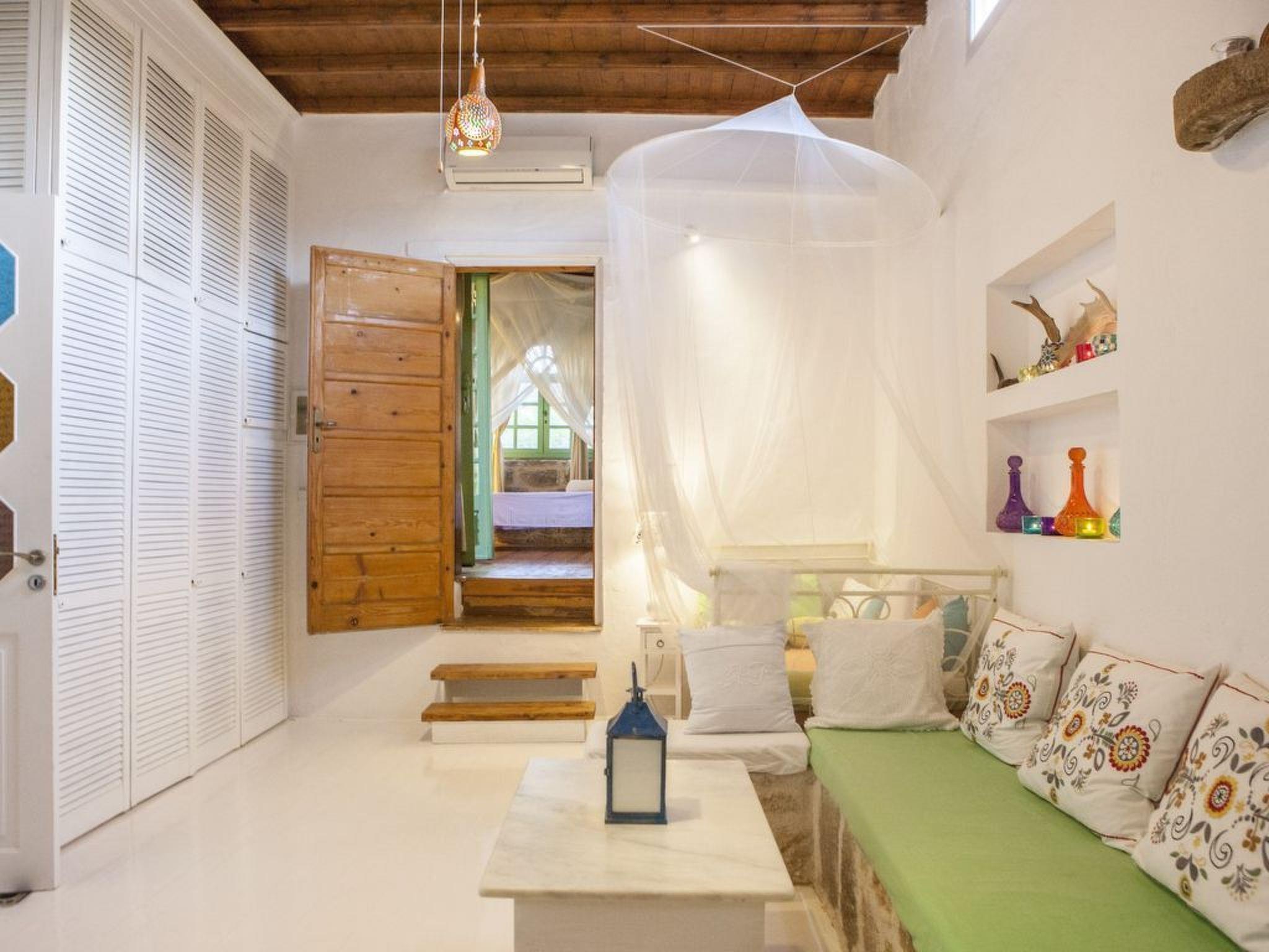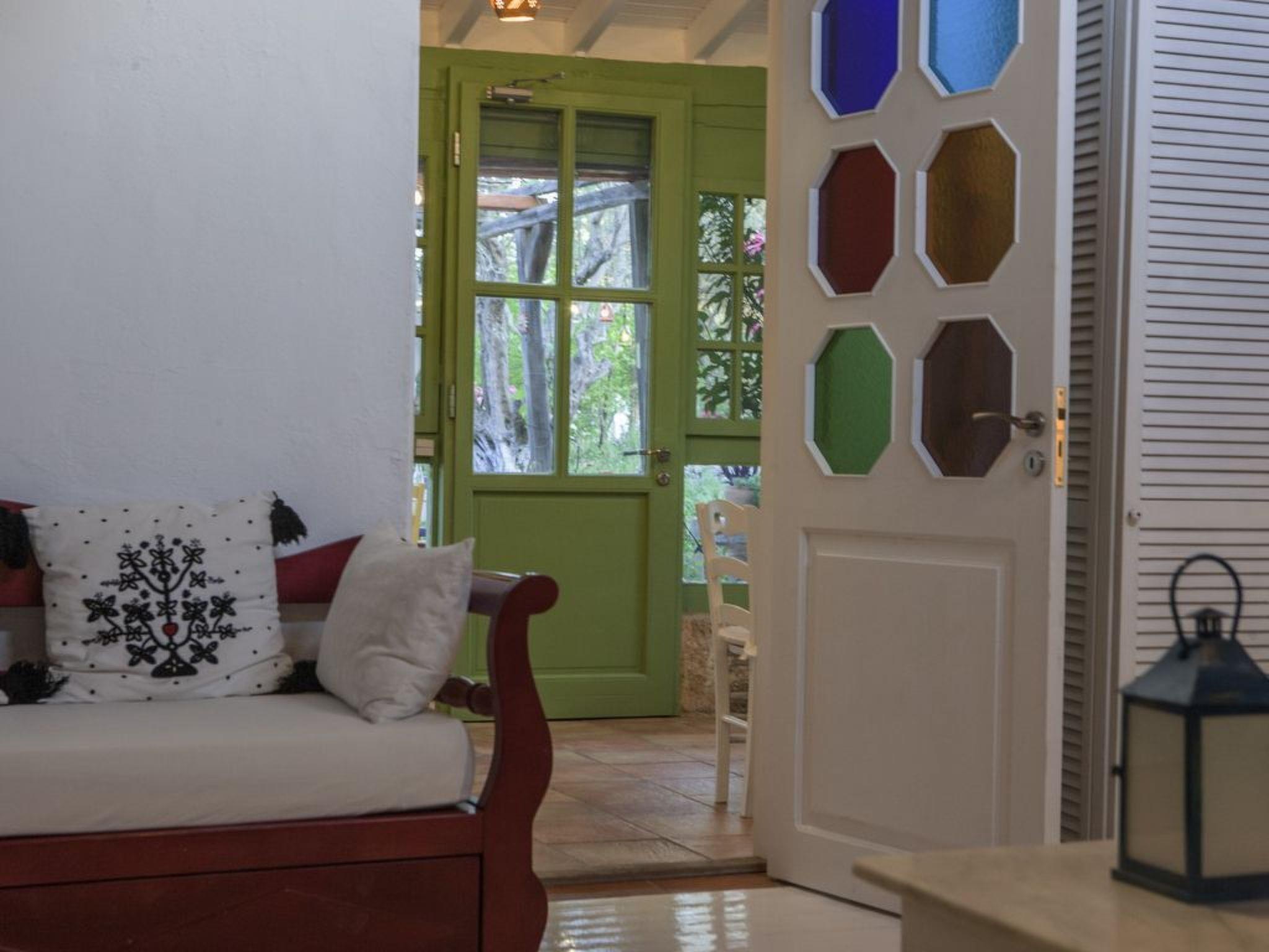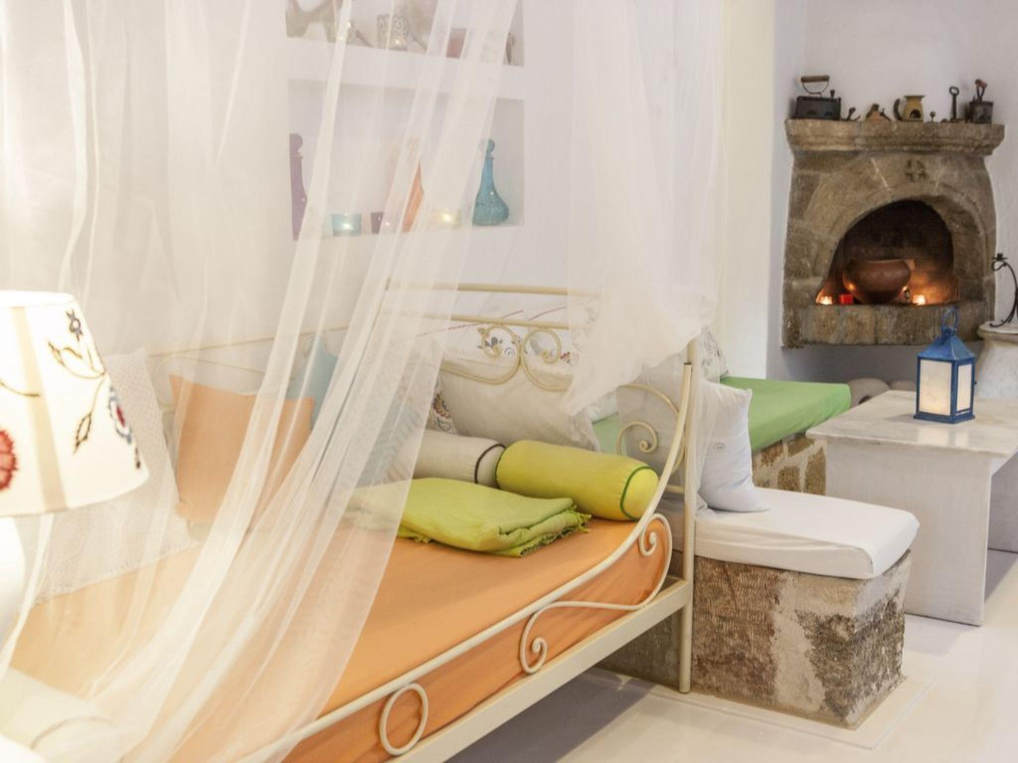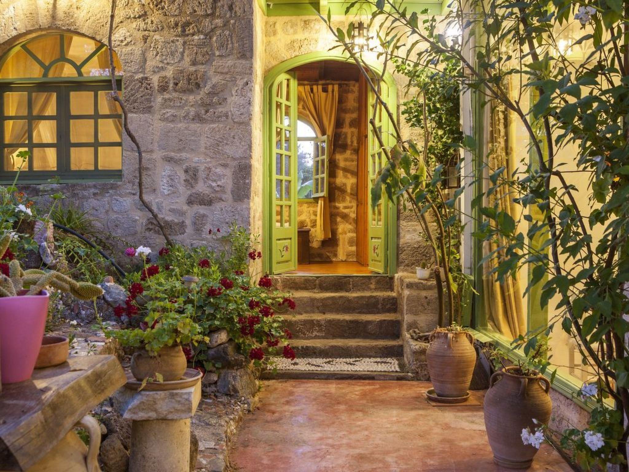 The house is a wonderfully designed stone built house, set in a big olive yard. The style of the house is that of a country house, with rustic olive green wooden doors. Inside guests will find a separate bedroom and another area in the second living room. Both of these rooms have two double beds as well as fire places. Guests can also enjoy fantastic views from all the windows. Further there is a dining table for six and a computer table. There is an arch opening to the kitchen and the bathroom with shower. The kitchen is fully equipped and spacious.