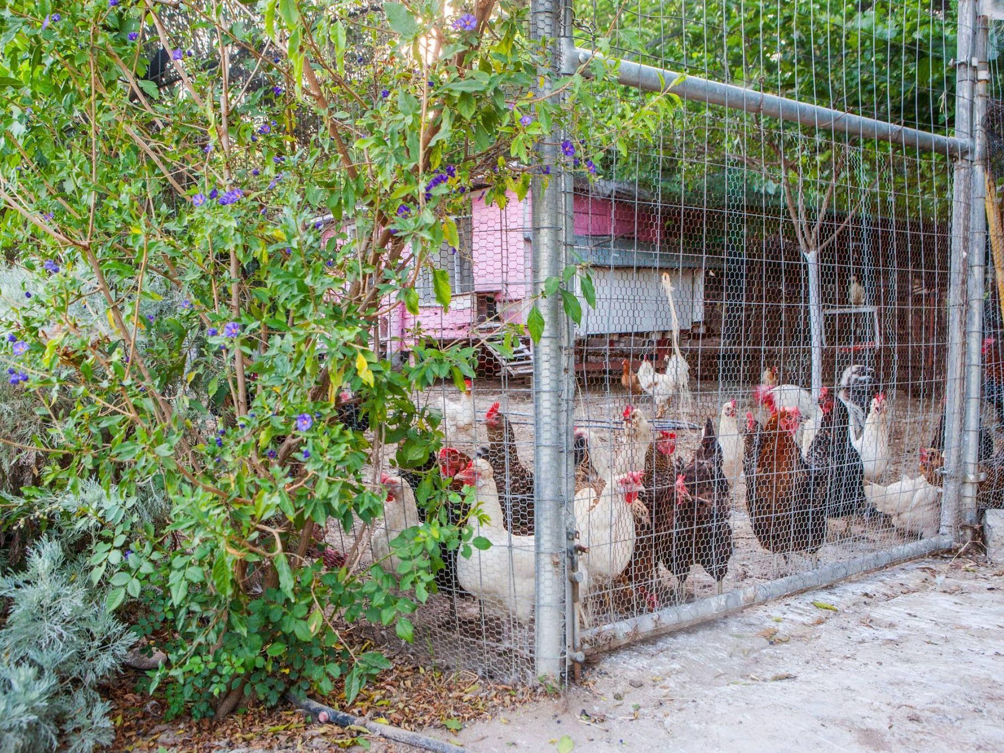 There is a coop with chickens - you can help yourself to fresh eggs. The owner comes to feed the chickens and water the plants.