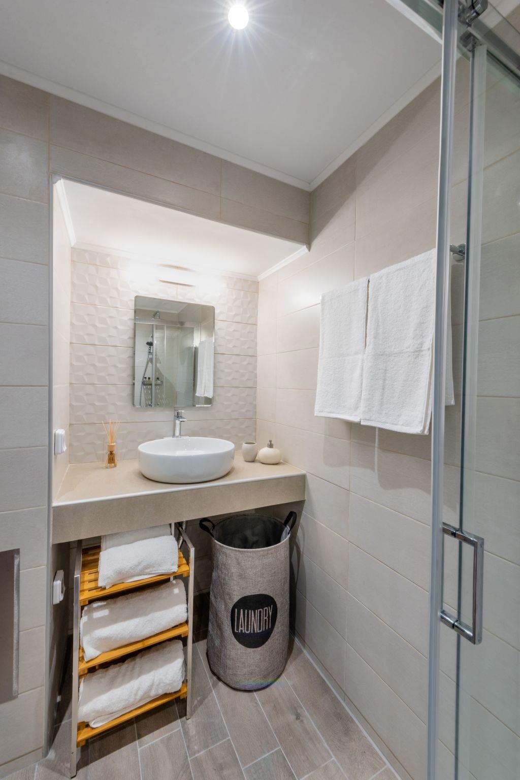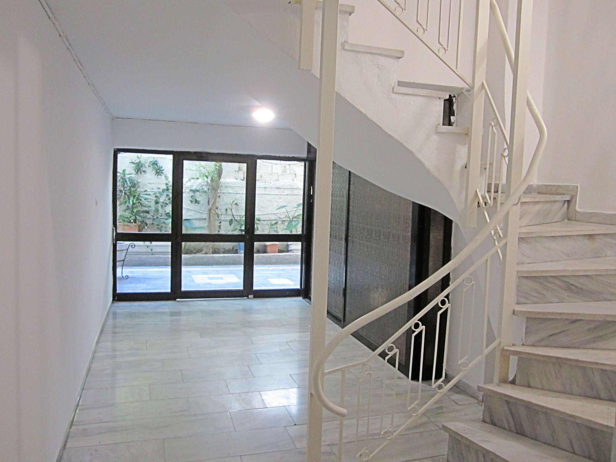 The apartment it is located on the entresol of the building. It is consisted of four main spaces, the bedroom, the living room, the kitchen and the bathroom.