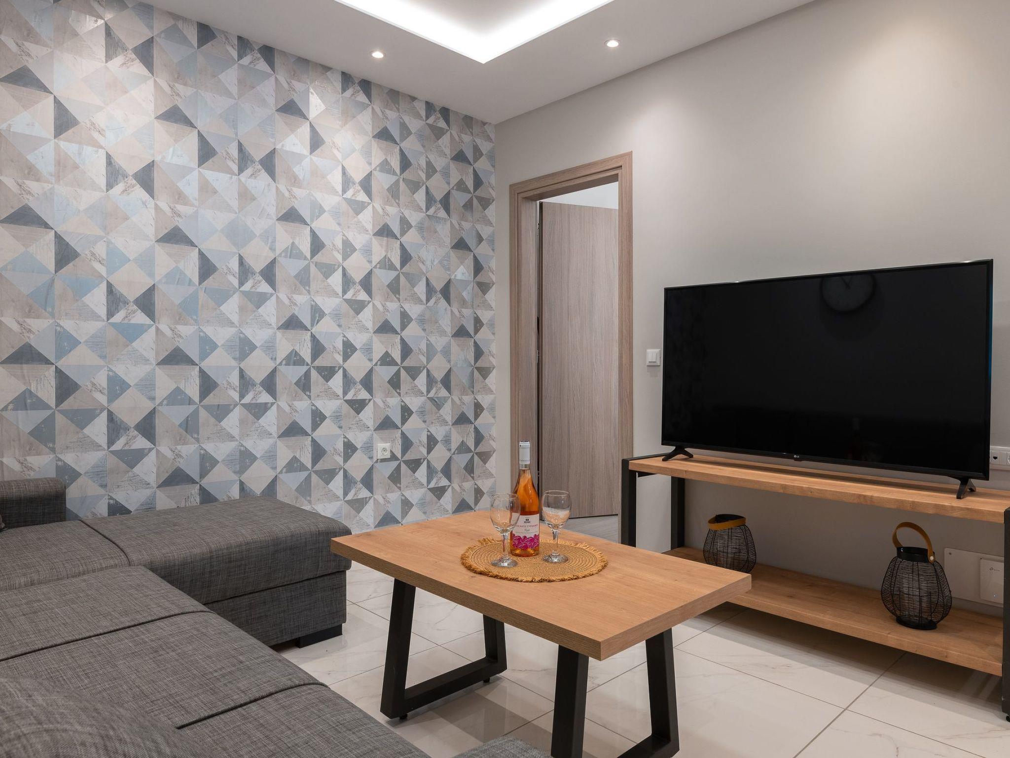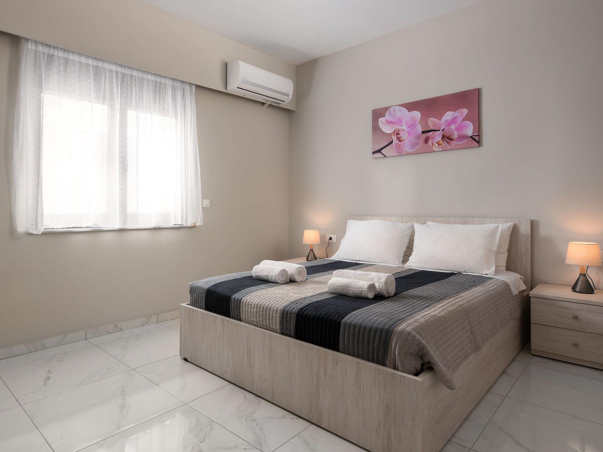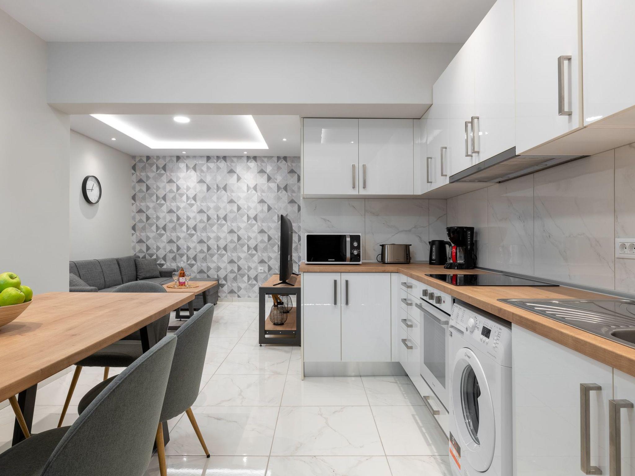 Inside, the Artemis apartment spans 80 square meters of carefully arranged space to host up to 6 guests without compromising comfort. The interior features a thoughtful layout comprising a master bedroom and a smaller bedroom, complemented by a sofa bed to accommodate additional guests. This setup provides ample room for everyone in your party. The apartment is fully equipped to cater to all your needs, ensuring a hassle-free stay. Its air-conditioned rooms guarantee cool relief from the warm Greek sun, while the inclusion of a washing machine for personal use adds a touch of home-like convenience. Mornings are made easier with the provided filter coffee machine and electric kettle, ensuring your day starts off right.