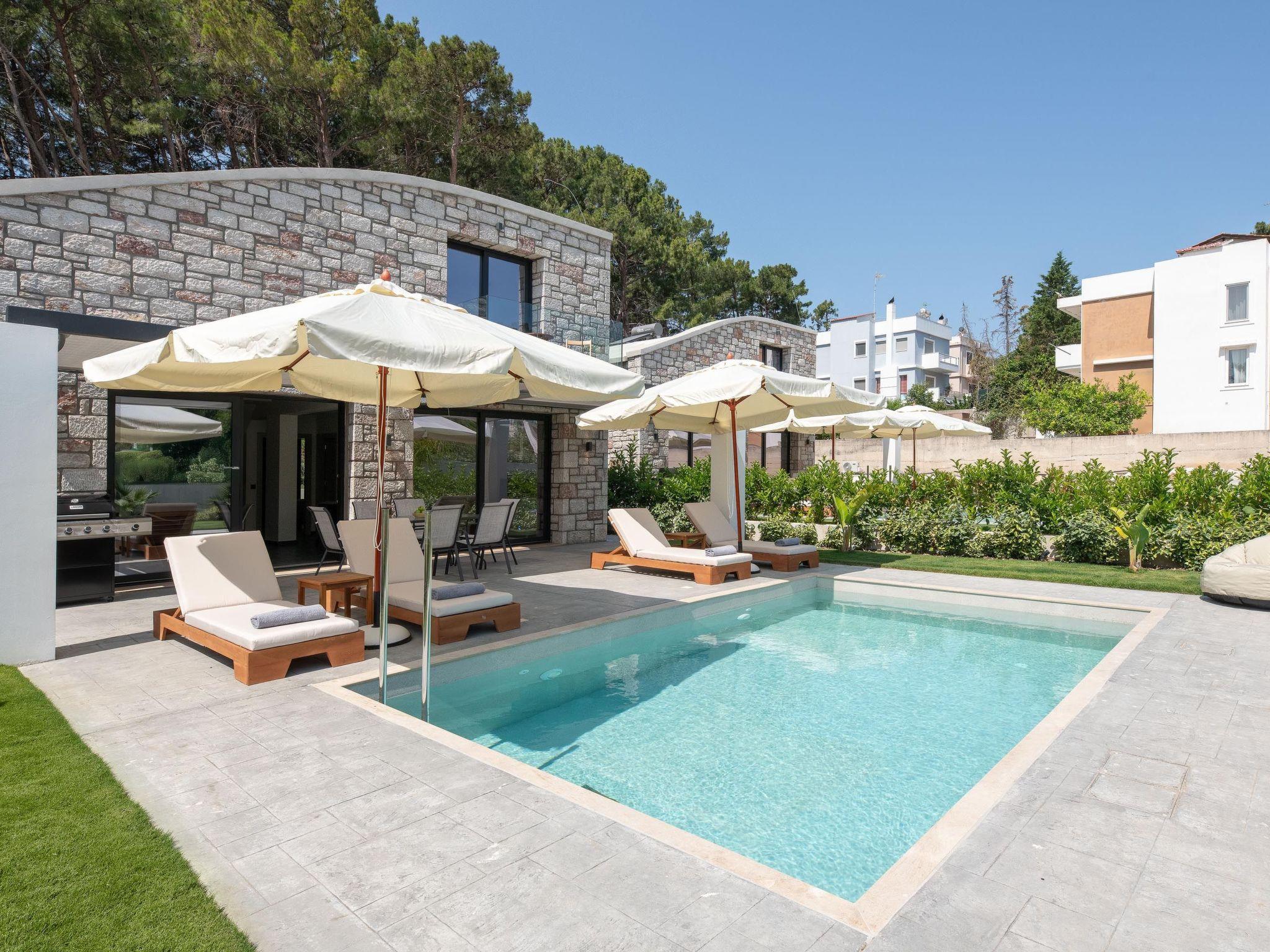 Rokas Luxury Villas are elegant, fully equipped accommodations located in the serene area of Sgourou, just a short drive from Rhodes Town. Each villa comfortably hosts up to 7 guests and features three stylish bedrooms—one with a double bed and two with twin single beds—making them perfect for families or groups. An additional single sofa bed is available in the living room for extra flexibility. The villas include two modern bathrooms with showers, one of which is en-suite to the master bedroom, offering added privacy and comfort. The fully equipped kitchen provides everything needed for a self-catered stay, whether you're preparing a quick breakfast or a full meal. Outside, each villa boasts a private swimming pool surrounded by sunbeds, a shaded pergola for lounging, and a built-in BBQ with a dining area—ideal for enjoying meals al fresco. Rokas Luxury Villas combine comfort, style, and convenience for a truly relaxing escape.