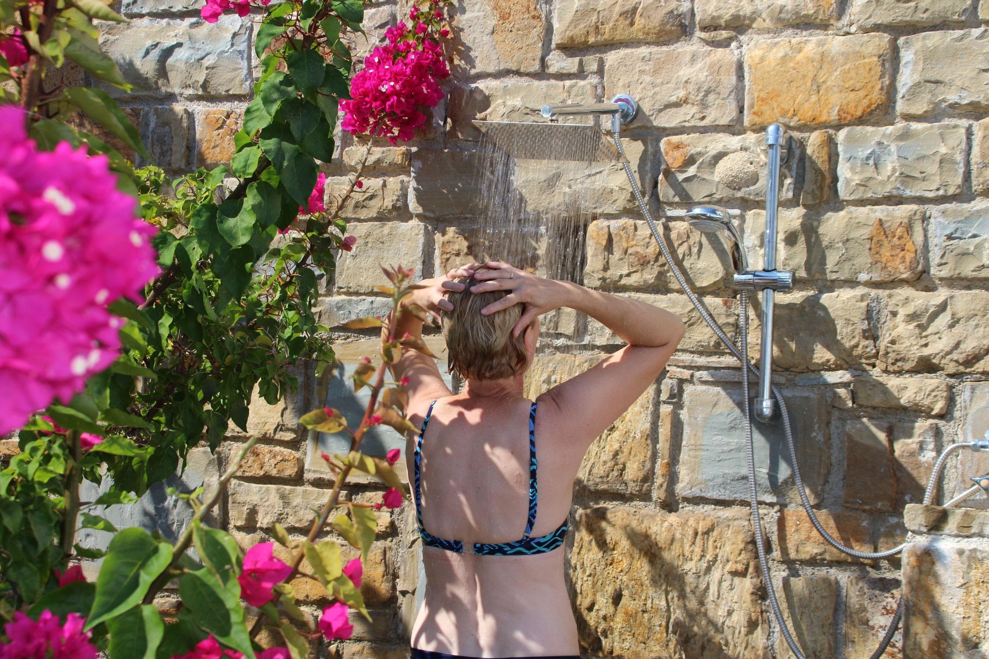 In dem großen mediterranen Garten wachsen Oliven, Apfelsinen, Zitronen, Mandarinen, Feigen und Granatäpfel. Der Garten ist im naturzustand, daher betreten auf eigene Gefahr. Die große Terrasse bietet einen Postkartenblick auf Berge und Meer und vor der Küche ist noch ein Außensitzplatz unter einem Olivenbaum, vom Weg getrennt durch Oleander. Darunter eine Außendusche zwischen Bourgonvilleablüten und Oleander als Sichtschutz. Hier gib es auch warmes Wasser von der griechischen Sonne aus dem Solarkollektor oder dem Elektroboiler.