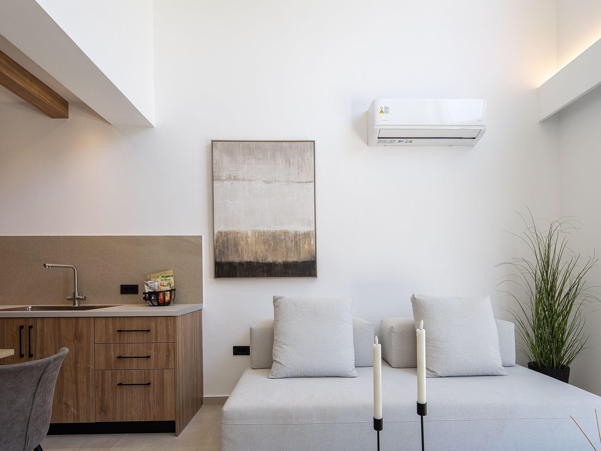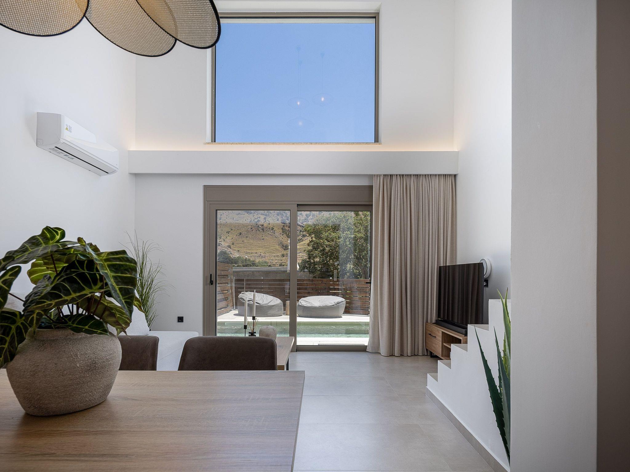 The villa spans approximately 80 sqm of indoor living space and 90sqm of outdoor area, making it ideal for groups or families. The villas feature a spacious open-plan living area, where guests can relax on a comfortable sofa while enjoying modern amenities such as a 50’’ Smart TV with satellite channels. Large sliding doors provide access to private terraces or the pool area, creating an easy flow between the indoor and outdoor spaces. The villa has a fully functional kitchen, allowing guests to prepare meals with ease, and the dining area offers a welcoming space for shared meals. An extra guest can be accommodated on the sofa in the living area upon request at an extra cost. The sofa is comfortable for both adults and children as the size is 1.10*2.20m.
