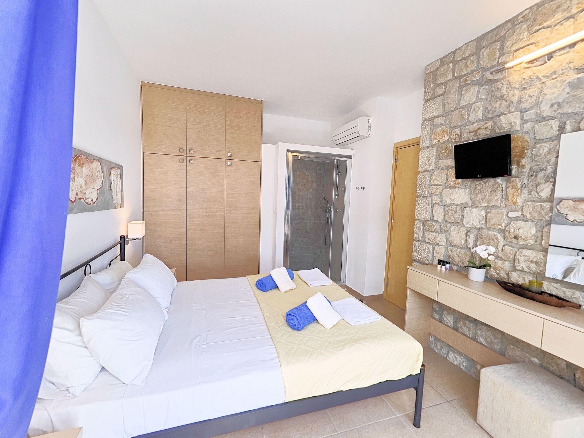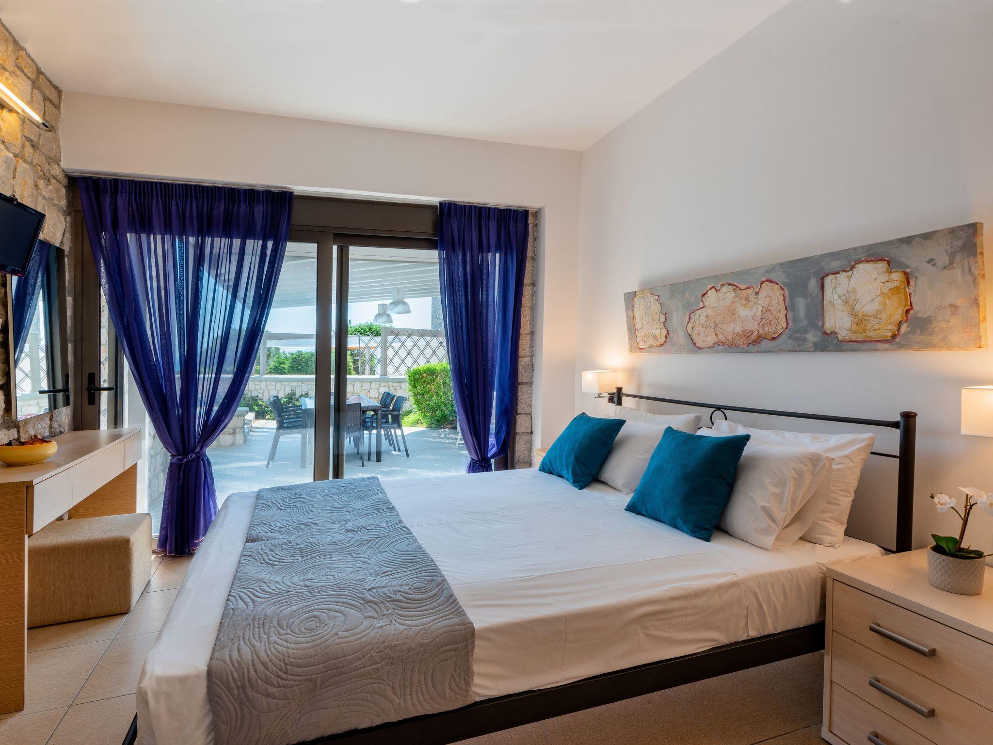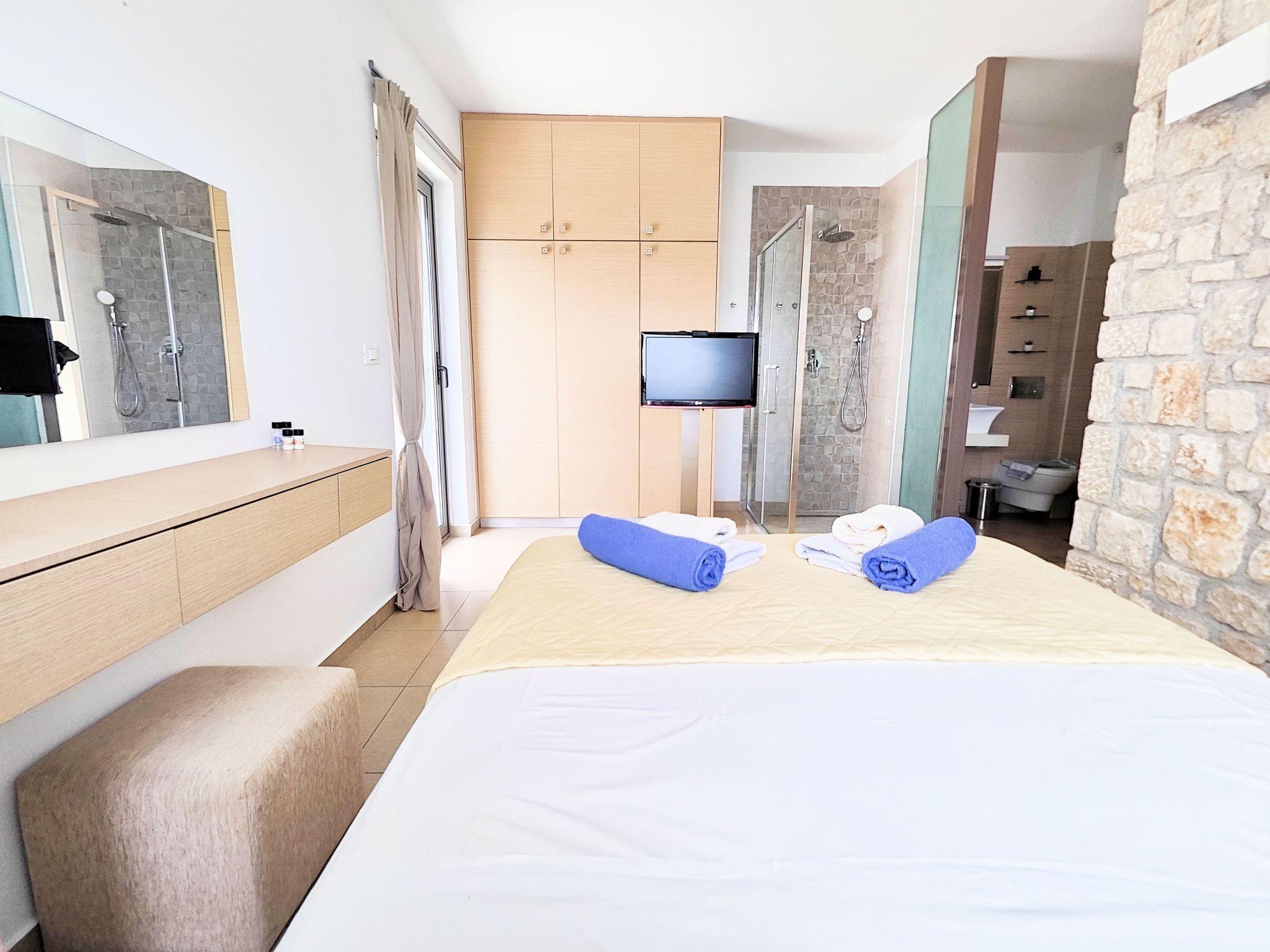 Master-Bedroom 1 with Double bed, hydromassage cabin – sauna, A/C, LCD HD TV set, safe deposit box, Patio doors, ground floor.