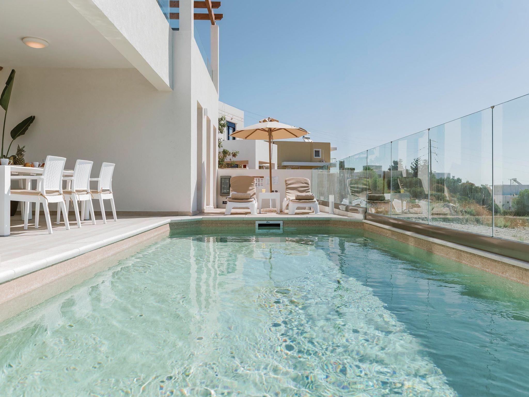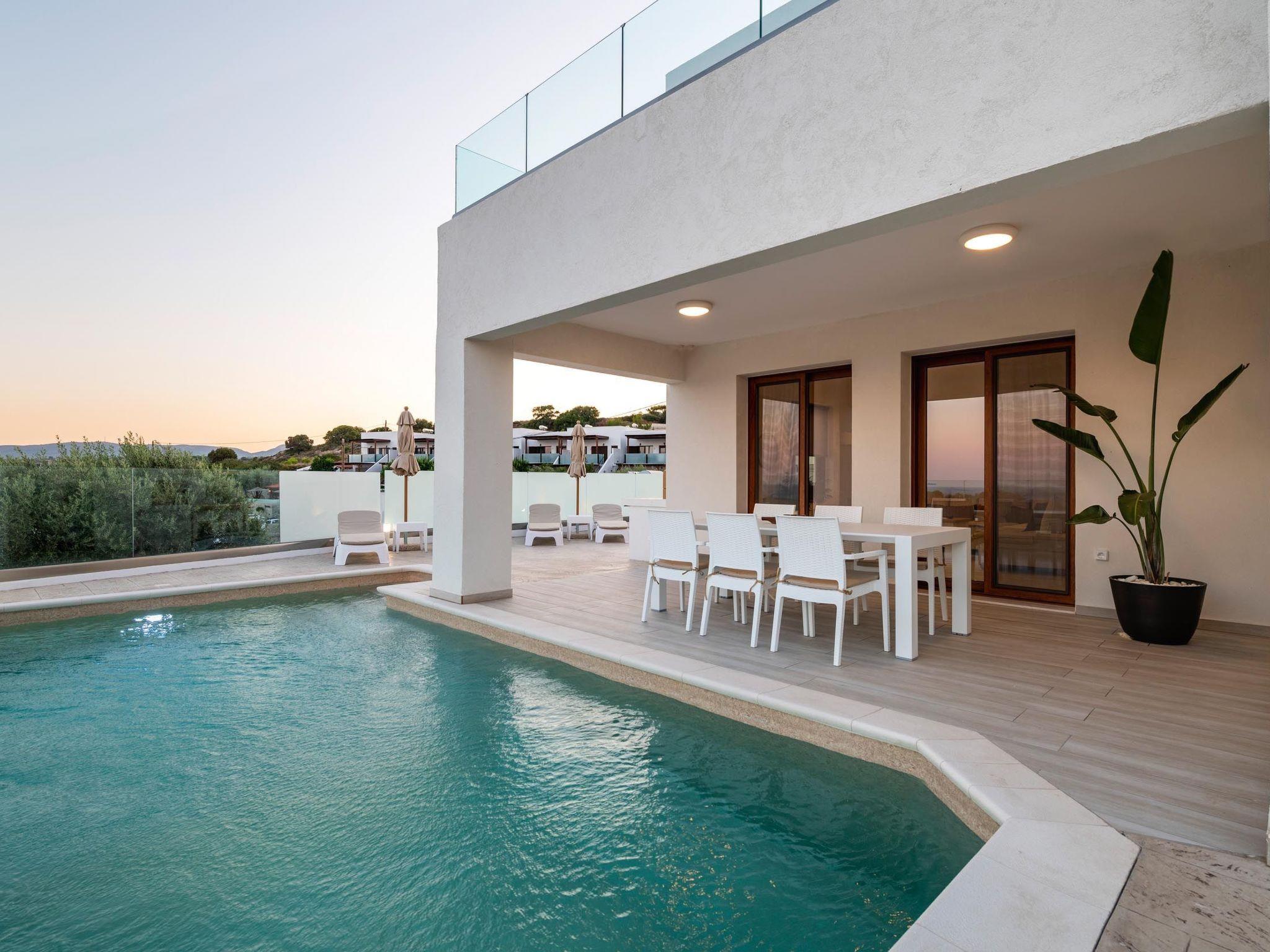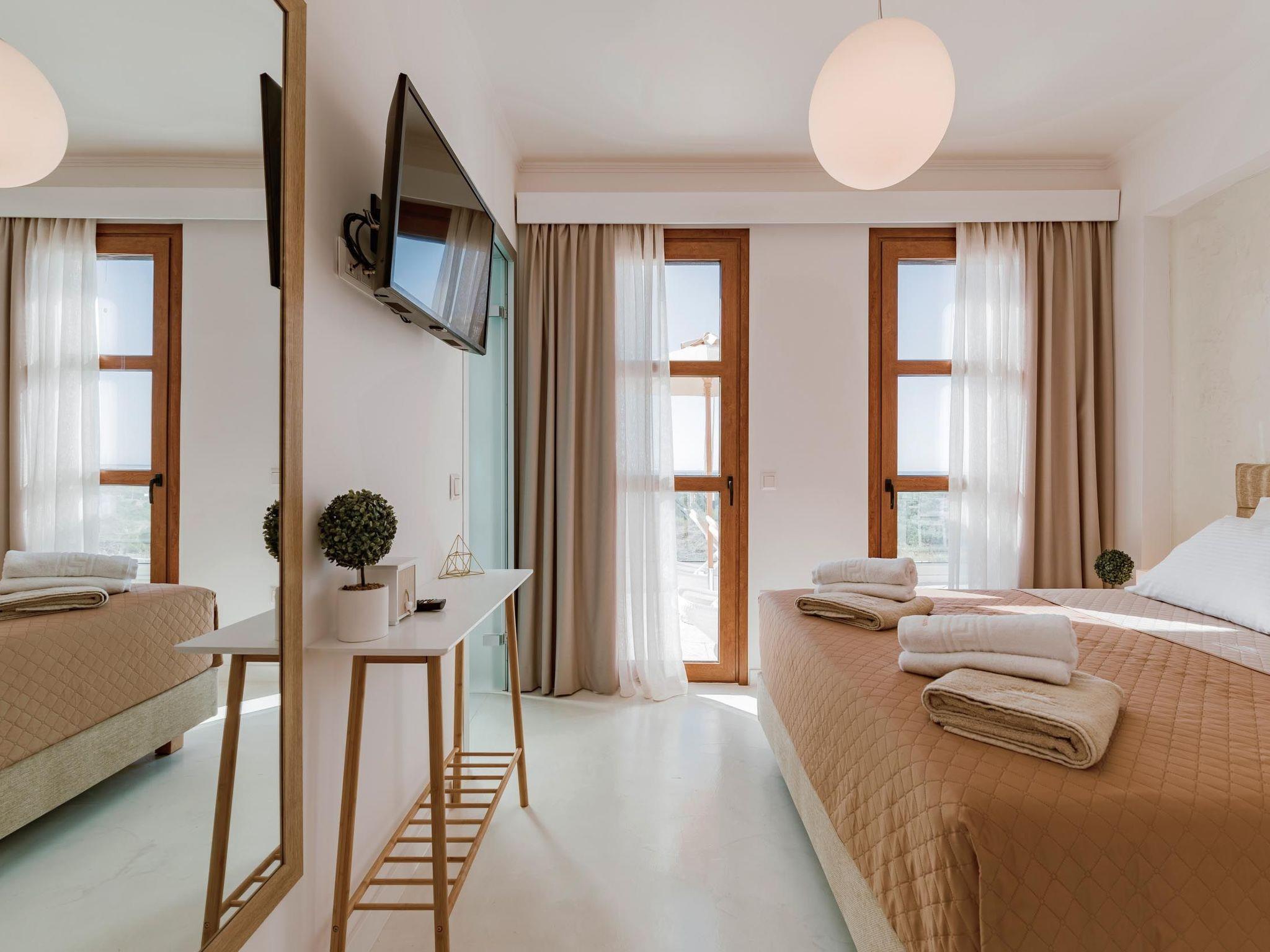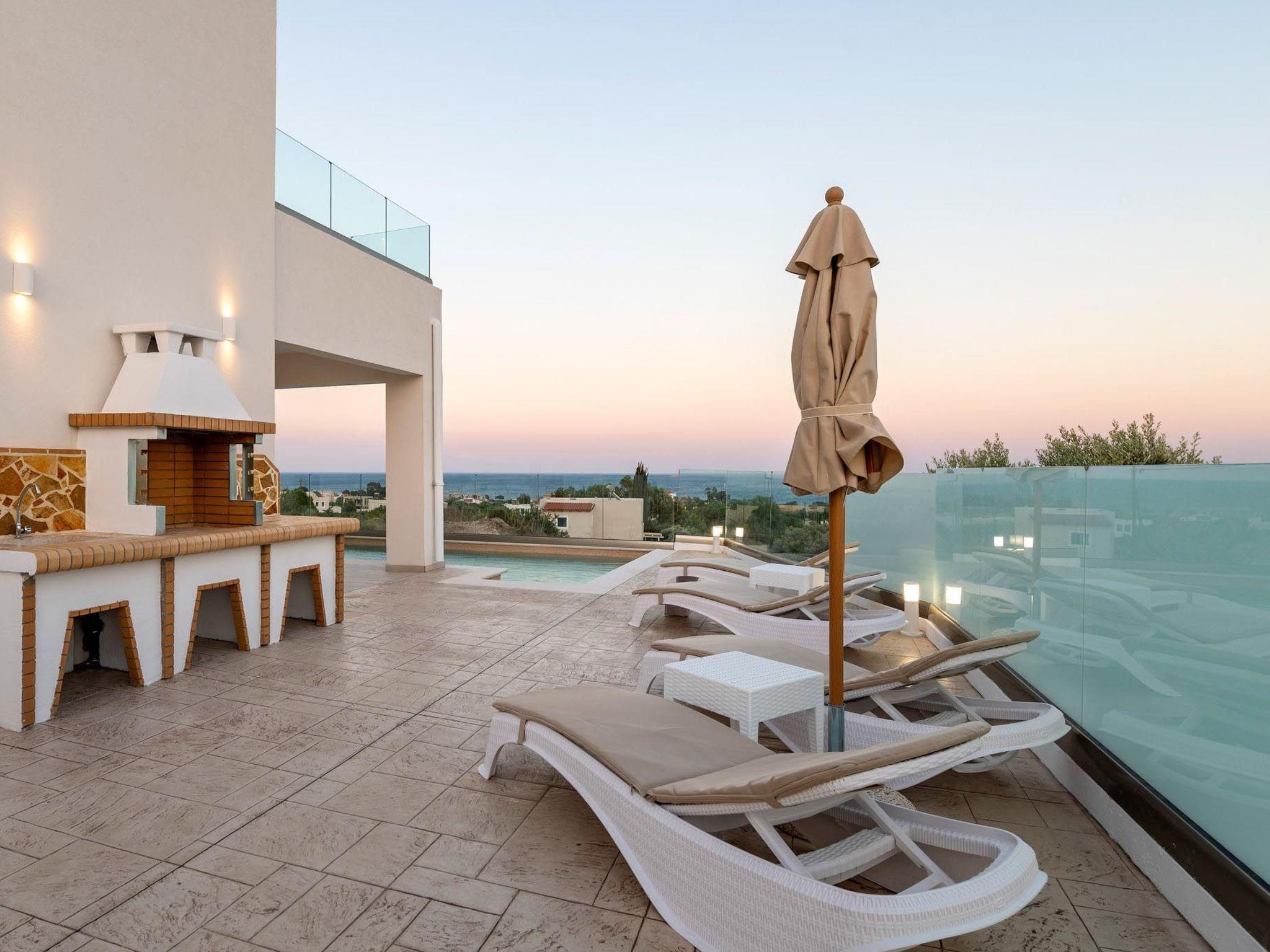 Oriens villa has 3 bedrooms, each of the modern bedrooms have a double bed. There are two bathrooms with shower; one of them is included to a bedroom. There’s an open plan kitchen, fully equipped with everything is needed for a meal preparation along with a sitting area. The living area is quite inviting with its warm colors and convenient furniture, along with its screen TV. Guests can enjoy free Wi-Fi access throughout the property. Outdoors, there’s the wonderful private swimming pool with its stylish sunbeds. Be ready to feel the ultimate relaxation while gazing the exquisite panoramic view to the beach. There are BBQ facilities with a sitting area allowing you to enjoy a gathering with your loved ones.
