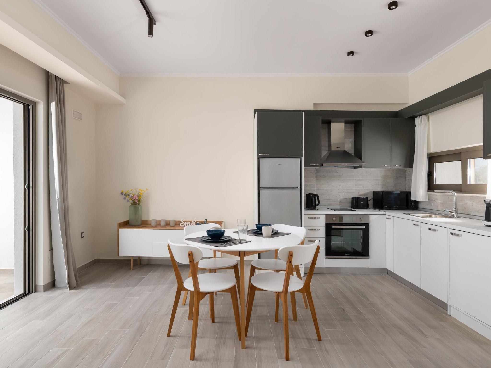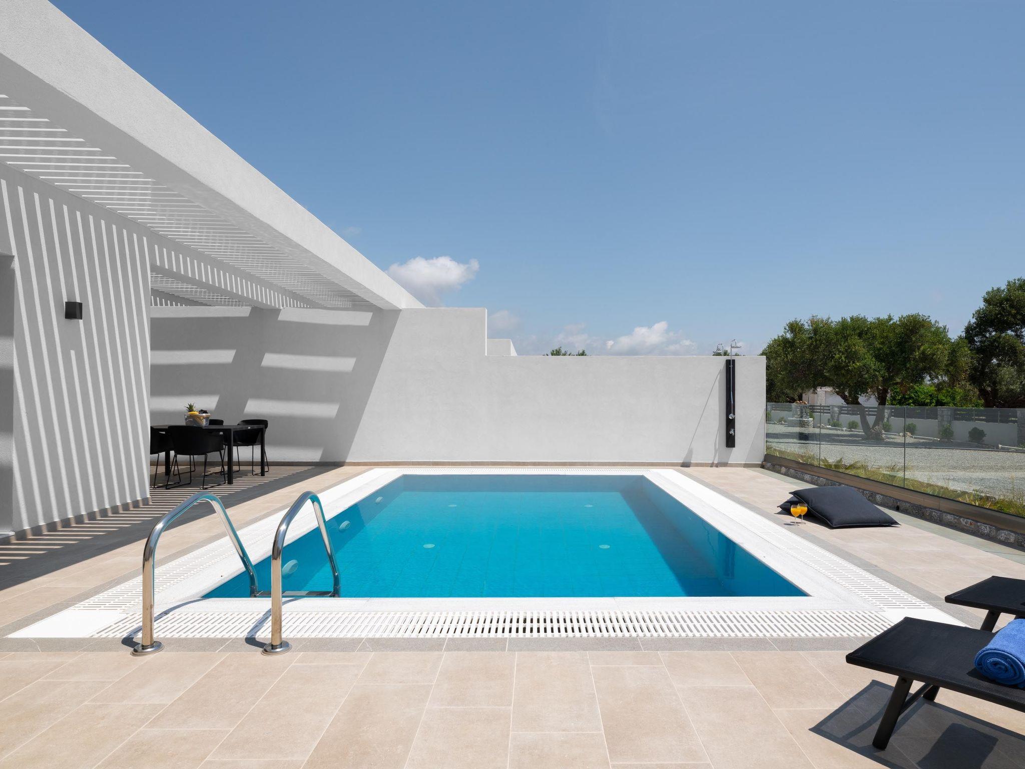 Facing on Armonia suites guests will find Eleni suite on the left side of the center suites of the property which can accommodate up to 3 people. The suite has one comfy bedroom with a spacious double bed and a sunny balcony. Also, the suite owns a modern sitting/living area with a cozy double sofa bed and a homey bathroom with a shower. The property provides a flat screen with satellite channels and free Wi-Fi. The minimal styled kitchen is fully equipped for any meal preparation of your choice. Guests can relax outside, in the wonderful furnished veranda next to the dreamy swimming pool. The private swimming pool is equipped with unique sunbeds and will offer you enjoyable moments under the Aegean sun.