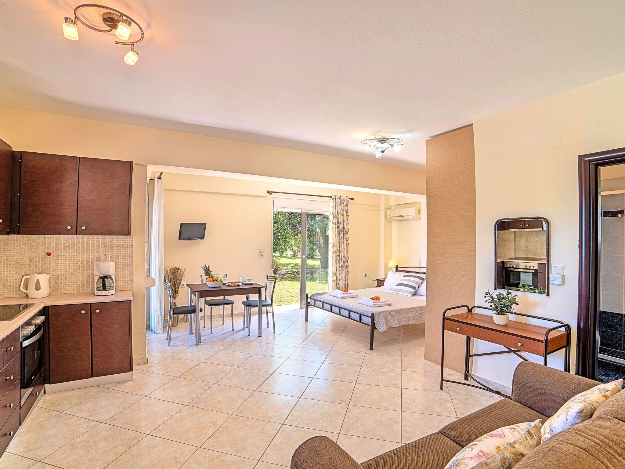 * A living-dining room with a sofa bed and direct access to the terrace and the pool area.