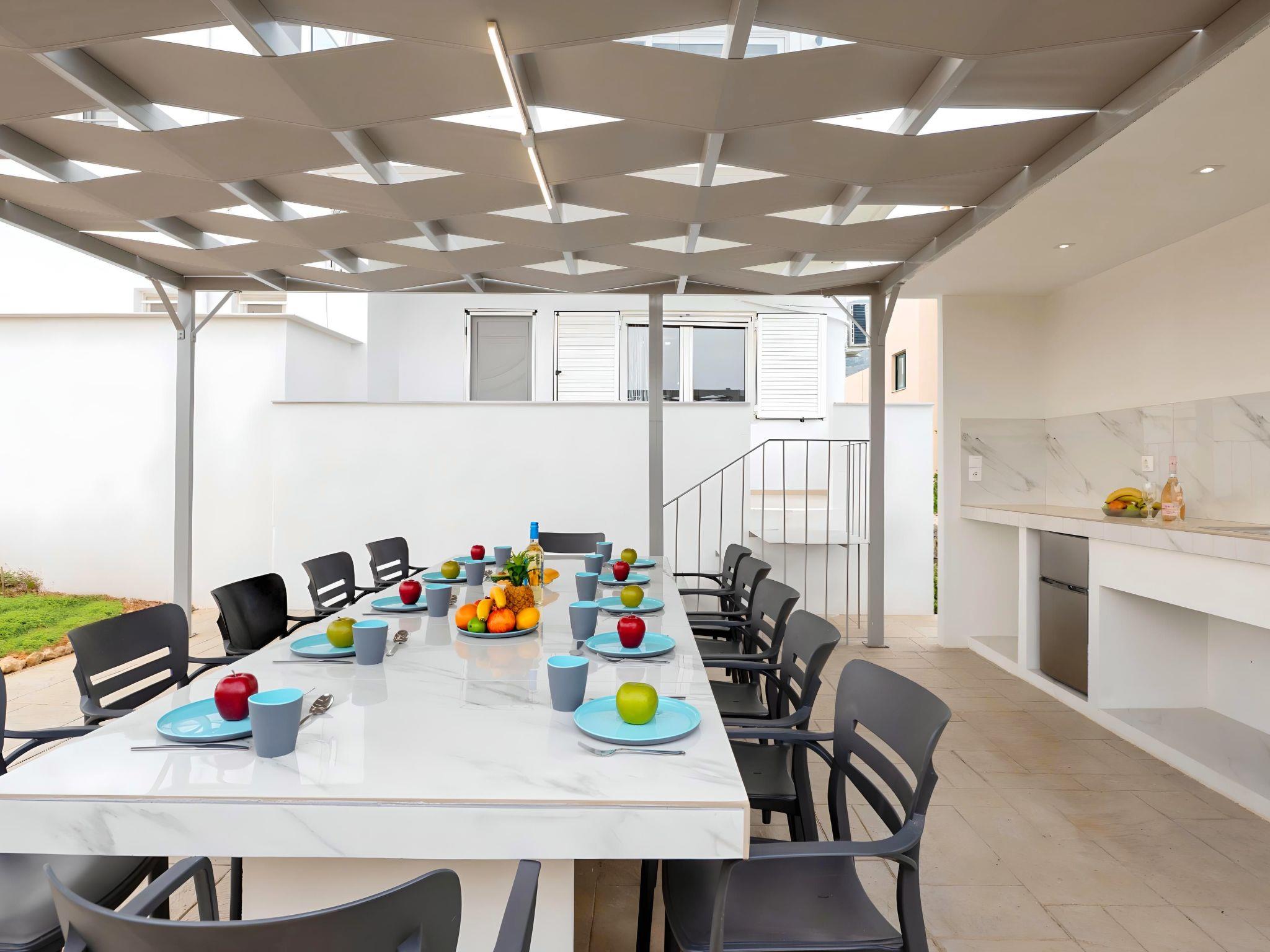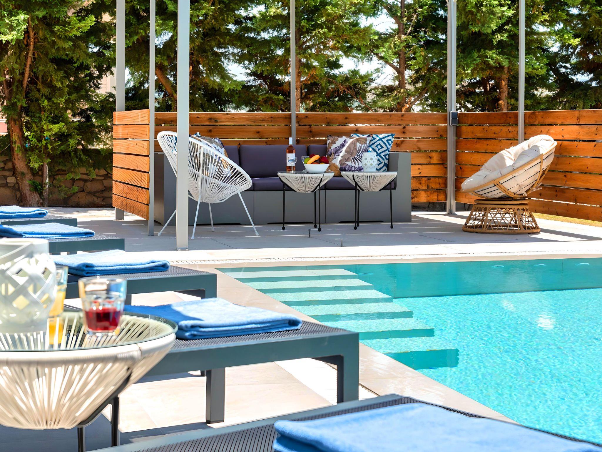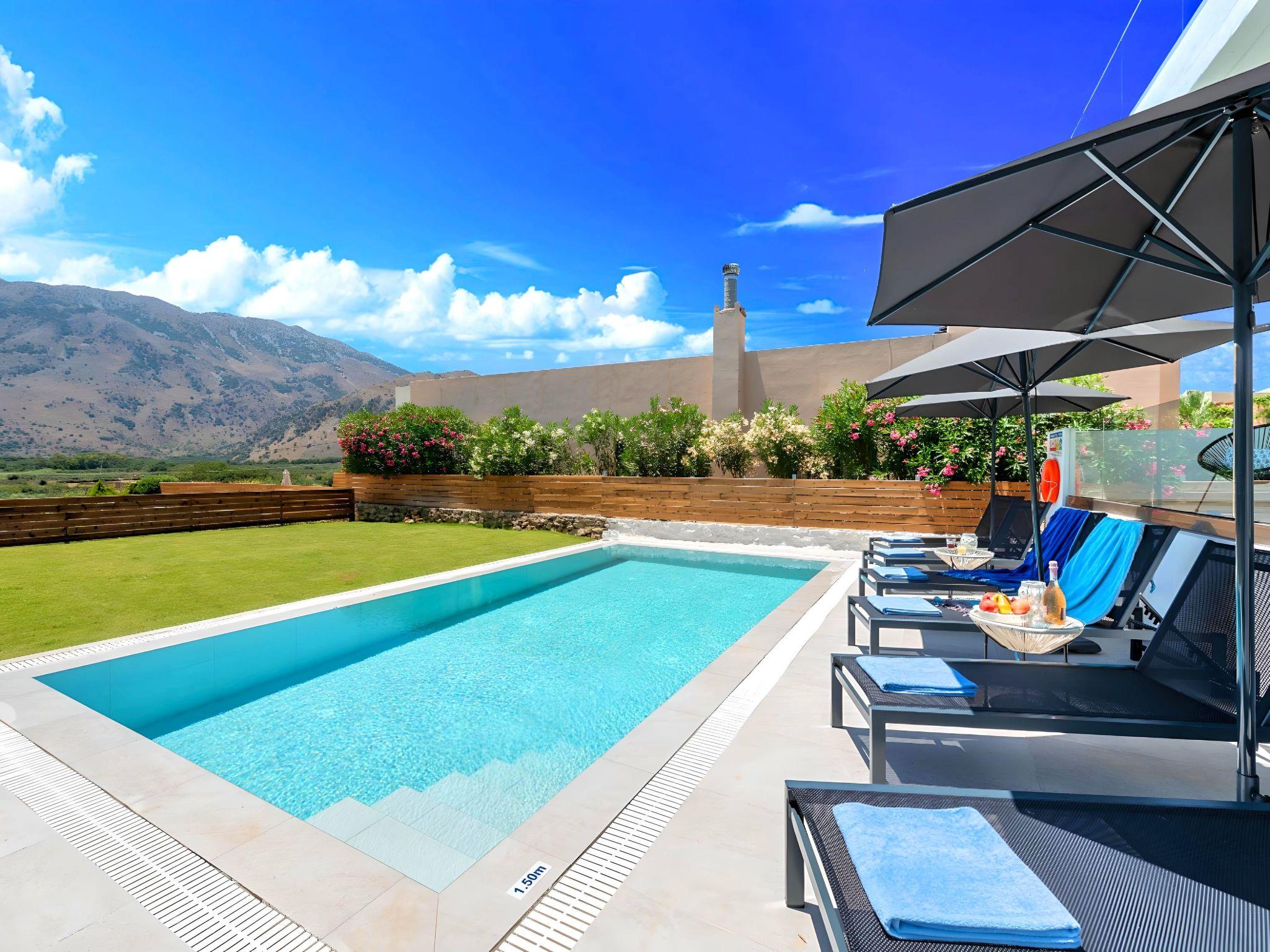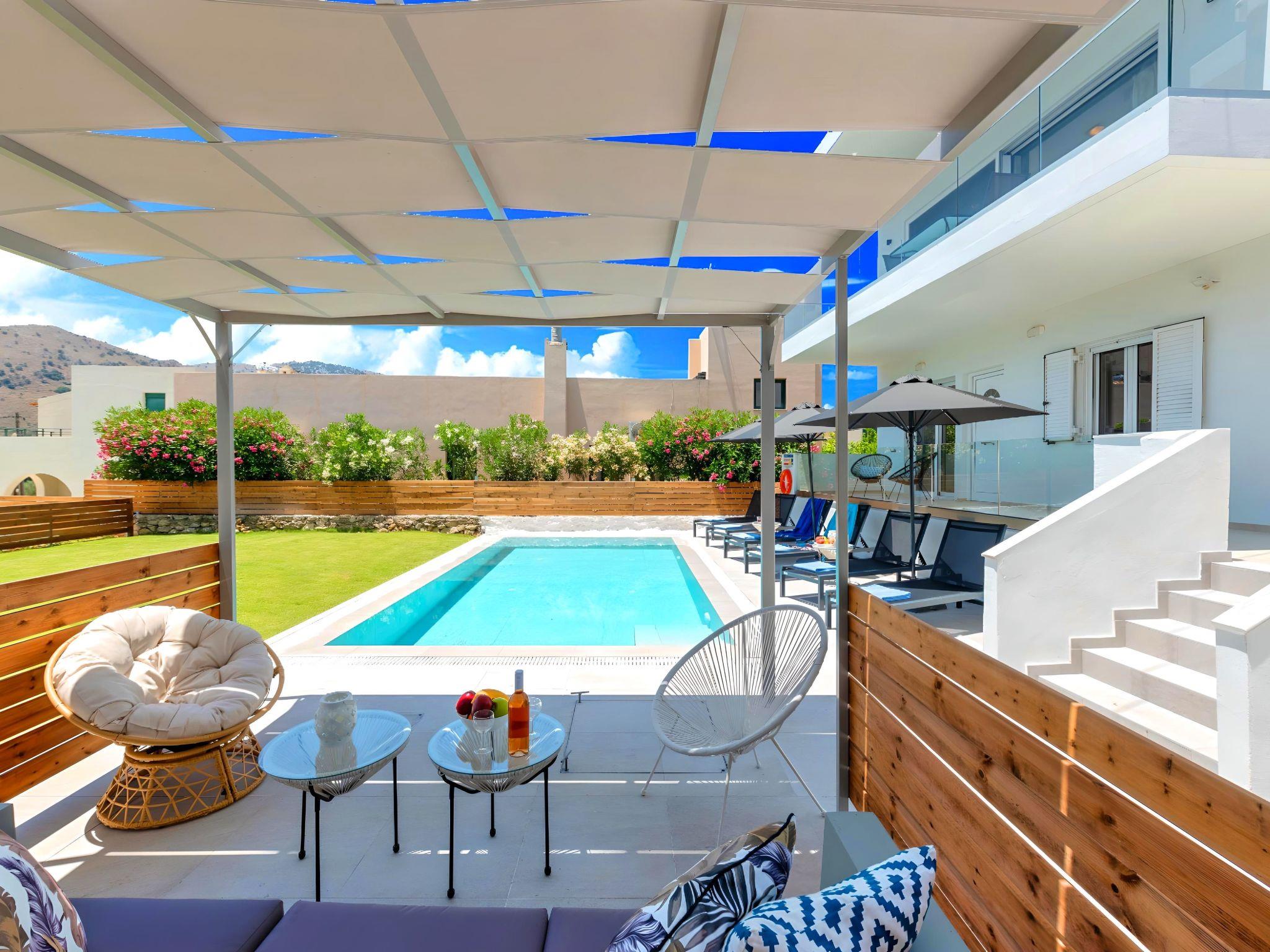 Outside, immerse yourself in the ultimate relaxation with a large swimming pool, perfect for a refreshing dip or leisurely swim. The sun terrace, adorned with comfortable sun loungers and umbrellas, invites you to bask in the warm Mediterranean sun. Enjoy your mornings with a cup of coffee or unwind in the evenings at the outdoor sitting area, ideal for savoring the gentle sea breeze and scenic views.
