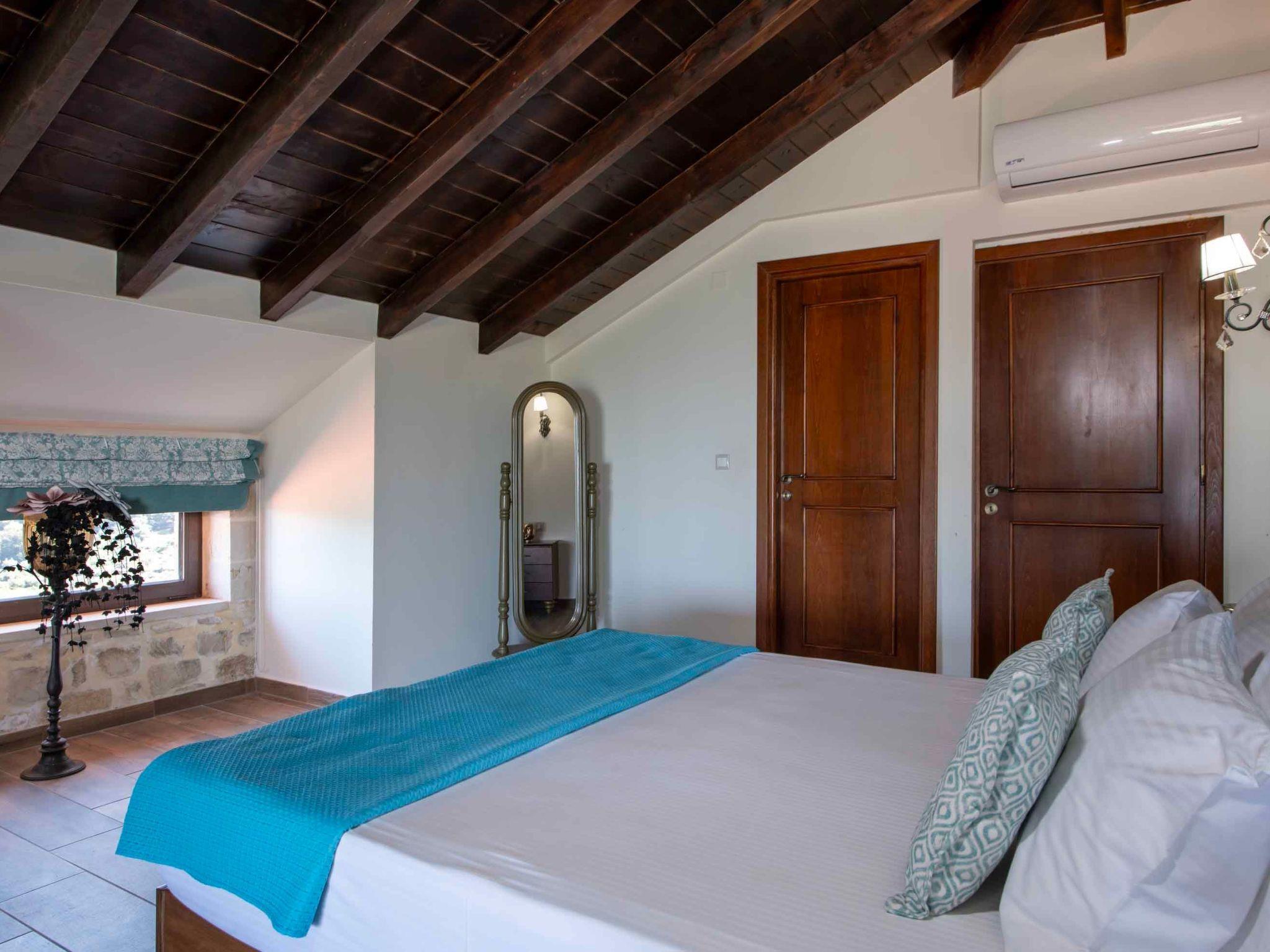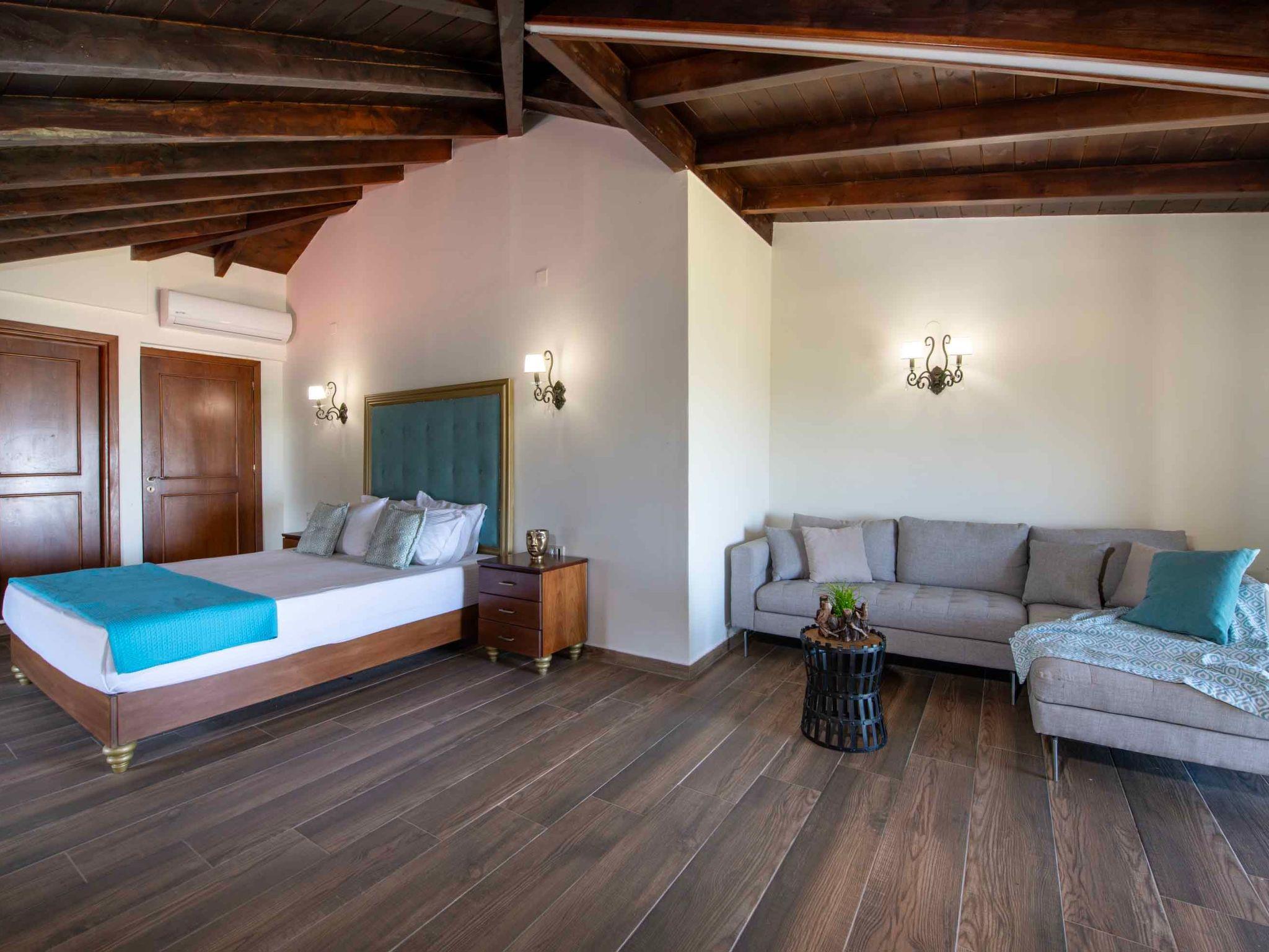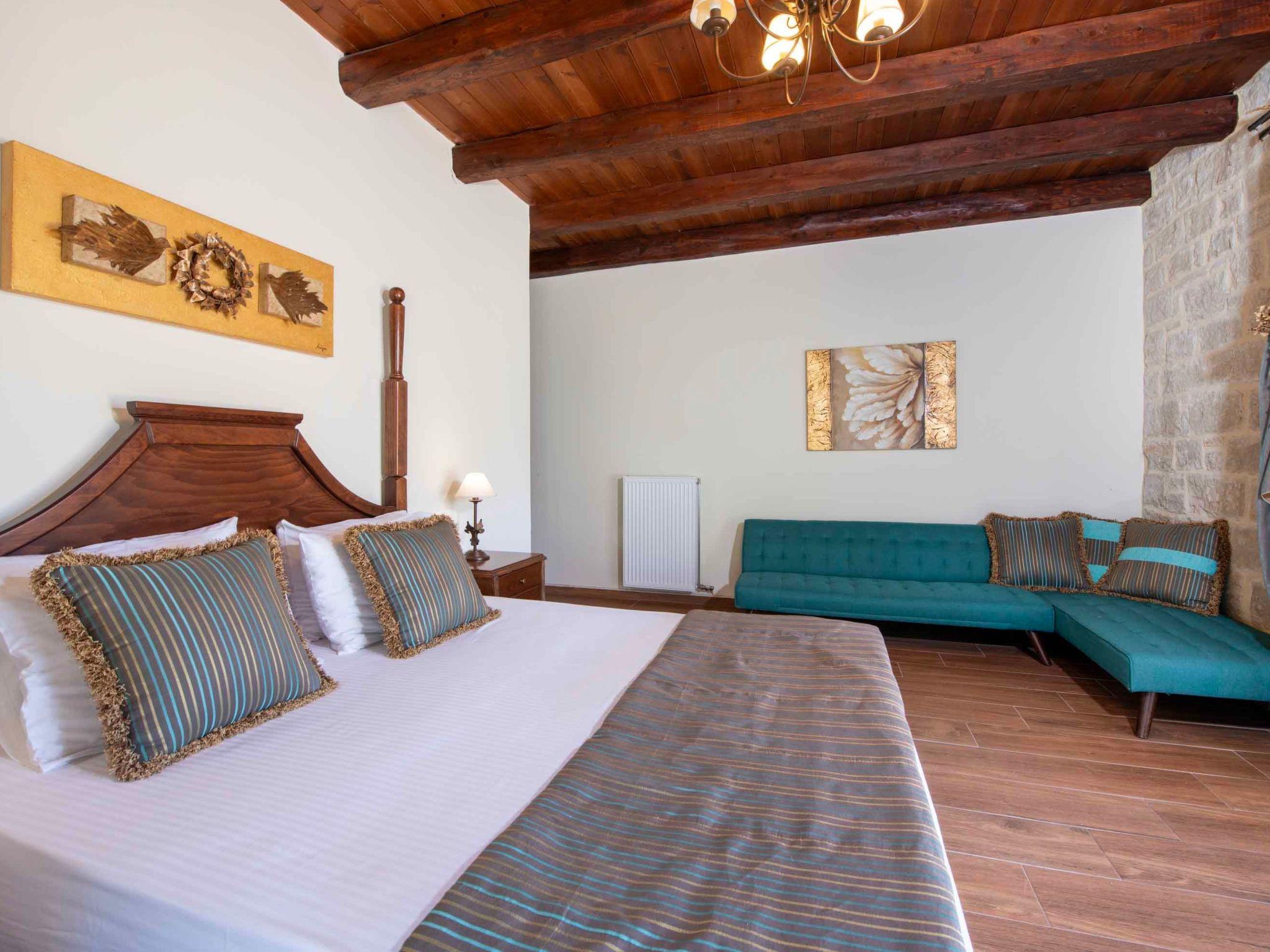 With a total living area of 400 sqm and set within 1,000 sqm of landscaped outdoor space, Geroulios Kastro Villa I is designed to accommodate up to 12 guests in existing beds and 5 additional guests on sofa beds in the bedrooms. The ground floor features a living area with a sofa, a 55’’ Smart Satellite TV, and a fireplace. A fully equipped kitchen and a dining area for six guests create the perfect setting for family gatherings.. This level also includes two bedrooms, both with double beds, as well as a shared bathroom with a shower. The first floor hosts two more bedrooms, both with king-size beds, sofa beds, and private ensuite bathrooms with bathtubs. The second floor includes two more bedrooms, each with a king-size bed, an ensuite bathroom with a shower, A/C, and a 32’’ TV. Both rooms also feature comfortable sofa beds, providing flexibility for larger groups while ensuring privacy and comfort.