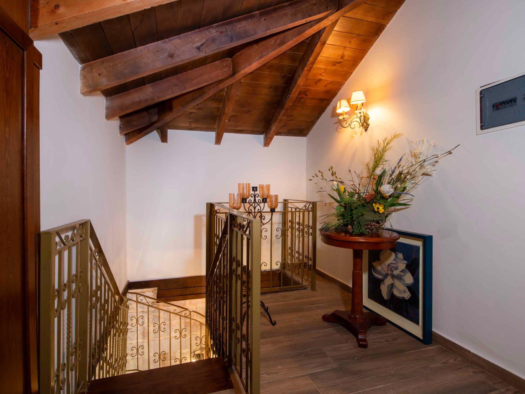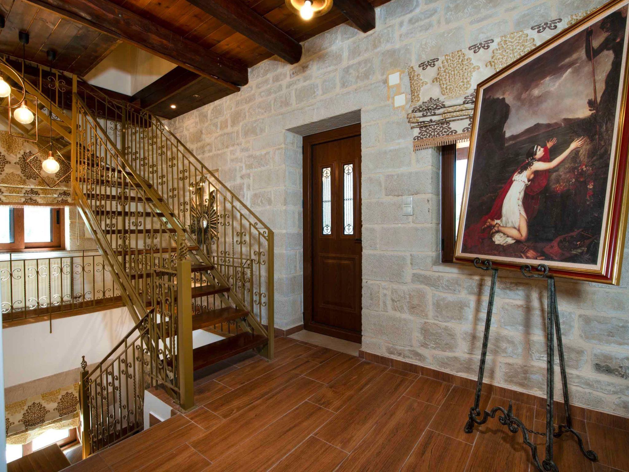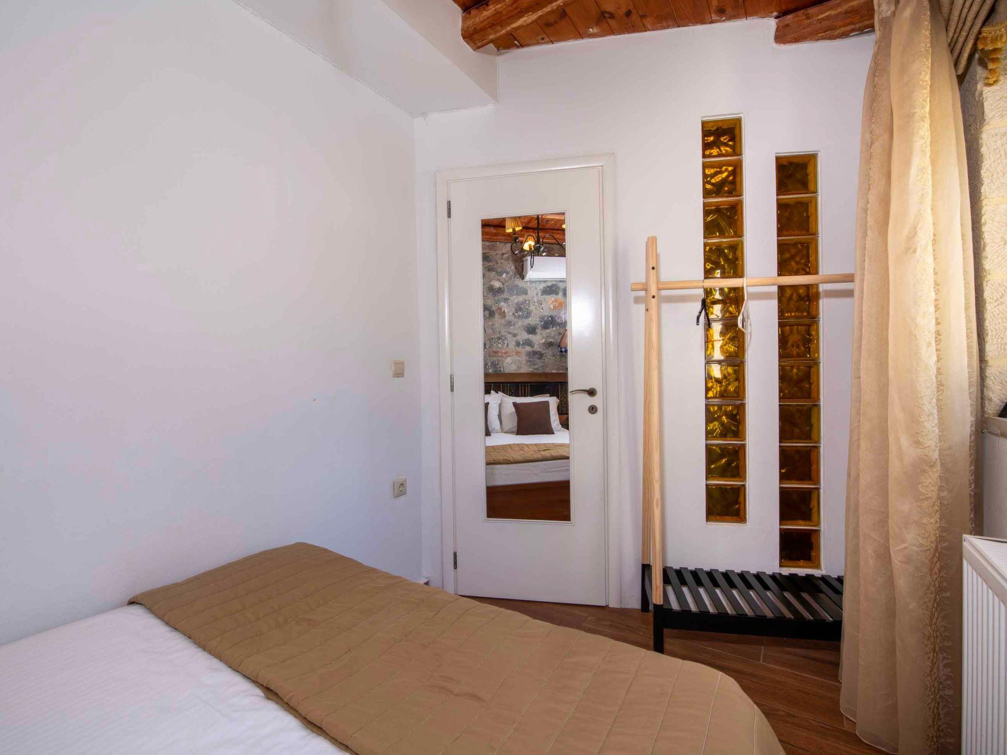 With a total living area of 400 sqm and set within 1,000 sqm of landscaped outdoor space, Geroulios Kastro Villa I is designed to accommodate up to 12 guests in existing beds and 5 additional guests on sofa beds in the bedrooms. The ground floor features a living area with a sofa, a 55’’ Smart Satellite TV, and a fireplace. A fully equipped kitchen and a dining area for six guests create the perfect setting for family gatherings.. This level also includes two bedrooms, both with double beds, as well as a shared bathroom with a shower. The first floor hosts two more bedrooms, both with king-size beds, sofa beds, and private ensuite bathrooms with bathtubs. The second floor includes two more bedrooms, each with a king-size bed, an ensuite bathroom with a shower, A/C, and a 32’’ TV. Both rooms also feature comfortable sofa beds, providing flexibility for larger groups while ensuring privacy and comfort.