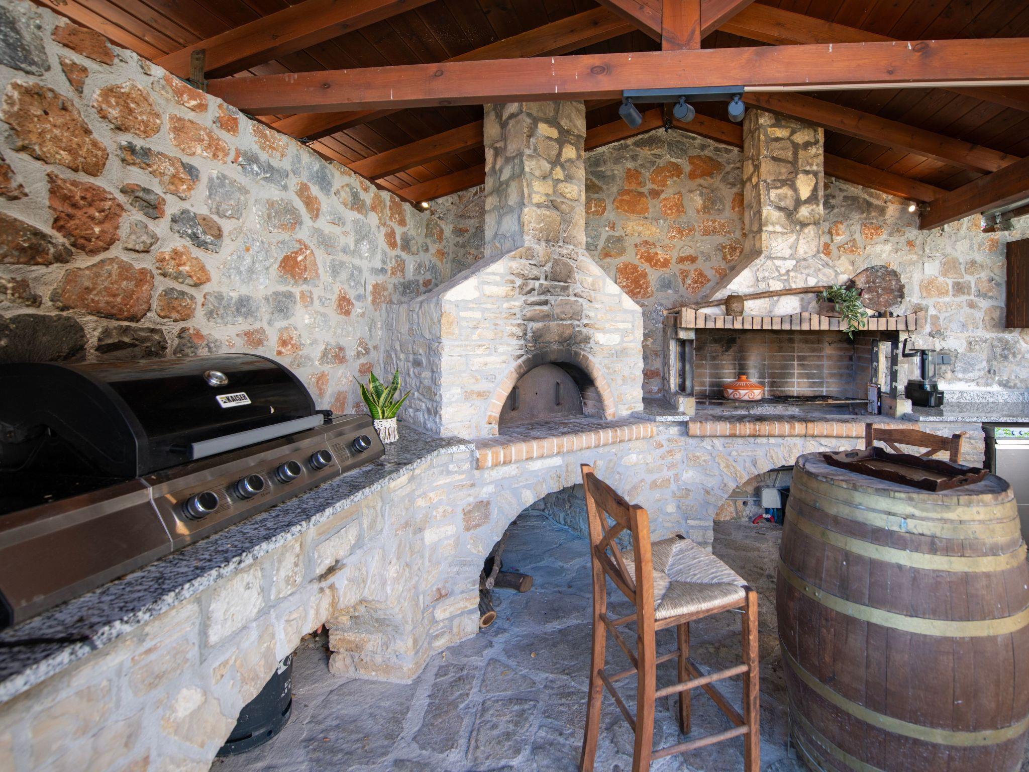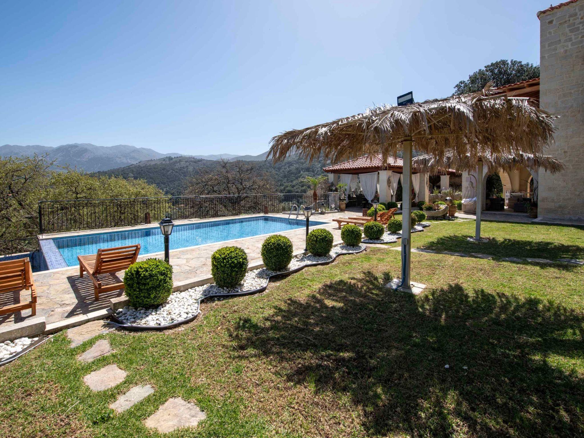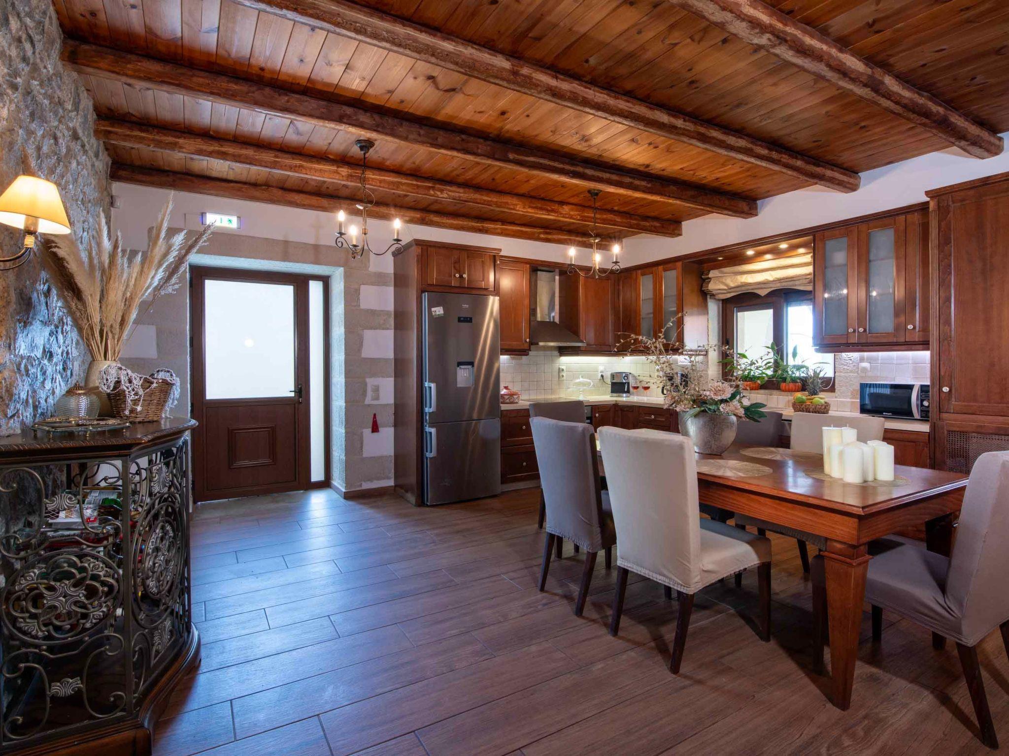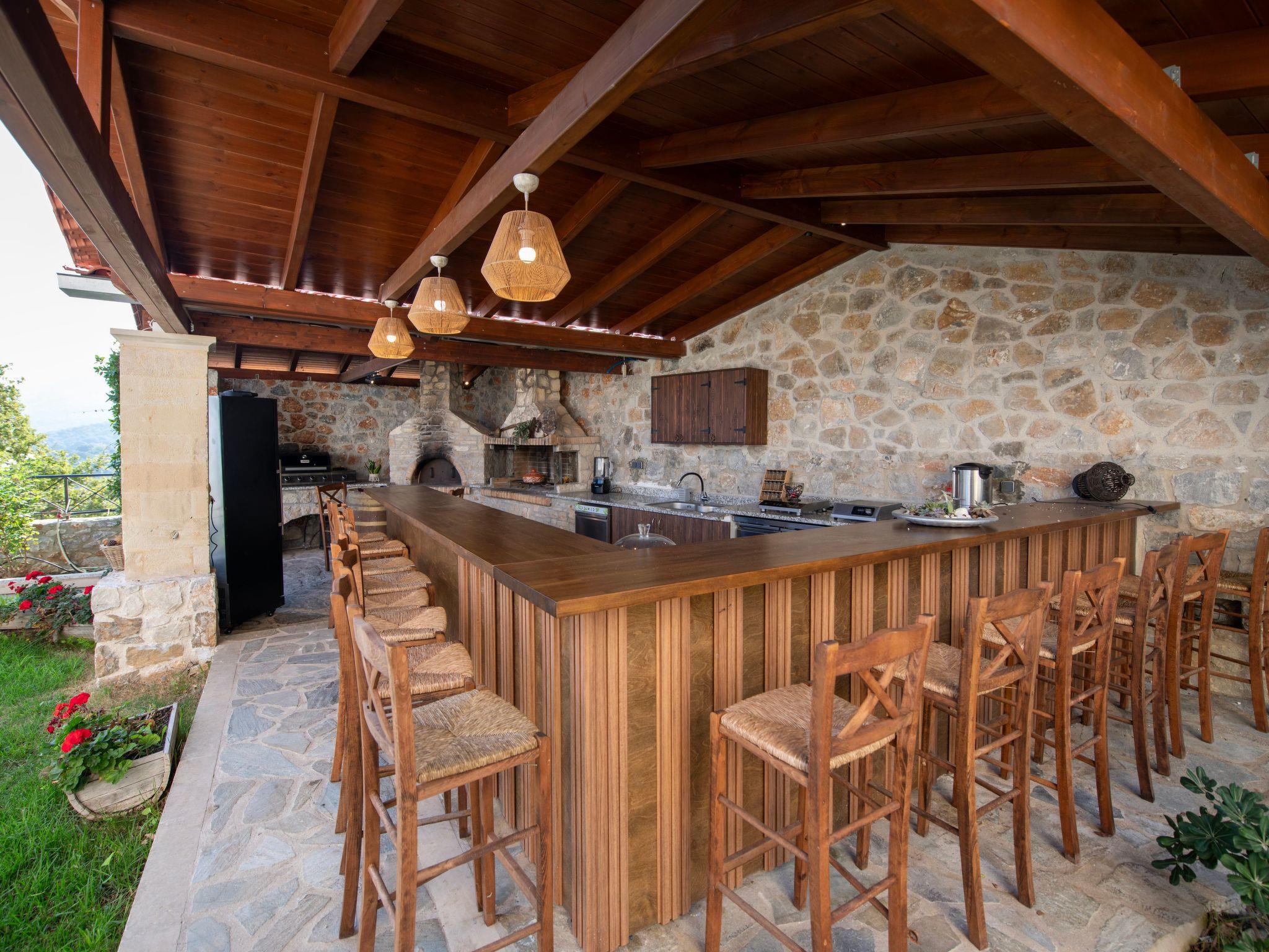 Outdoors, Geroulios Kastro Villa I embodies the essence of luxury living in Chania. The private heated swimming pool (45 sqm, 1.50 m depth) is surrounded by comfortable sun loungers and umbrellas. The highlight of the outdoor area is the fully equipped kitchen with a large dining table for up to 20 guests. A pergola-shaded dining area and a barbecue corner featuring both charcoal and gas grills, along with a traditional wood stove, create the perfect atmosphere for al fresco meals and gatherings with family or friends.