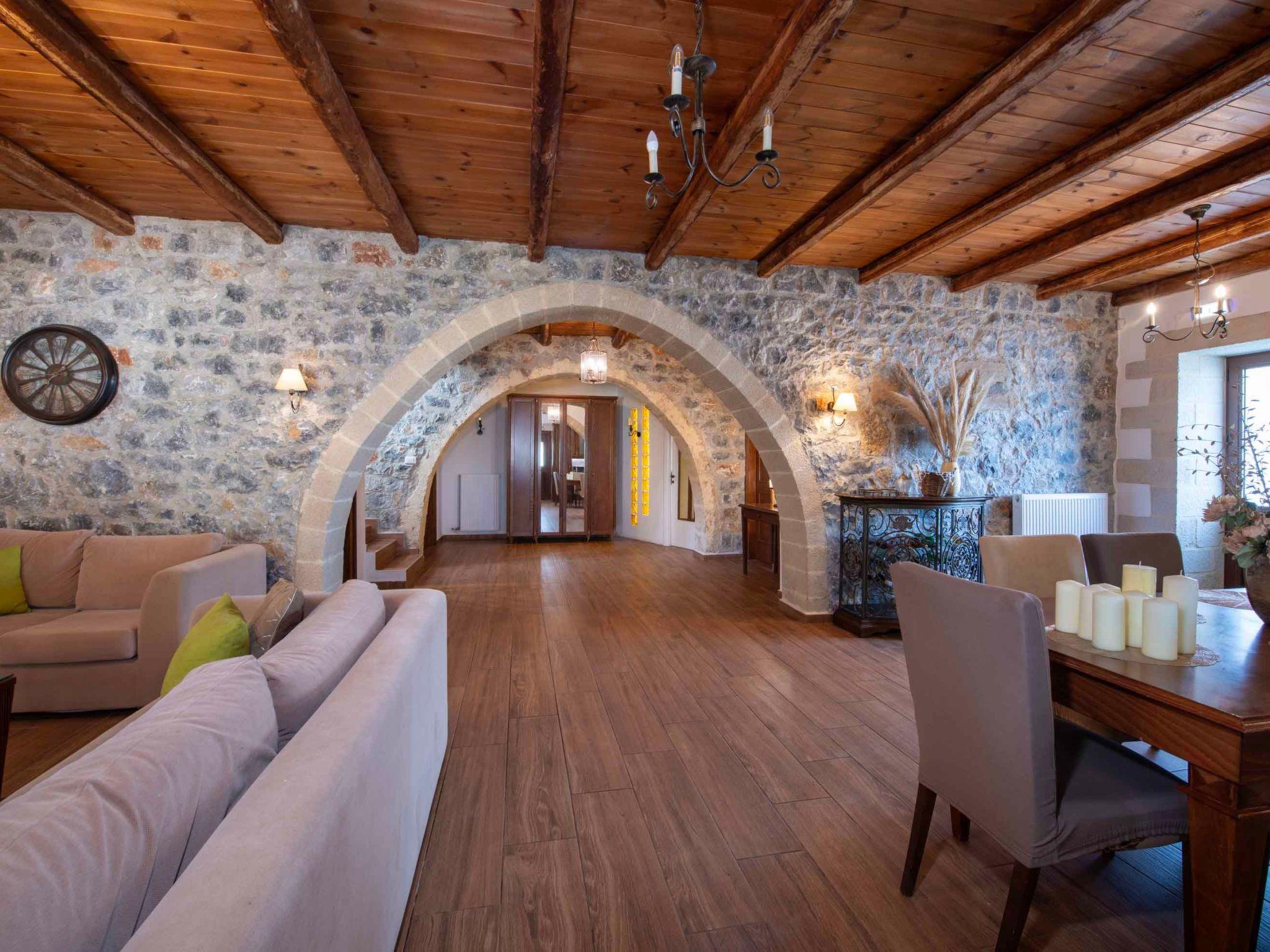 Geroulios Kastro Villa I modern three-story villa located in the traditional village of Embrosneros in the picturesque Apokoronas region of Chania. The spacious villa offers the perfect escape for families and groups seeking a private villa in Crete with a heated private pool, open living spaces, and a tranquil countryside atmosphere. It provides the ideal balance between authentic Cretan village life and modernity.