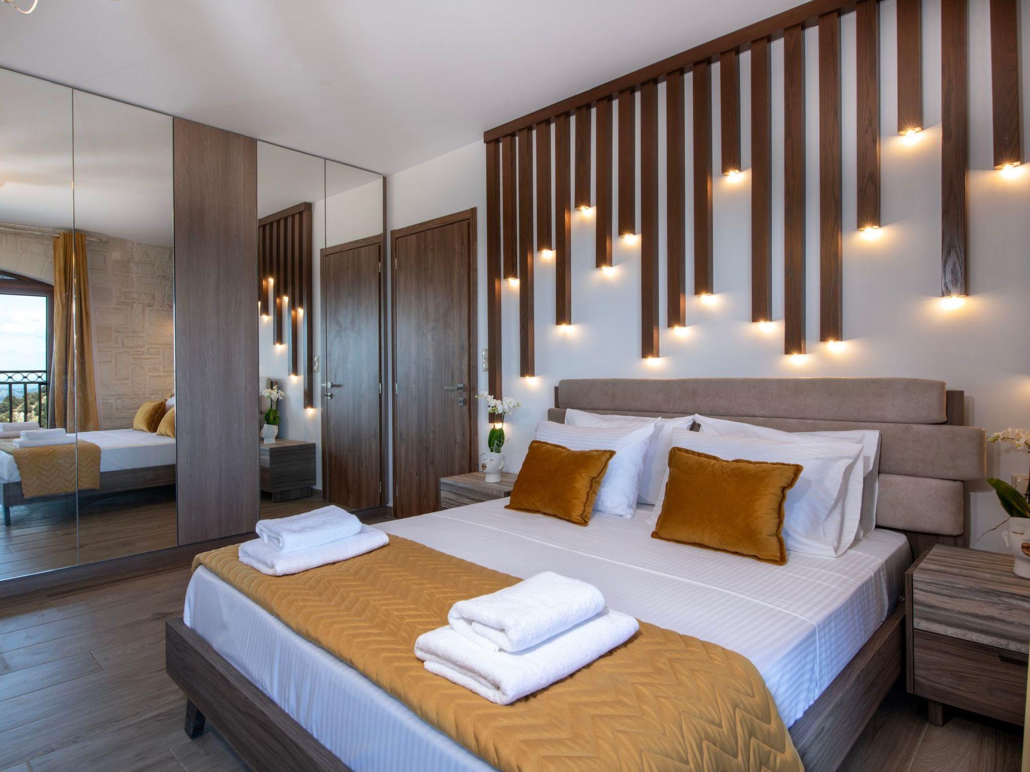 Outdoors, guests can enjoy the private pool, sun loungers, a barbecue area with electric and charcoal grills, and a pergola-shaded dining area for eight. A small waterfall adds a relaxing touch. Geroulios Kastro Villa II captures the true essence of tranquillity and natural beauty. Set on a hilltop surrounded by olive trees and lush greenery, it offers breathtaking panoramic views of the Cretan Sea and the majestic White Mountains.