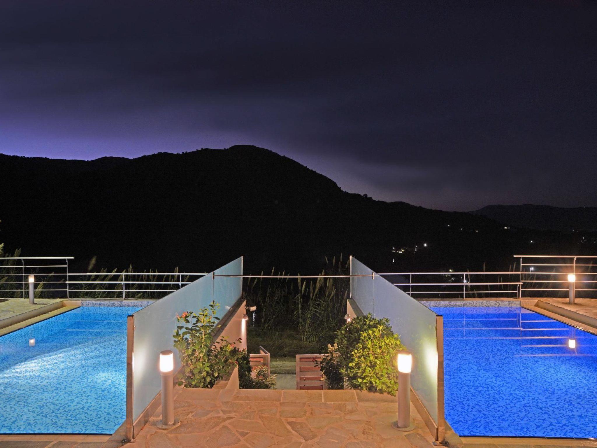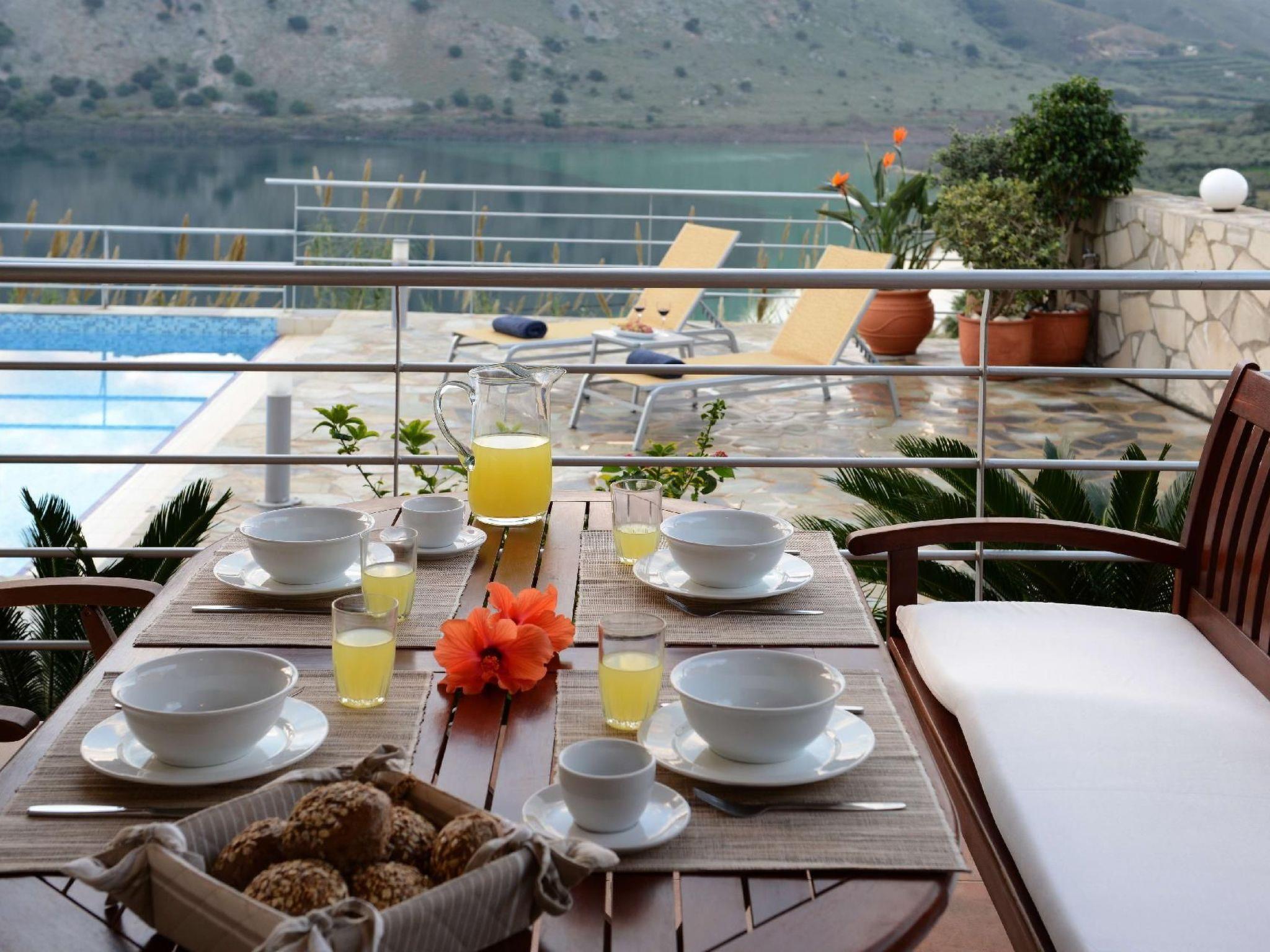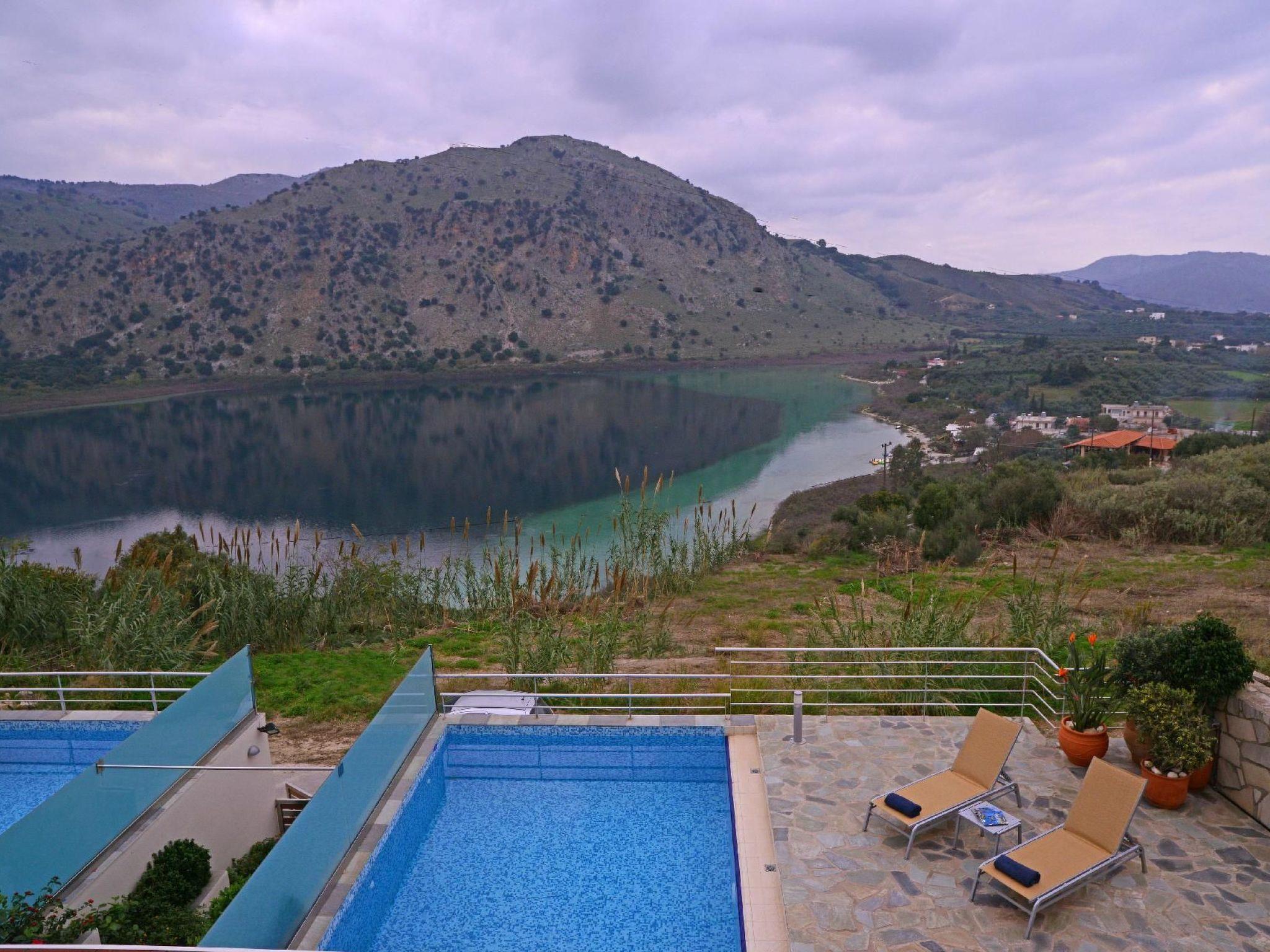 Family-Friendly Villa Bluefairy Dafni w/Pool, walk to Restaurants! 2 km to the Beach!These two unique villas are located in the most panoramic point of the region Kournas. They are built in a way that wherever you are you can enjoy the unique view of the lake and the White Mountains, also with a magnificent backdrop to the deep bay of Georgioupolis and the deep blue of the Cretan Sea. As they are situated in the heart of Apokoronas, just outside the traditional village Kournas, the villas are the ideal starting point for all kinds of tours around the area. Explore the lake and the Cretan nature, visit Crete’s north and south coast, admire the island’s tradition and culture and enjoy its hospitality. Check out is 11:00 latest and check in is 15:00 earliest. Check in and check out can be made without a person-to-person contact (upon request) As you walk in each one of the 120sqm villas, the living room along with a fully equipped kitchen and a dining table is situated there for you. Two Sofas that can turn into beds, a High Definition TV and a WC can be found also on the ground floor. Walking up the stairs and heading up to the second floor, 2 bedrooms with one double bed and one with two single beds can be found. The ideal location in the hilly area of Apokoronas, but only 3 km from the beaches of Georgioupolis, amidst mountains, lakes and the sea, allows you for short walks and longer excursions to experience the Cretan nature and our people.Terrace with garden furniture and sunshade /own balcony/barbecue pool / swimming pool for private use outdoor sitting area parking possibilitiesProperty is detached and fenced