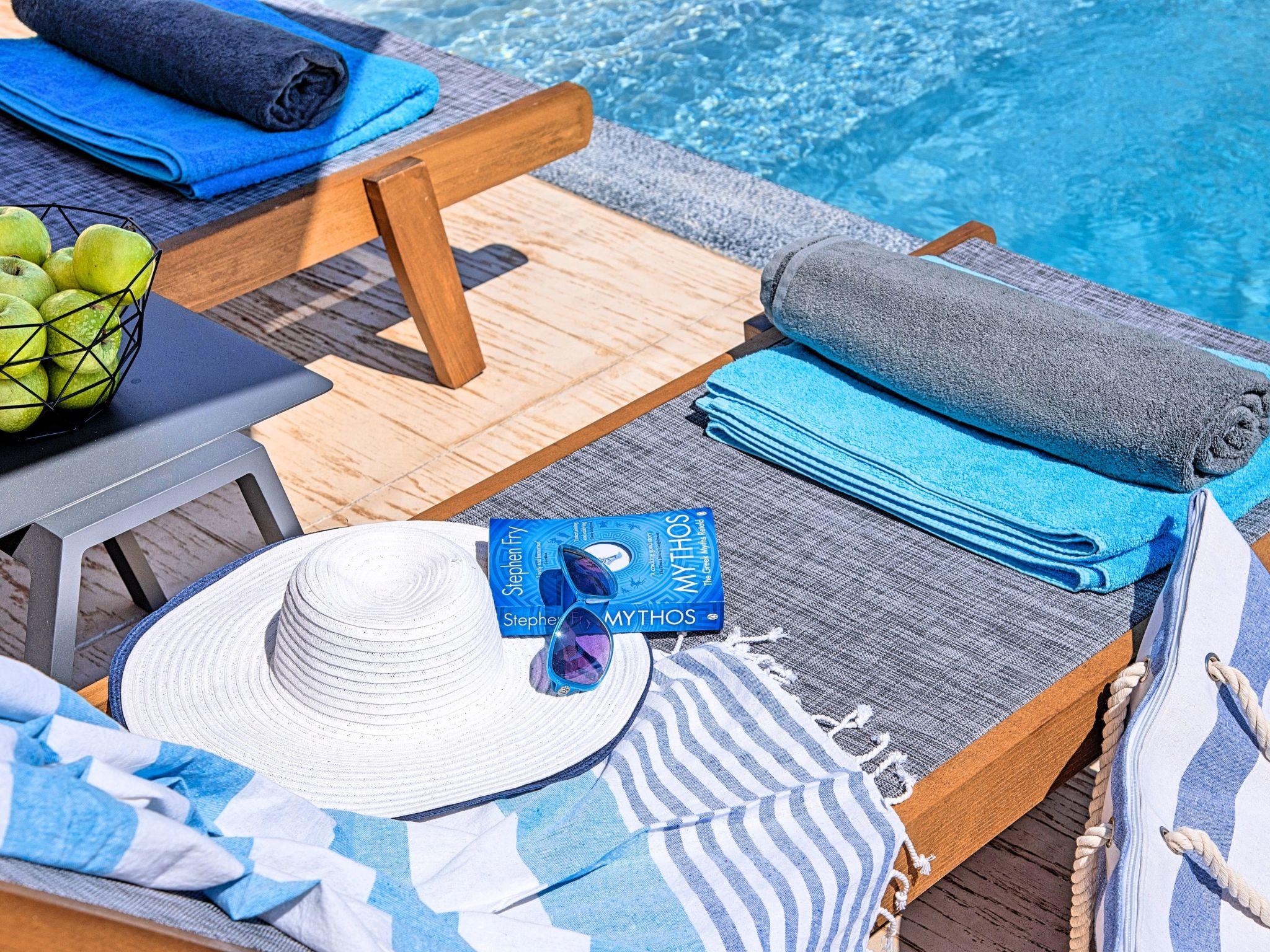 * Private parking area. * Direct access to the swimming pool area. * Private Heated Swimming pool with children/jacuzzi section. The outdoor pool is heated and can reach 6 to 8 degrees more that the 24 h average air temperature with maximum value of 29°C * Swimming Pool cleaning twice per week * Sun lounge area with sun beds and umbrellas. * BBQ next to the swimming pool. The villa can accommodate up to ten guests.