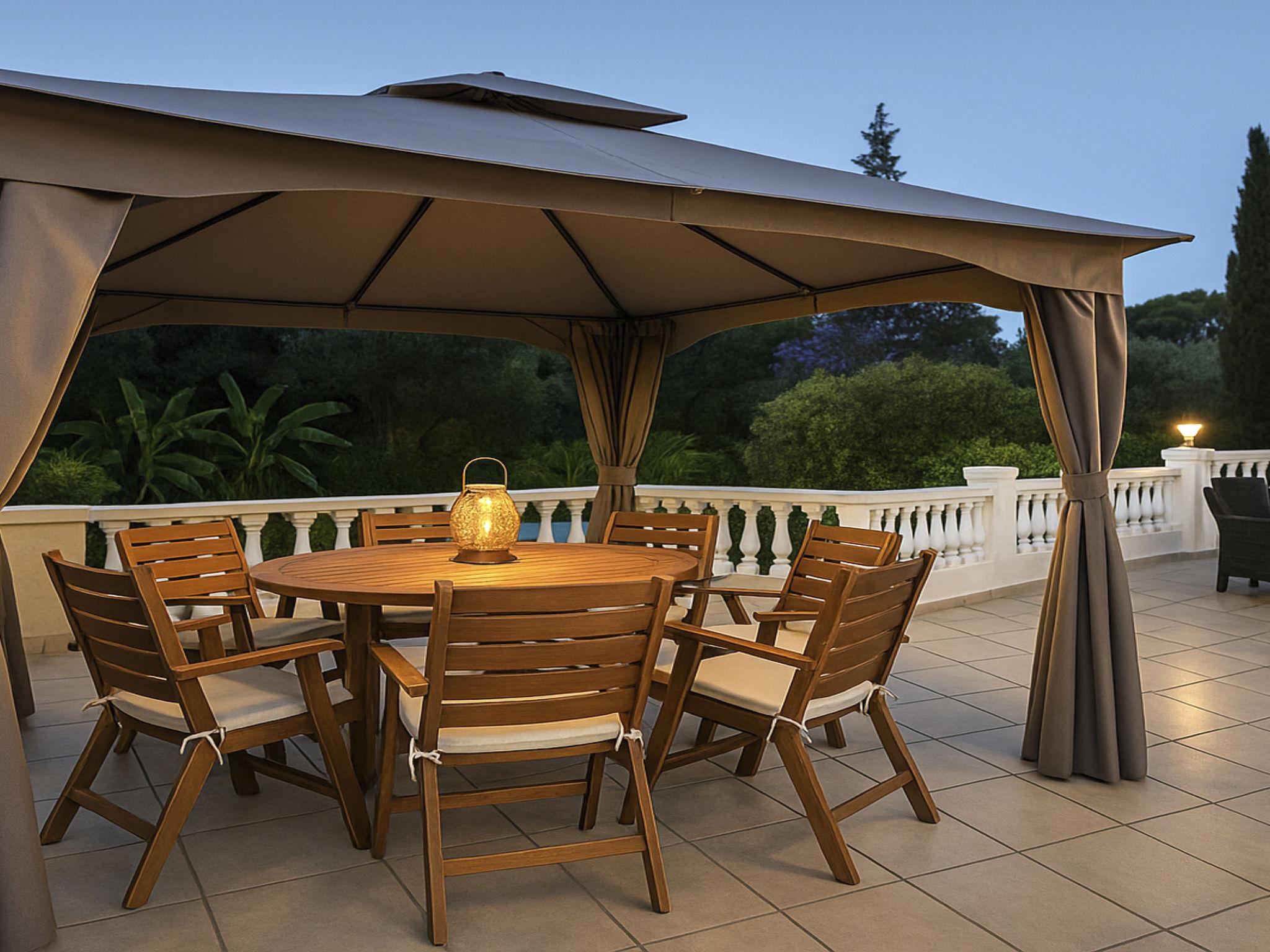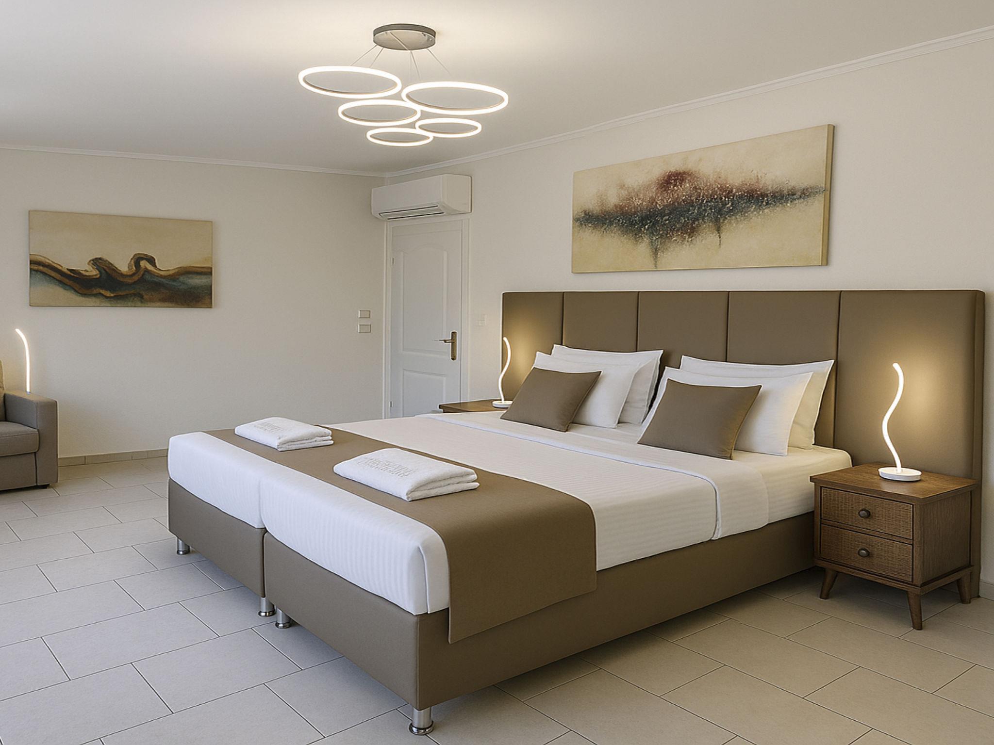 The freshwater swimming pool is adorned with elegant Greek white marble tiles and is surrounded by outdoor furniture. You can sunbathe on stylish loungers with comfortable cushions or relax on the lawn under the shade of the trees.