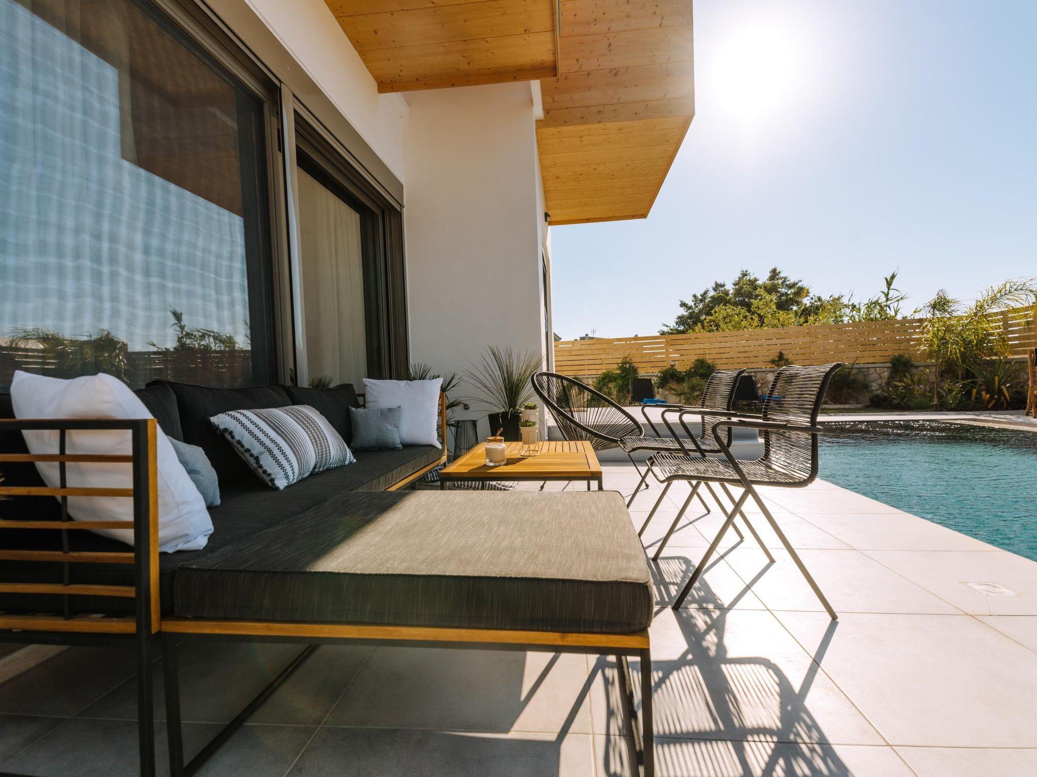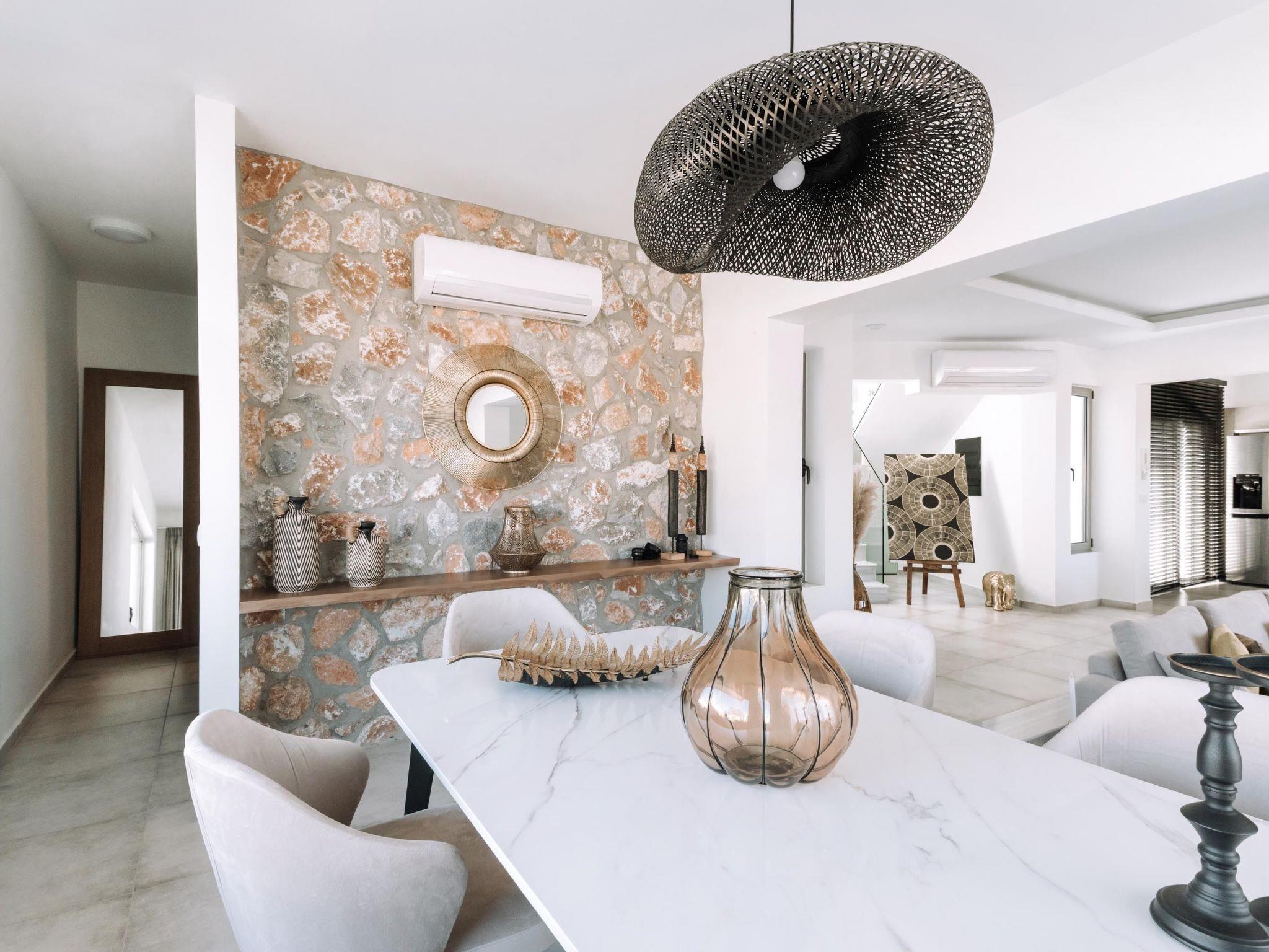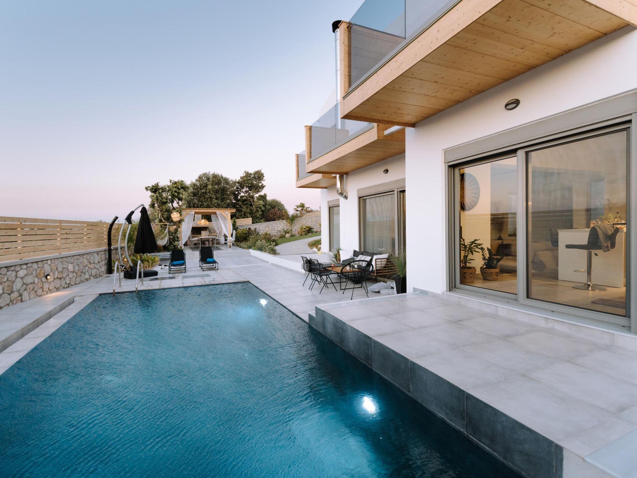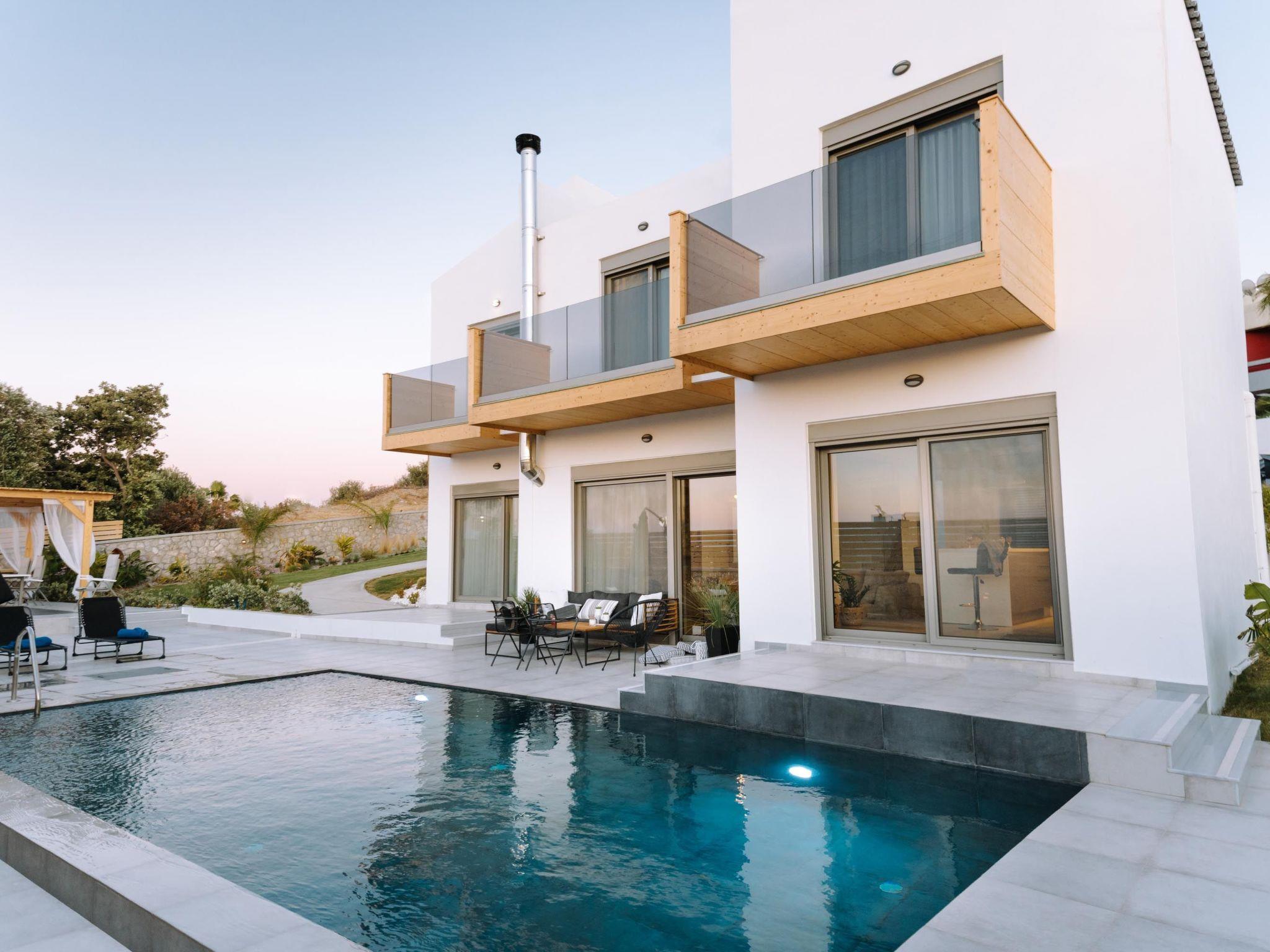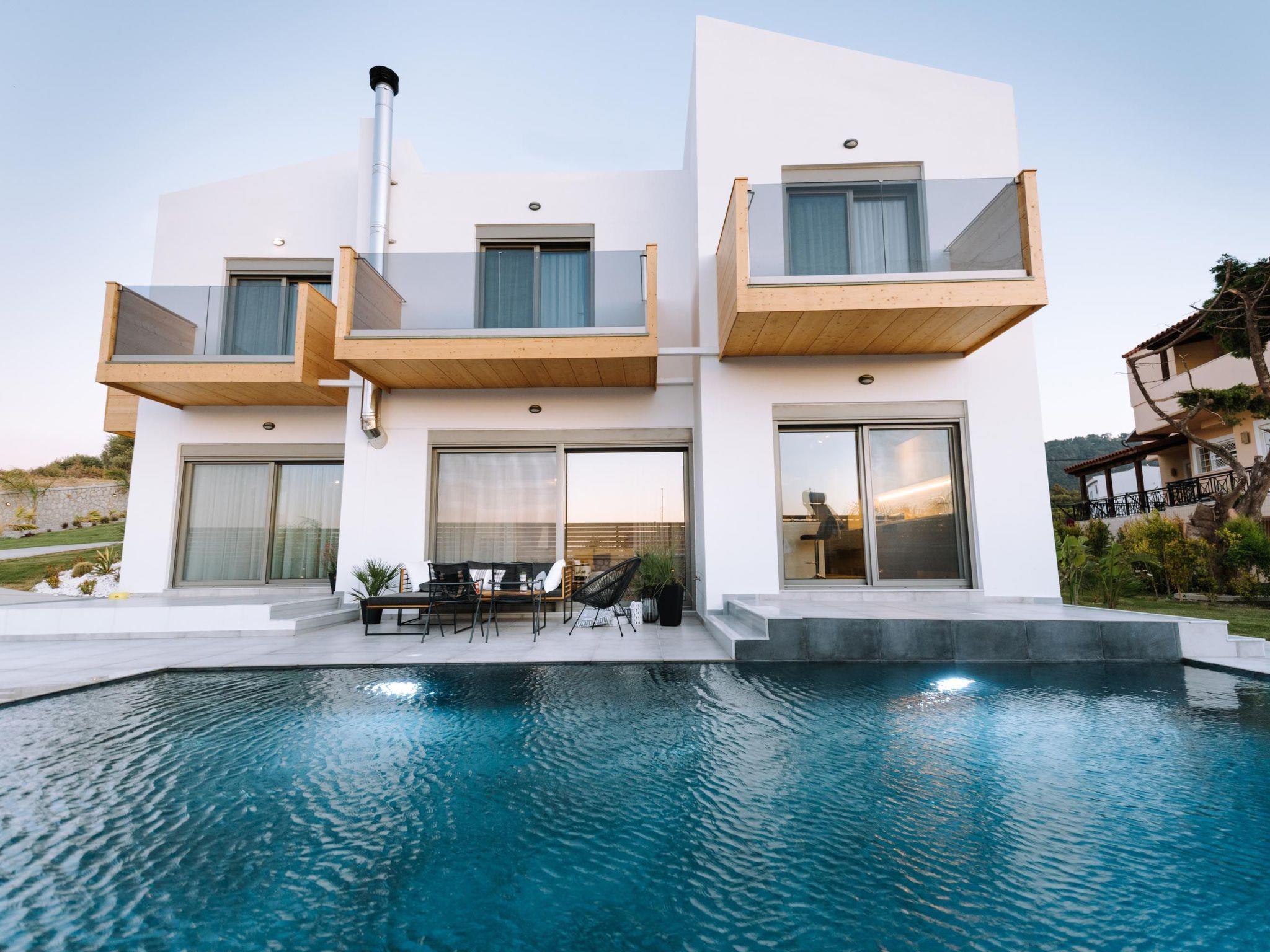Brillante Villa is set on a peaceful side of Ialysos and offers a dreamy private swimming pool. Its great advantages are the great location, you’ll find it only a 5-minute drive from the beach as well as its contemporary interior design with its exotic details. This hidden gem property provides you with romantic sea views and an inspiring design. The airport of Rhodes is found at a driving distance of only 12 minutes. It conveniently accommodates up to 7 guests and offers everything you might need during your holidays in Rhodes!This amazing villa has 3 fully air-conditioned bedrooms, all of them with double beds and smart TVs. Two of the bedrooms have balconies. There’s a single sofa bed in the living room. One of the bedrooms includes an ensuite luxurious bathroom with a shower and a balcony with a view of Ialysos. There are 3 bathrooms in total, with showers. All areas of the villa are fully airconditioned. Also, there’s an open plan huge kitchen which is fully equipped and suitable for any meal preparation. In the same area, you will find the sitting areas of the kitchen along with an incredibly cozy living room in soothing tones of grey and exotic colors. There’s a smart TV and free Wi-Fi access throughout the property. Outdoors, there’s the dreamy private swimming pool with its sunbeds where you can relax and work on your tan under the rays of the Aegean Sun. Of course, the beach is right about a 5-minute drive from the house so you can easily spend your time there. Also, there’s a BBQ installation along with a sitting area to enjoy a gathering with your friends or family under the starry sky!