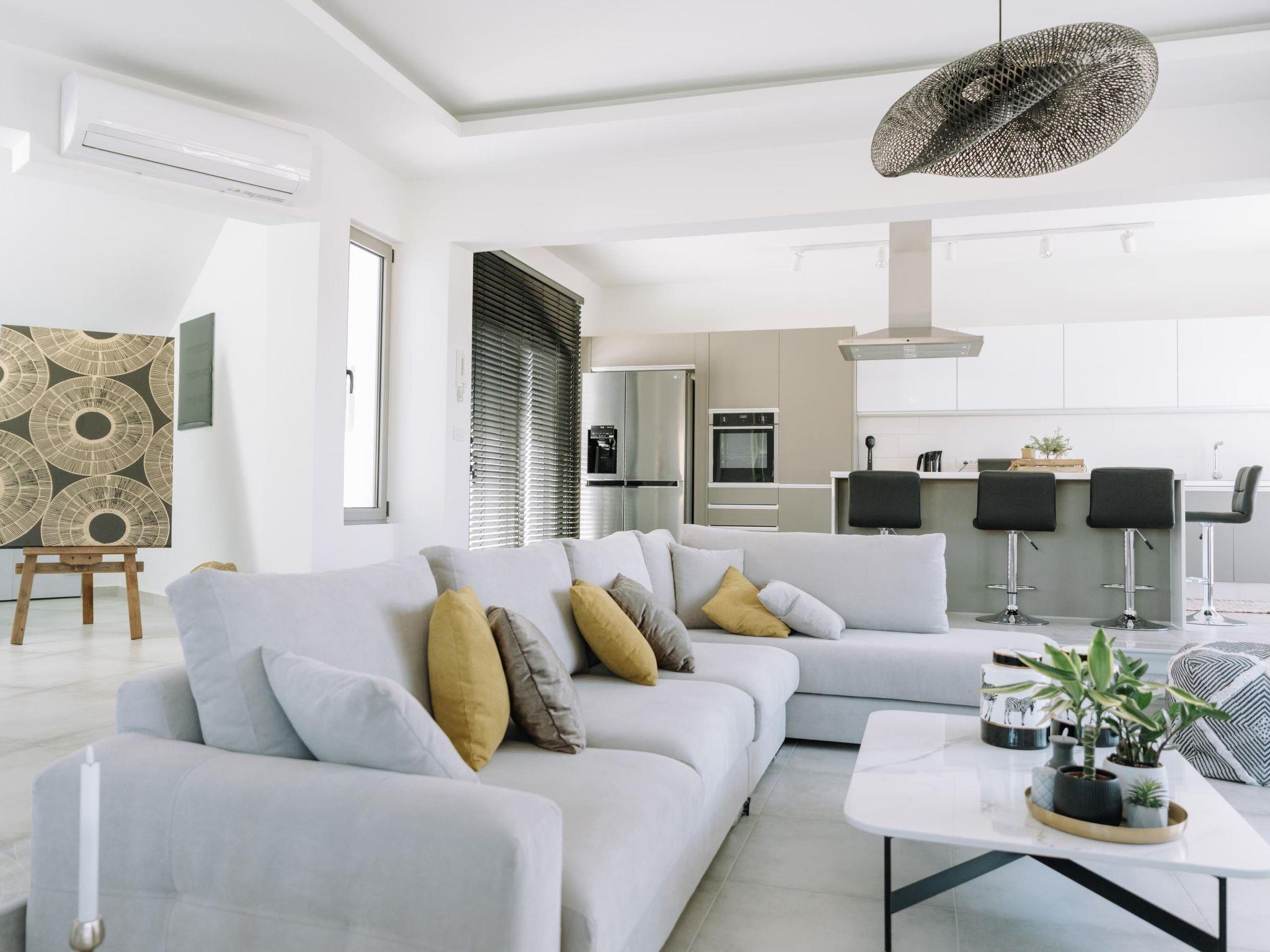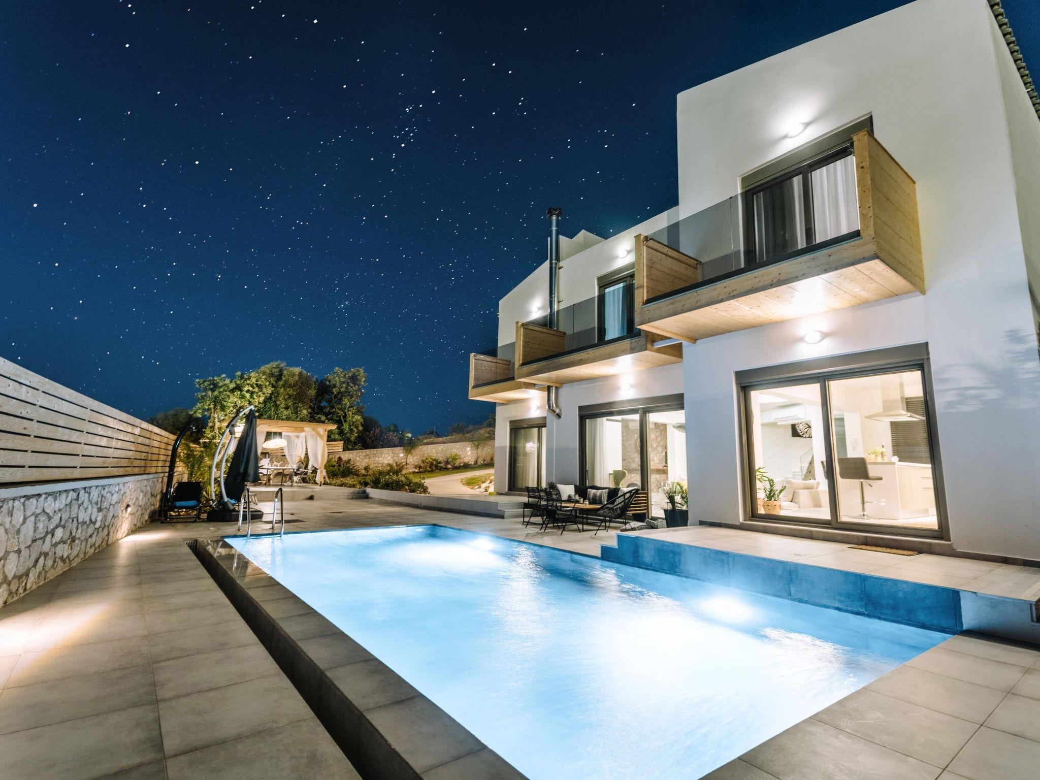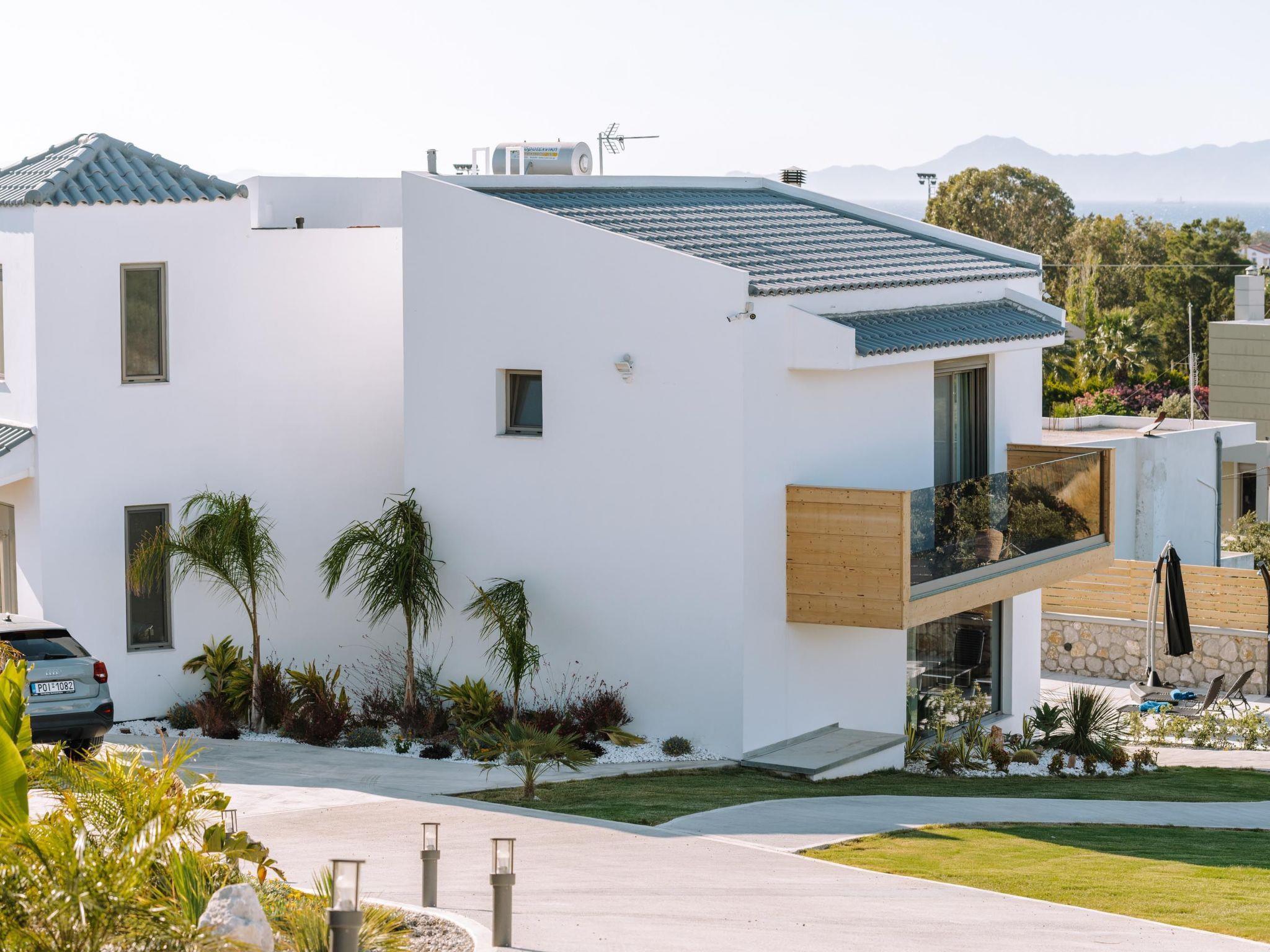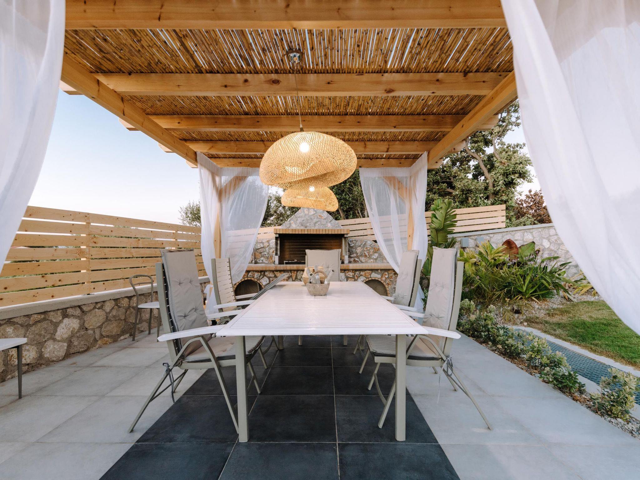 Brillante Villa is set on a peaceful side of Ialysos and offers a dreamy private swimming pool. Its great advantages are the great location, you’ll find it only a 5-minute drive from the beach as well as its contemporary interior design with its exotic details. This hidden gem property provides you with romantic sea views and an inspiring design. The airport of Rhodes is found at a driving distance of only 12 minutes. It conveniently accommodates up to 7 guests and offers everything you might need during your holidays in Rhodes!This amazing villa has 3 fully air-conditioned bedrooms, all of them with double beds and smart TVs. Two of the bedrooms have balconies. There’s a single sofa bed in the living room. One of the bedrooms includes an ensuite luxurious bathroom with a shower and a balcony with a view of Ialysos. There are 3 bathrooms in total, with showers. All areas of the villa are fully airconditioned. Also, there’s an open plan huge kitchen which is fully equipped and suitable for any meal preparation. In the same area, you will find the sitting areas of the kitchen along with an incredibly cozy living room in soothing tones of grey and exotic colors. There’s a smart TV and free Wi-Fi access throughout the property. Outdoors, there’s the dreamy private swimming pool with its sunbeds where you can relax and work on your tan under the rays of the Aegean Sun. Of course, the beach is right about a 5-minute drive from the house so you can easily spend your time there. Also, there’s a BBQ installation along with a sitting area to enjoy a gathering with your friends or family under the starry sky!