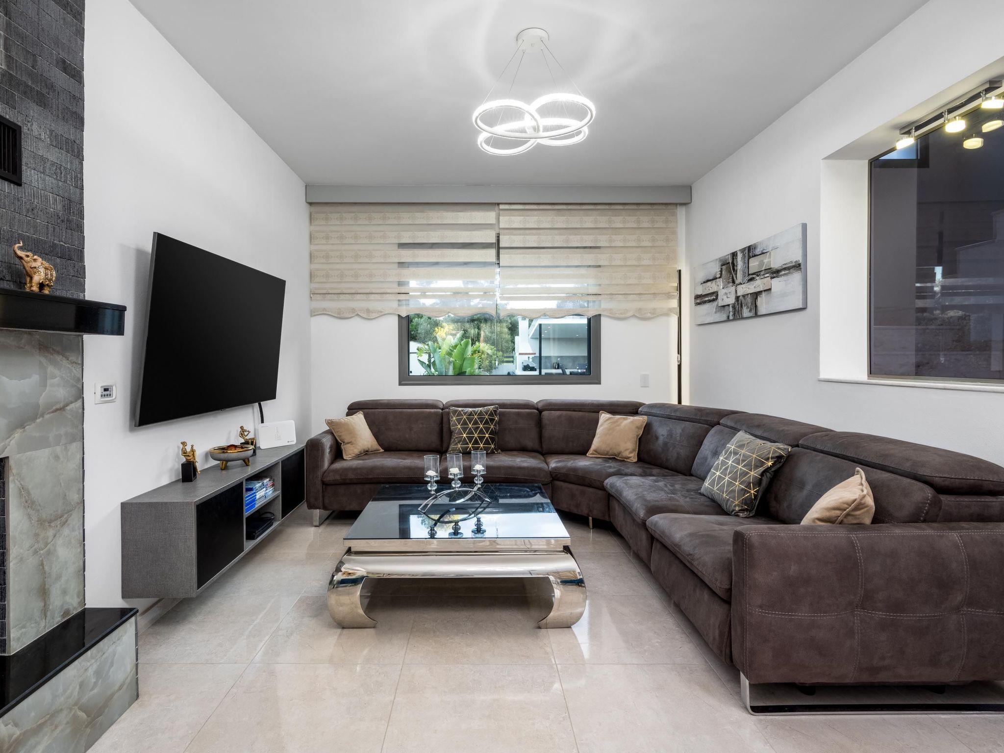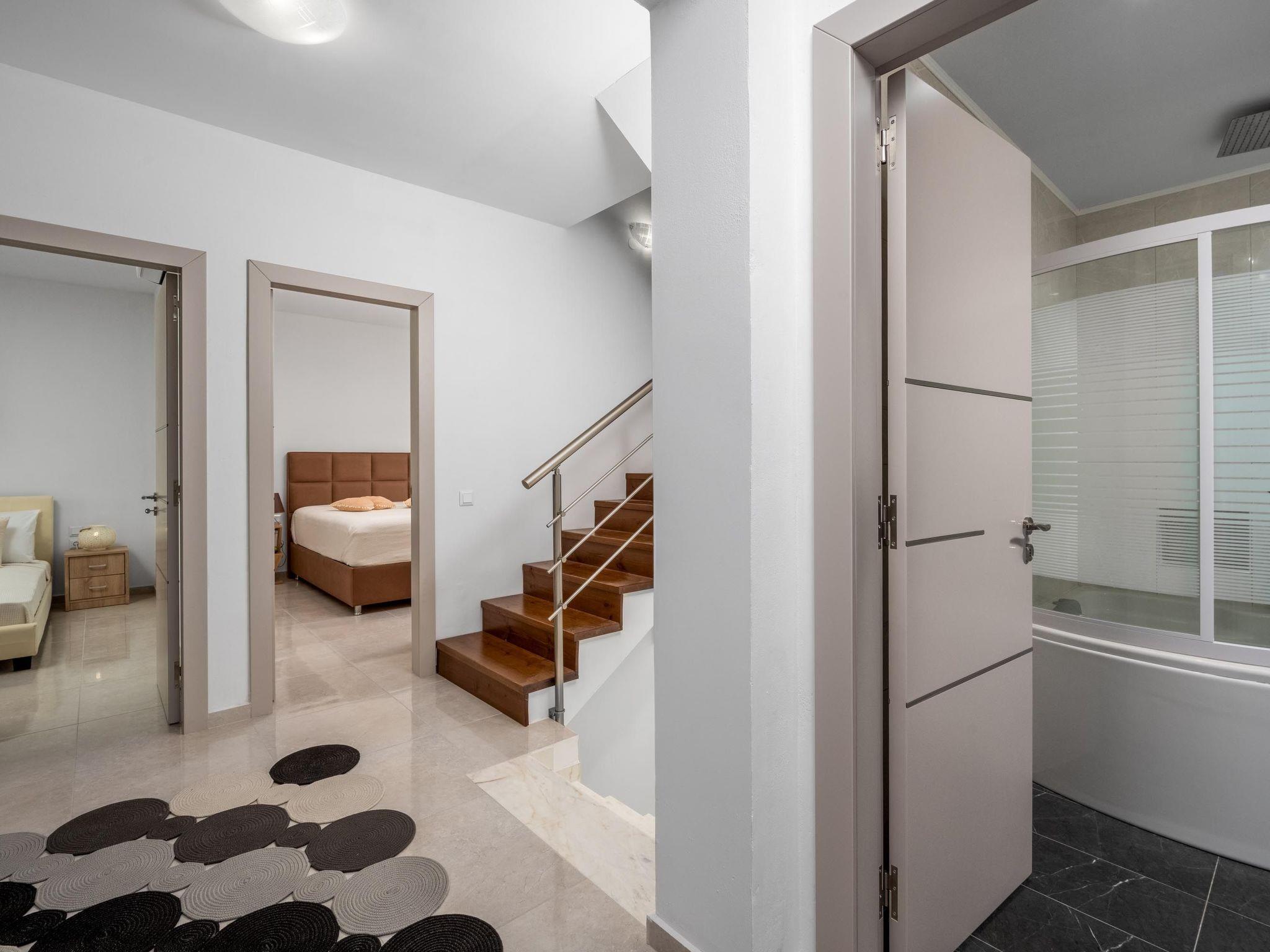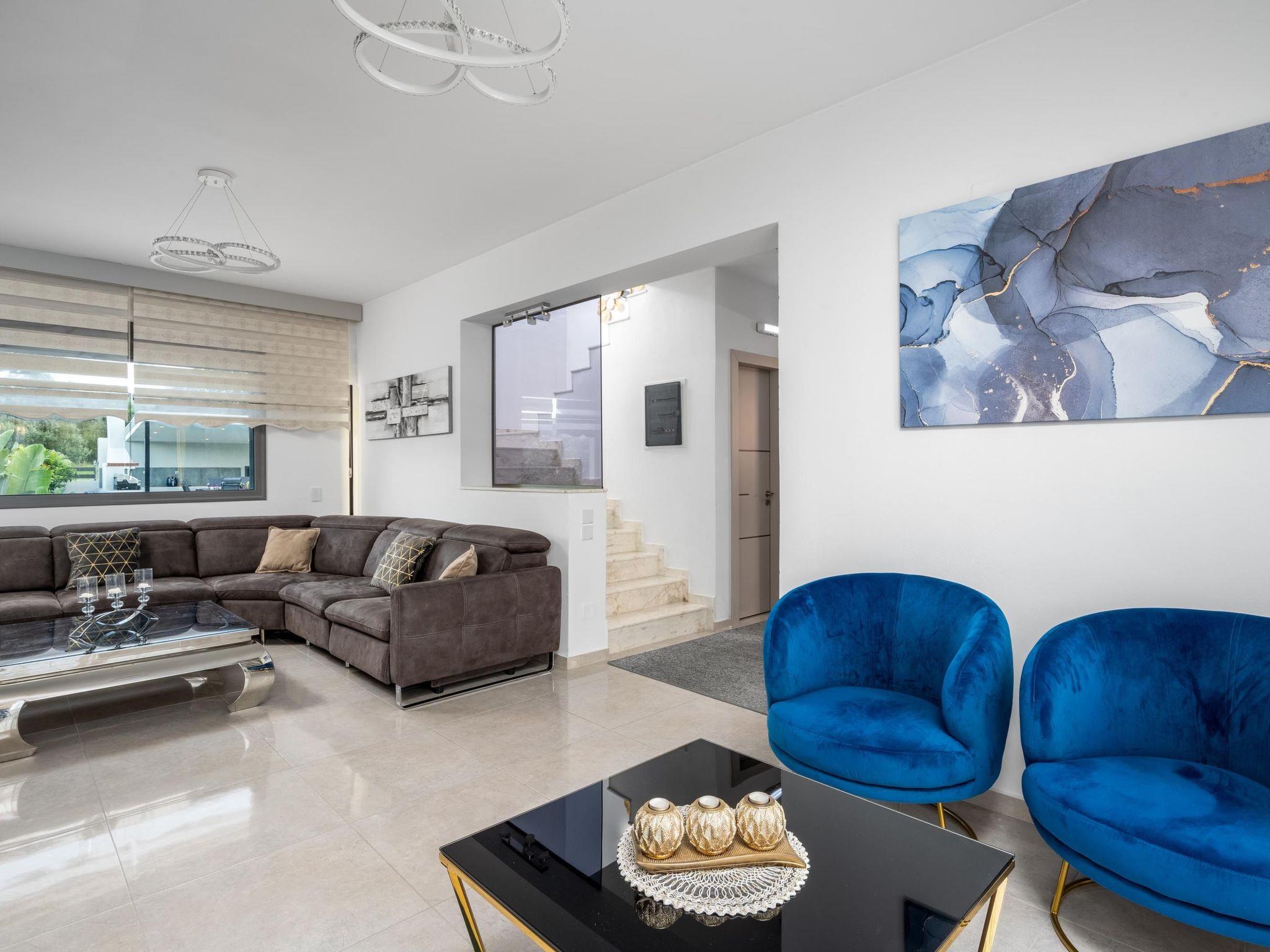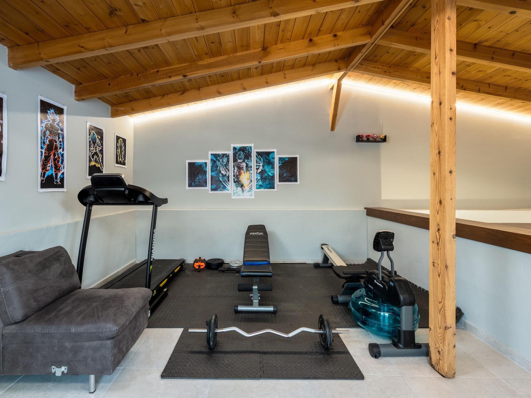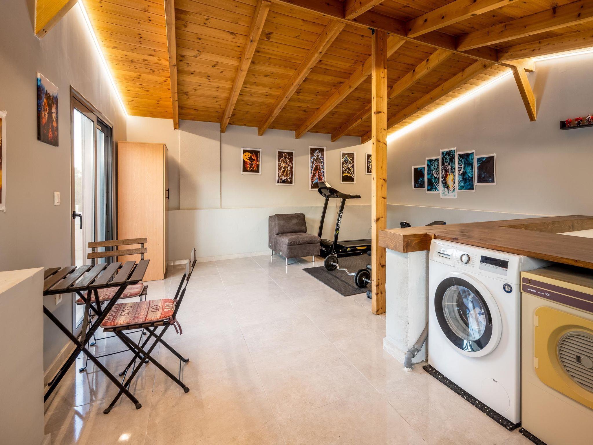This beautiful villa has 3 modern fully air conditioned bedrooms in a serene design. There are 3 bedrooms with double beds. Also, there’s are 2 stylish full bathrooms, one with a shower and a bathtub and one with shower. In addition there is a wc on the ground floor. The fully equipped kitchen is beautifully decorated and is accompanied by a dining area. There’s a smart TV - PS4 with lots of games that you can play & free WIFI access throughout the property. In the attic you will find fitness equipment such as a treadmill, weights and a cycle bike indoor, where you can exercise during your vacation while gazing at the incredible view from the window.