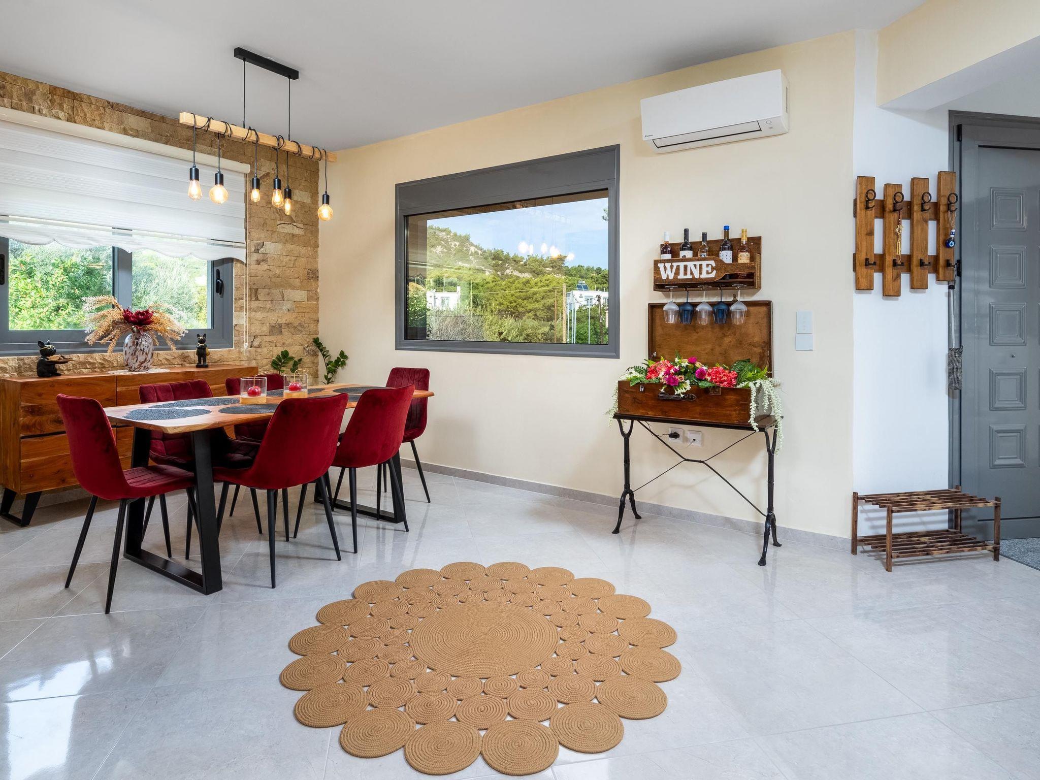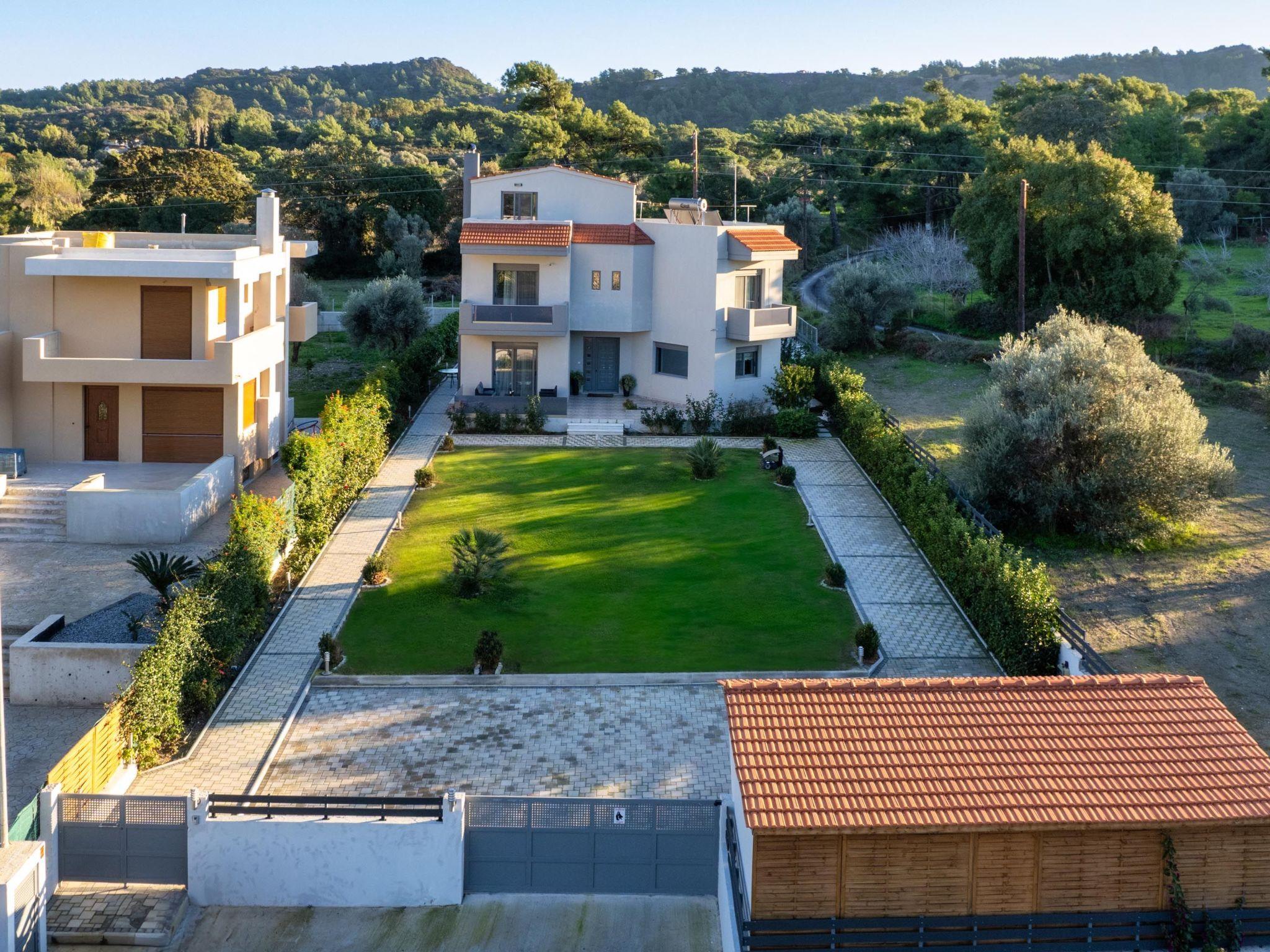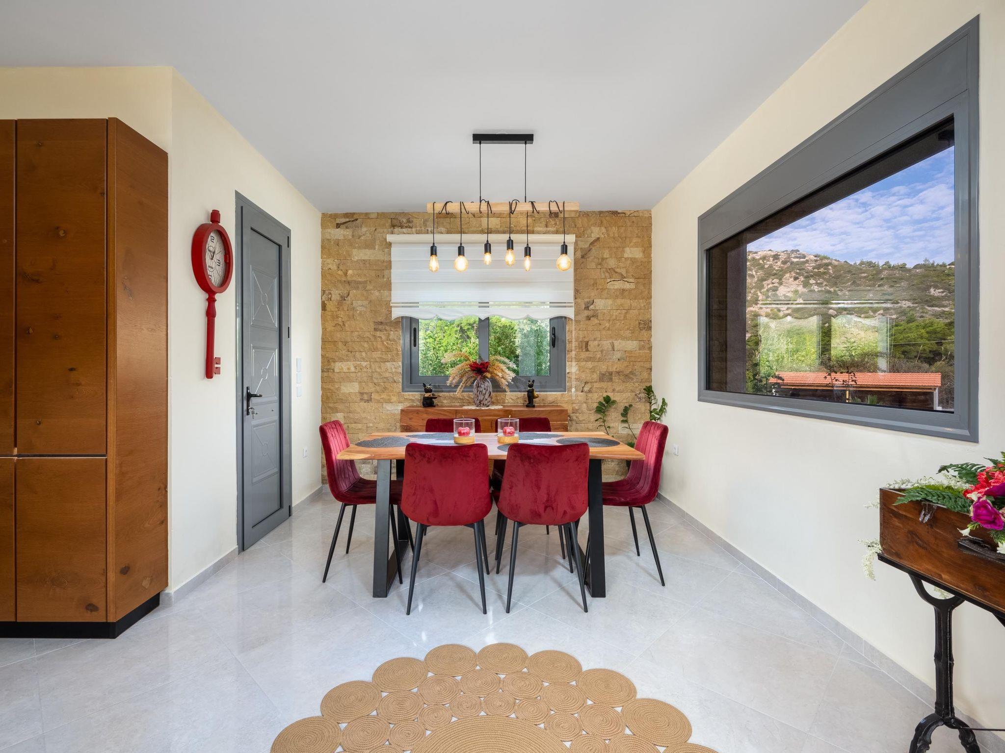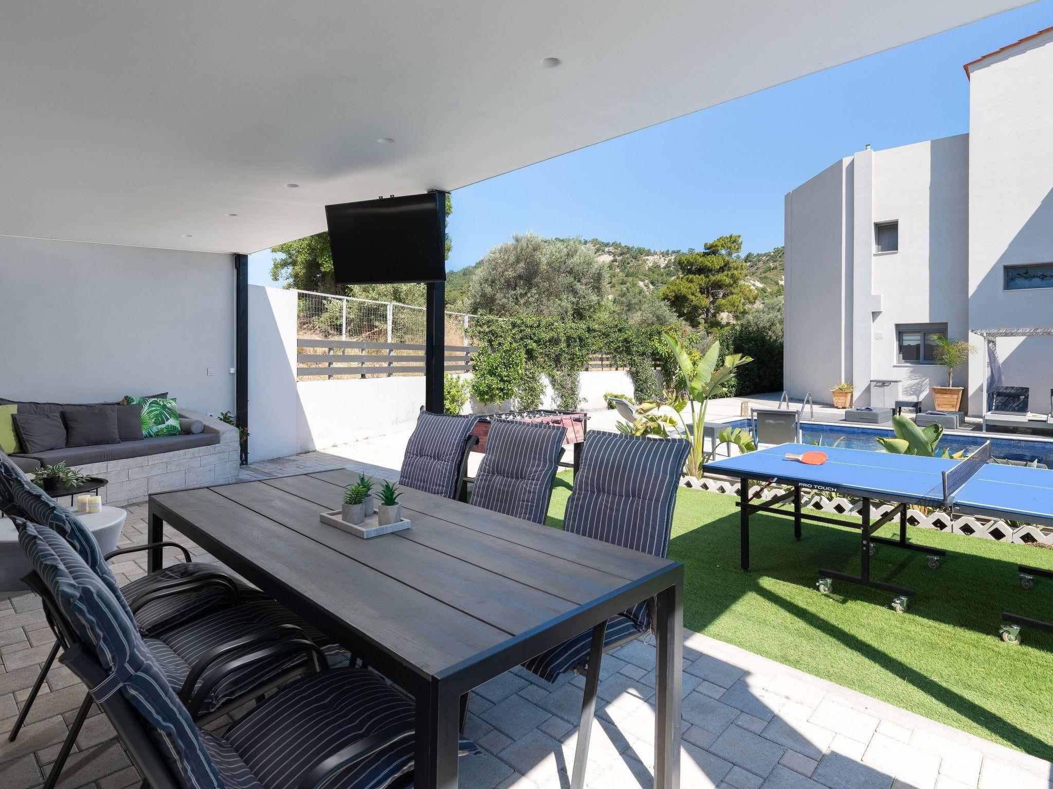 Outdoors, there’s a fantastic private swimming pool with sunbeds where you can relax under the Aegean sun. You can enjoy playing table tennis. The divine location offers a beautiful view of the green forest of Rhodes. This villa has everything you might need to feel comfortable and at home. There’s a BBQ facility where you can prepare all fresh meals and enjoy gathering with your loved ones in the outdoor dining area.