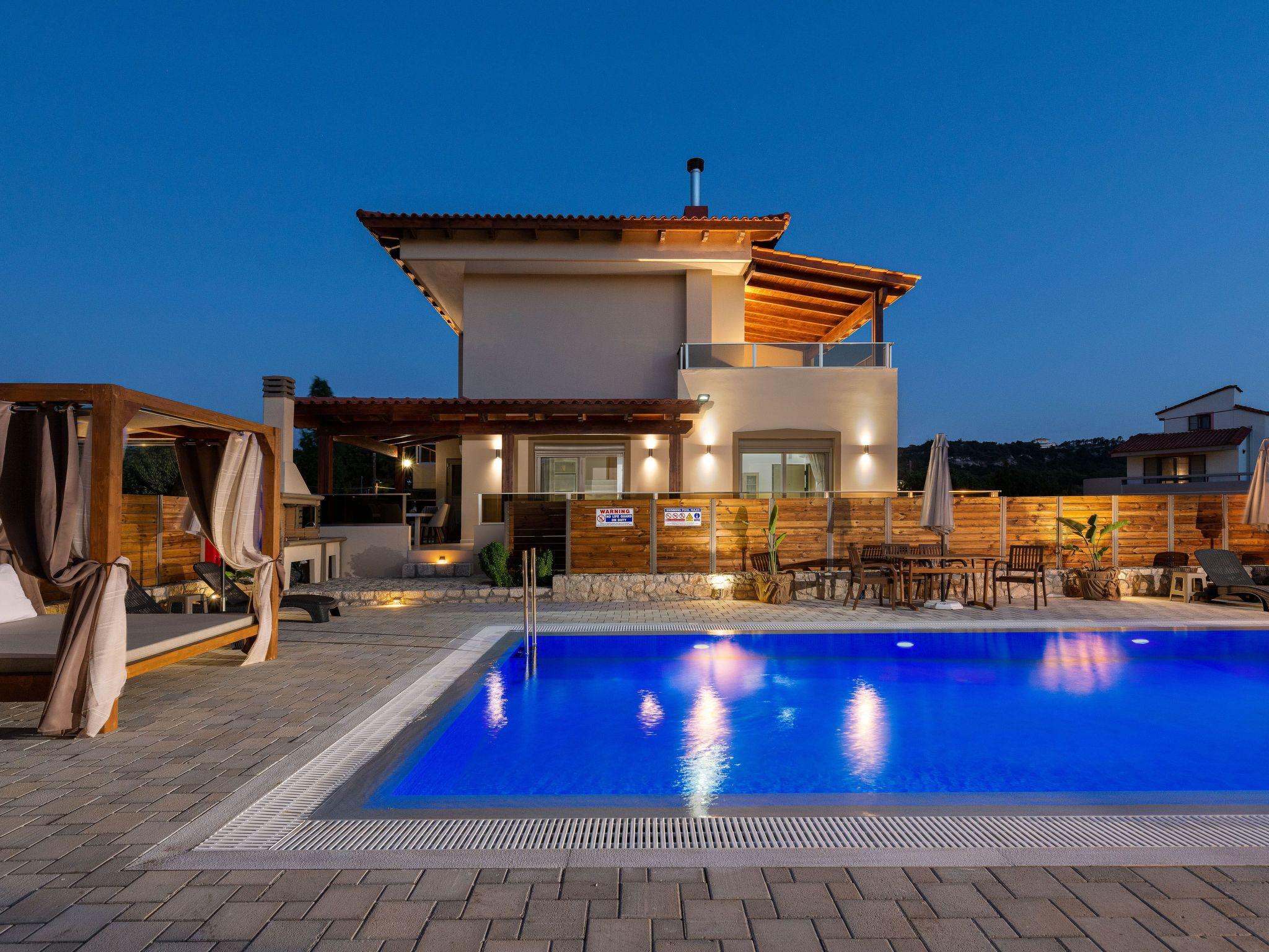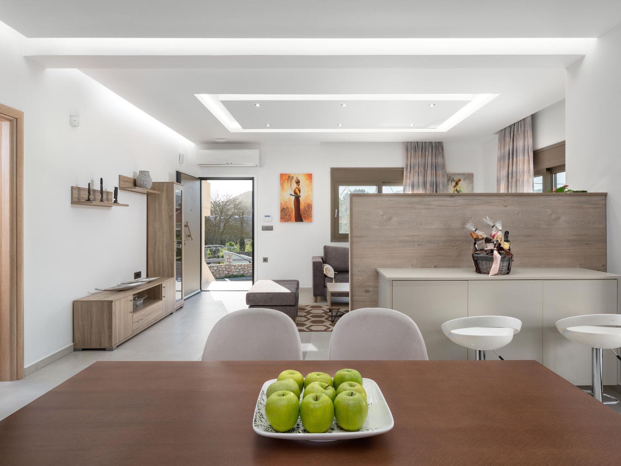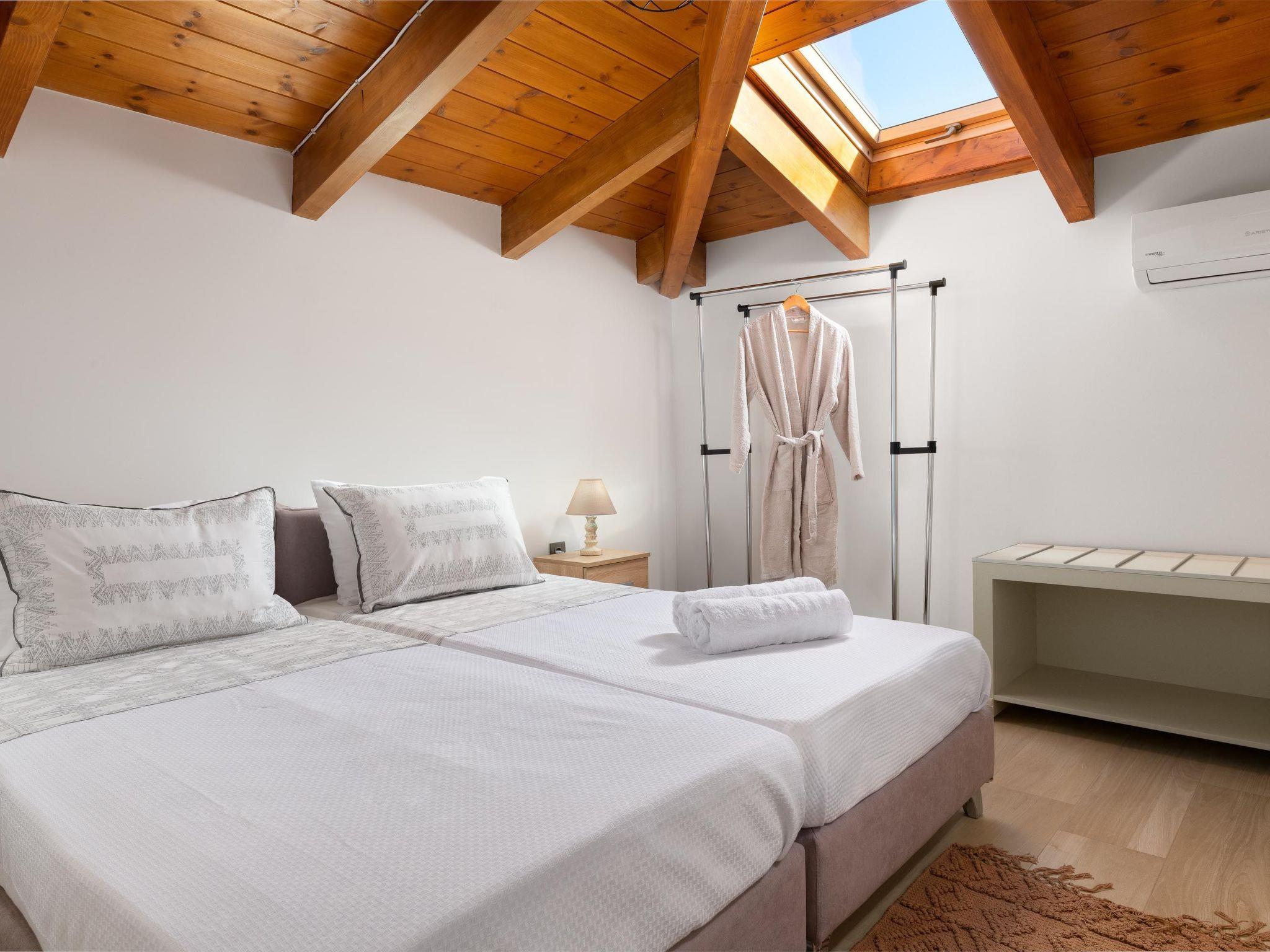 This marvelous luxury villa has 4 fully air-conditioned bedrooms. Half of the bedrooms have kinged sized double beds and the other half have twin beds. Also, there’s a comfy sofa bed in the living area. All bedrooms and areas are fully air-conditioned and have beautiful balconies with an amazing view of Greek nature. There are 2 bathrooms, one ensuite in a bedroom that has a shower, and one sharing that has a relaxing bathtub. On the ground floor, guests will find a fully equipped kitchen, suitable for any meal preparation. The modern kitchen is sharing the area with the living room, designed and decorated in warm tones. There’s free Wi-Fi access throughout the property as well as a smart TV with satellite channels, Netflix and karaoke. Outside is as beautiful as on the inside. There’s an amazing private swimming pool with a soothing unheated Jacuzzi, where you can relax and enjoy your holidays to the fullest. Also, there are BBQ facilities and a sitting area where you can prepare a meal and enjoy a gathering with your loved ones surrounded by beautiful nature.