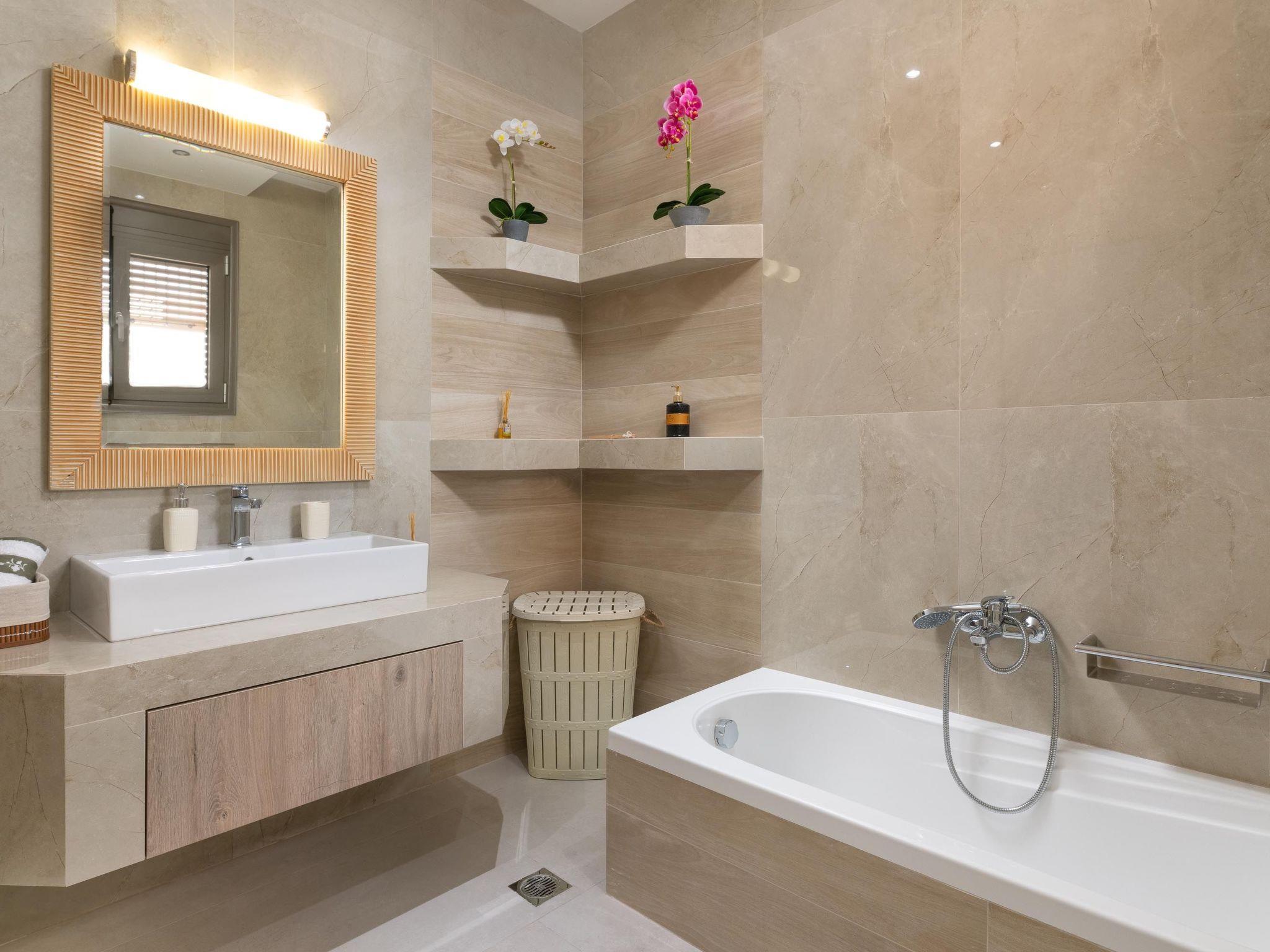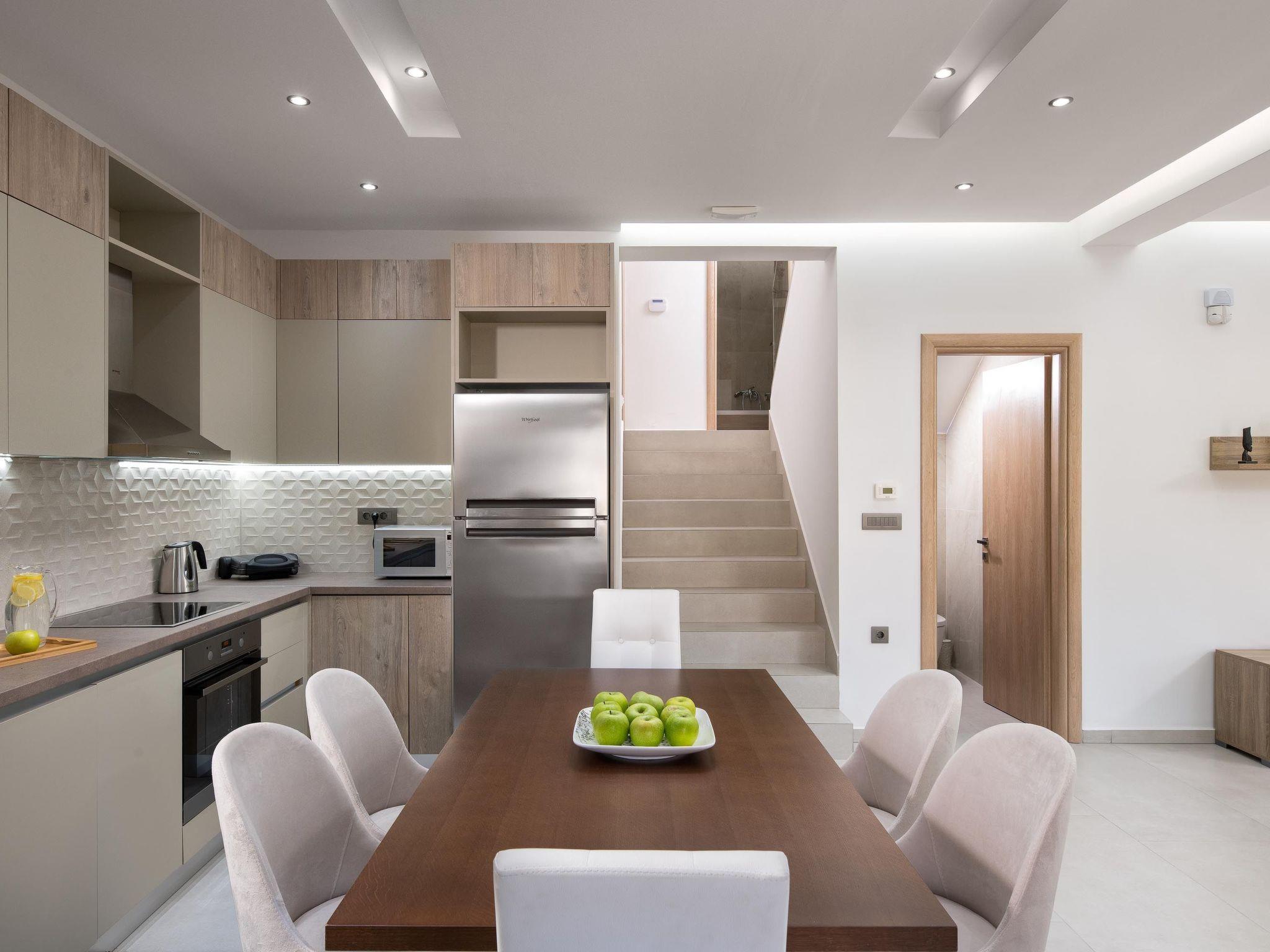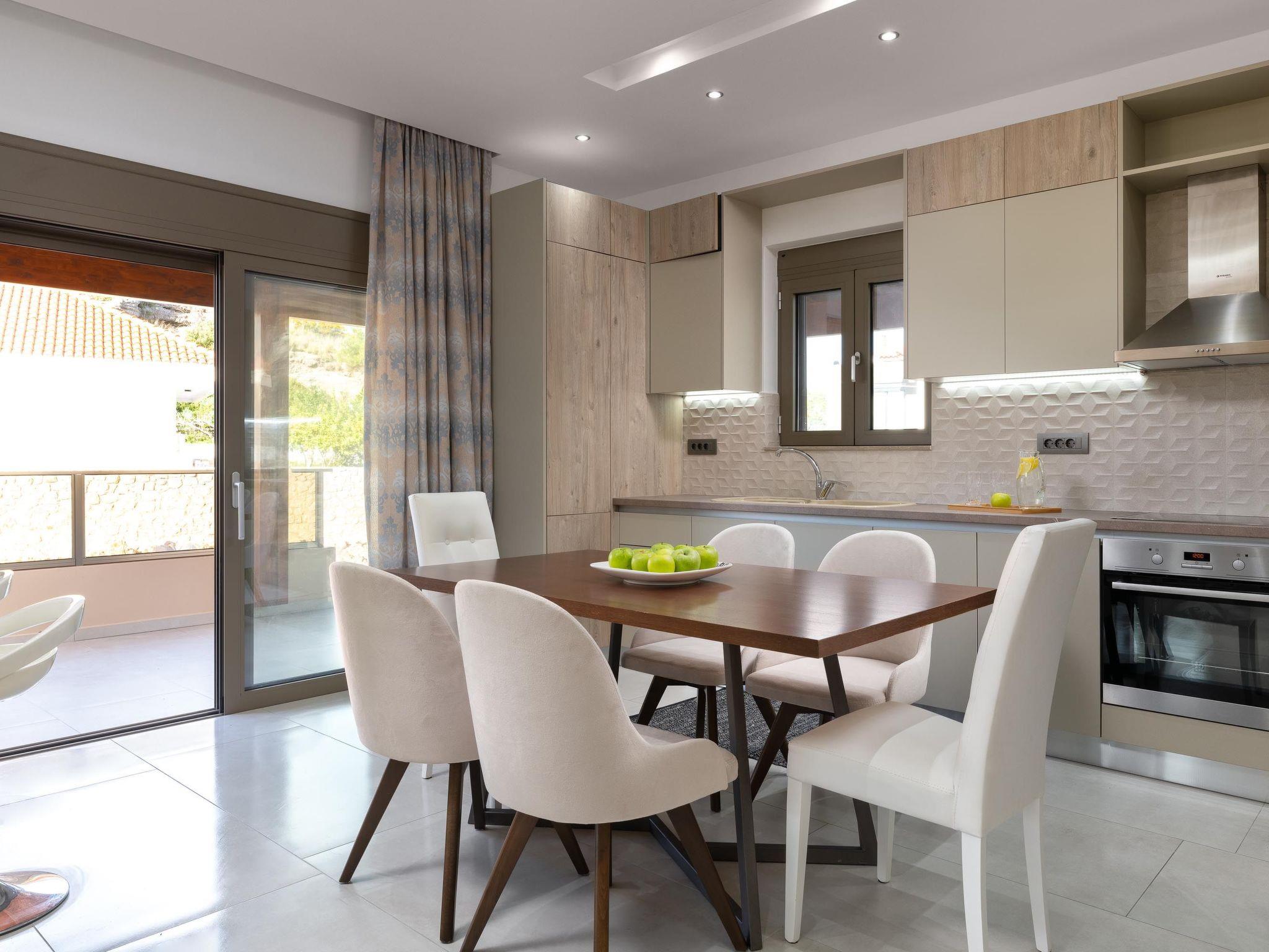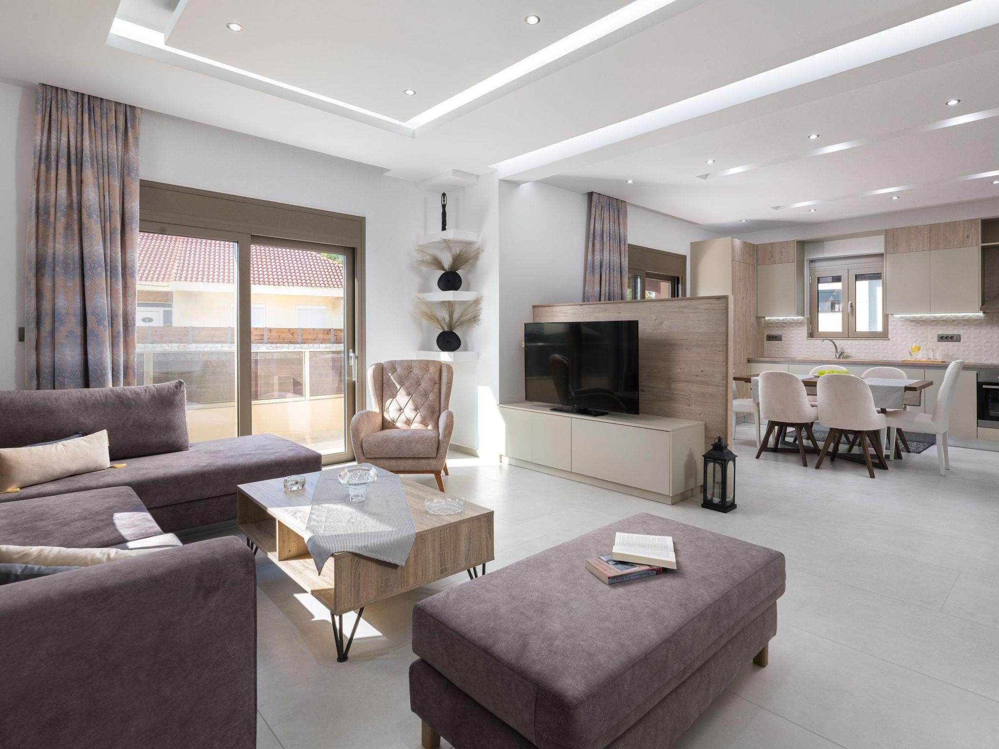 This marvelous luxury villa has 4 fully air-conditioned bedrooms. Half of the bedrooms have kinged sized double beds and the other half have twin beds. Also, there’s a comfy sofa bed in the living area. All bedrooms and areas are fully air-conditioned and have beautiful balconies with an amazing view of Greek nature. There are 2 bathrooms, one ensuite in a bedroom that has a shower, and one sharing that has a relaxing bathtub. On the ground floor, guests will find a fully equipped kitchen, suitable for any meal preparation. The modern kitchen is sharing the area with the living room, designed and decorated in warm tones. There’s free Wi-Fi access throughout the property as well as a smart TV with satellite channels, Netflix and karaoke. Outside is as beautiful as on the inside. There’s an amazing private swimming pool with a soothing unheated Jacuzzi, where you can relax and enjoy your holidays to the fullest. Also, there are BBQ facilities and a sitting area where you can prepare a meal and enjoy a gathering with your loved ones surrounded by beautiful nature.
