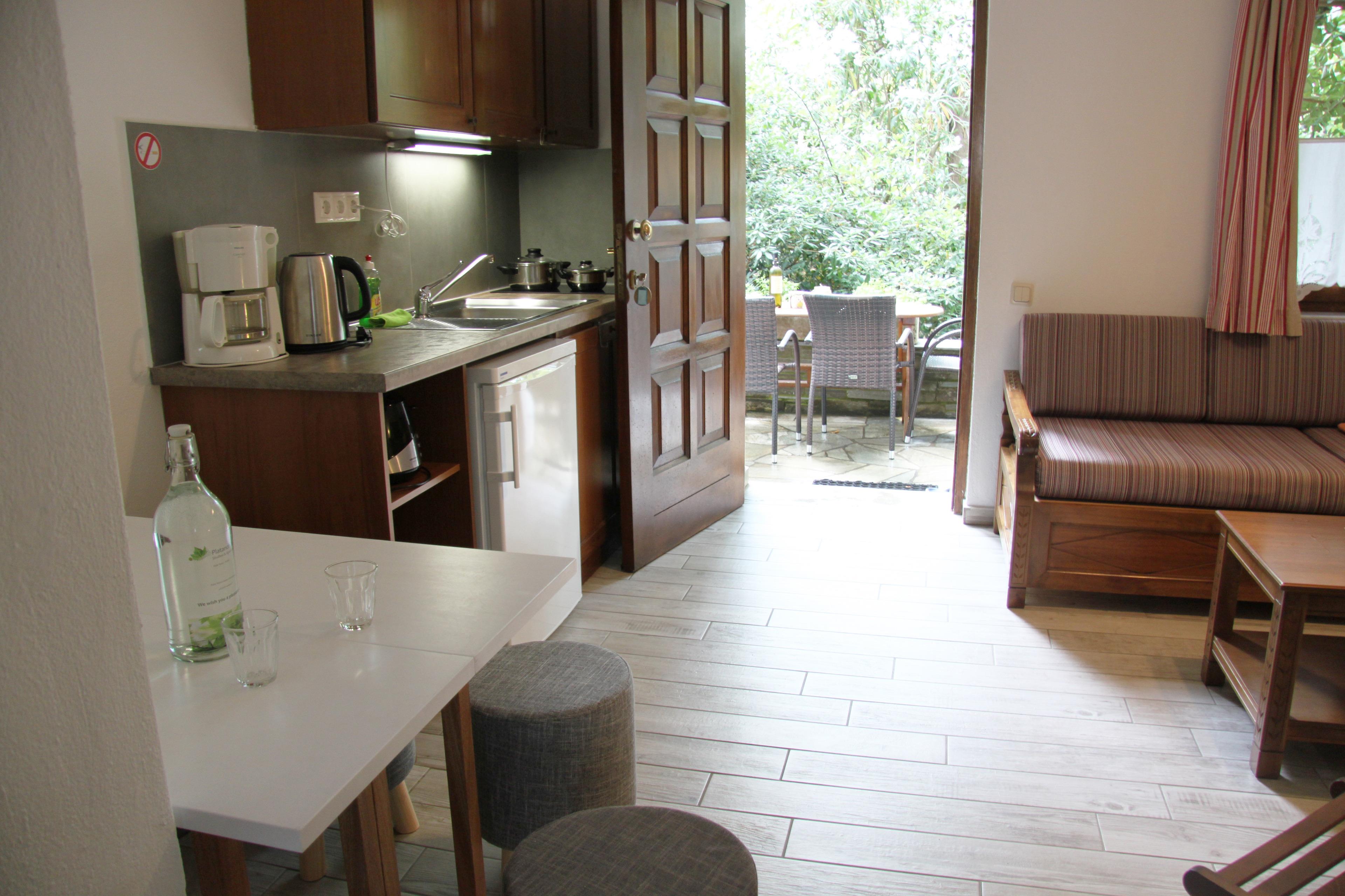 Großzügiges Apartment mit einem abgetrennten Schlafzimmer mit Doppelbett, Wohnzimmer mit Sitzgelegenheit oder zwei Schlafsofas und Küchenzeile, Terrasse mit Blick in den Garten und separatem Eingang. Diese Ferienwohnung eignet sich hervorragend für Familien mit zwei Kindern.