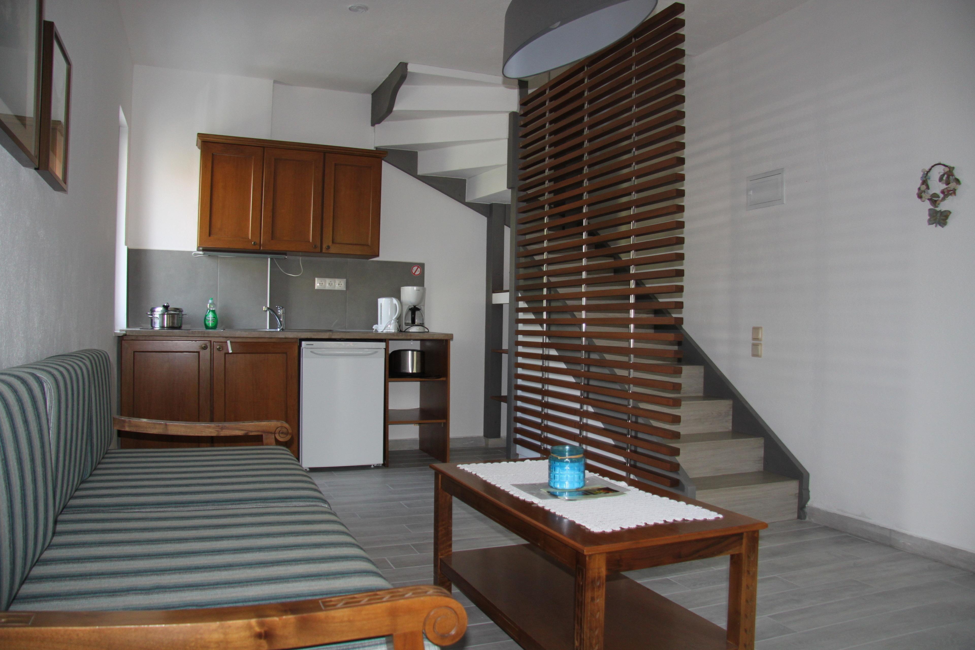 Es gibt zwei baugleiche Maisonetten, die direkt nebeneinander liegen und eine große gemeinsame Terrasse nutzen, mit Blick in Richtung Meer und Garten. Diese sind großzügige, geräumige und funktionelle Apartments mit einer Innentreppe, welche Wohn- und Schlafraum mit dem ersten Stock verbindet.