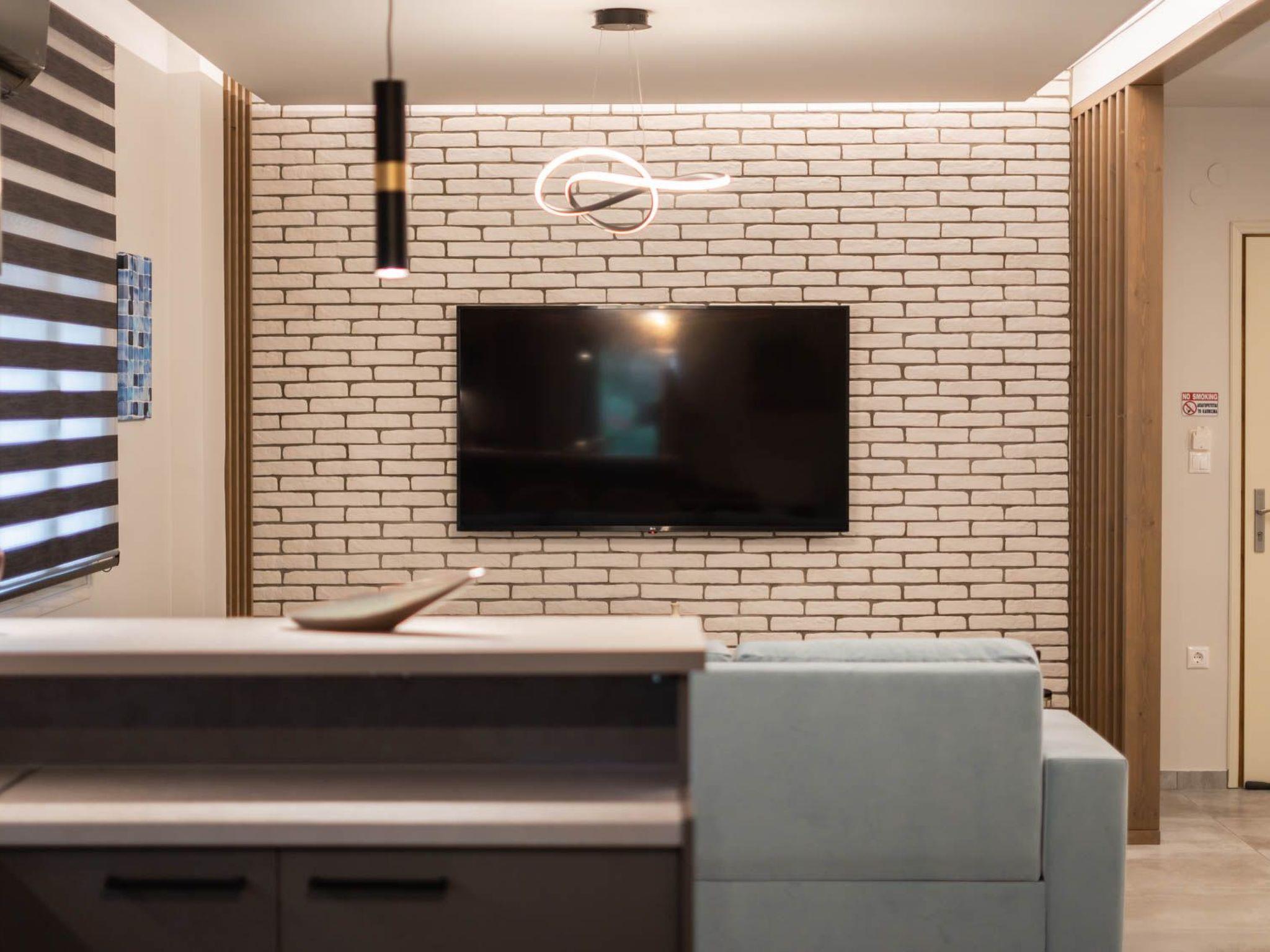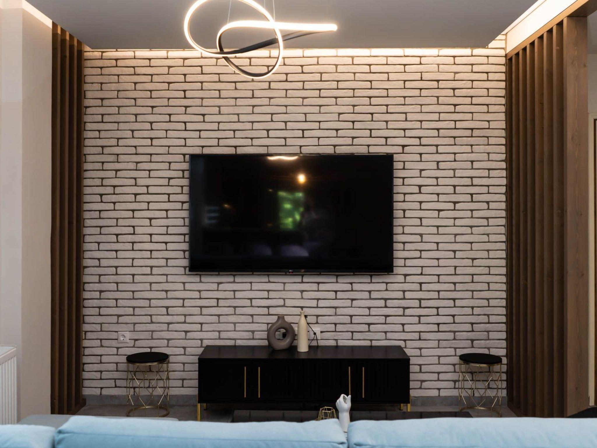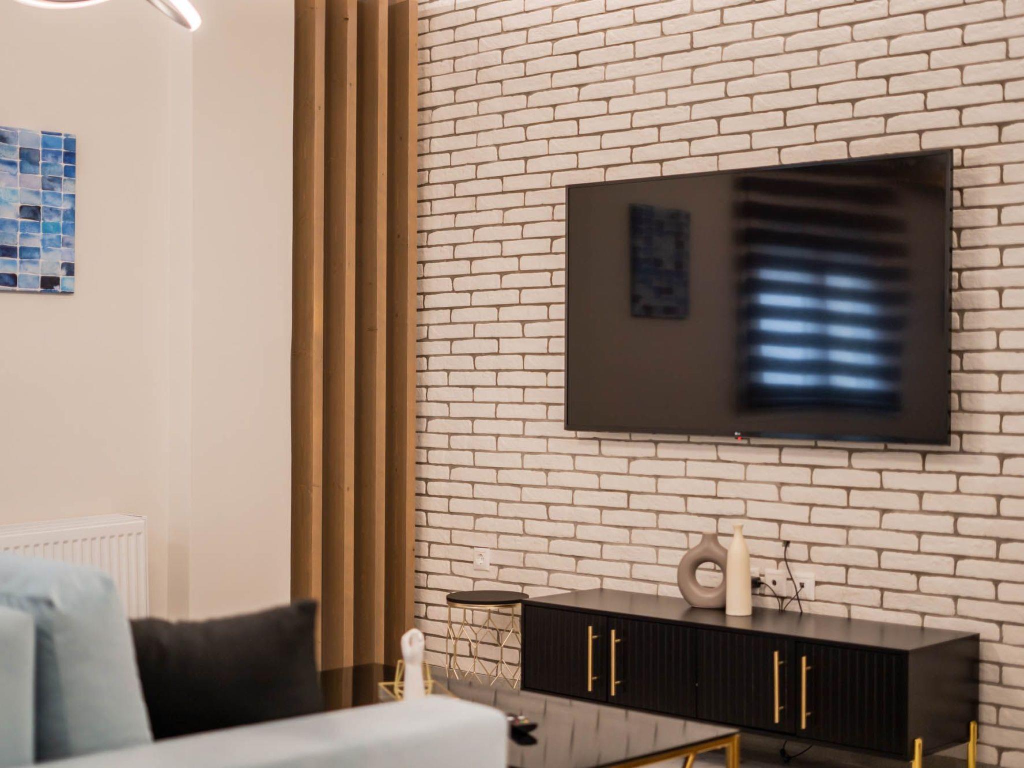The heart of the apartment is the cozy living room, thoughtfully furnished with a convertible sofa that effortlessly transforms into an additional bed. This provides sleeping accommodations for up to six people, making it a perfect choice for families or groups of friends traveling together. As night falls, gather around the large smart TV, which is equipped with internet access, in each of the three rooms. The expansive screen in the living room ensures that your movie nights are nothing short of spectacular.