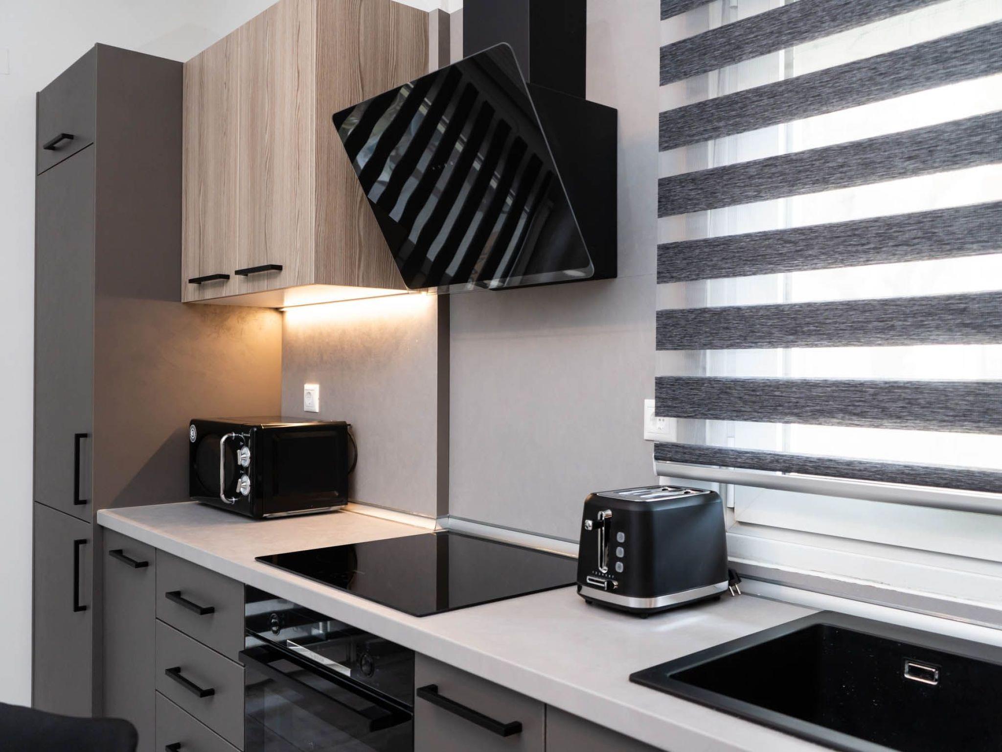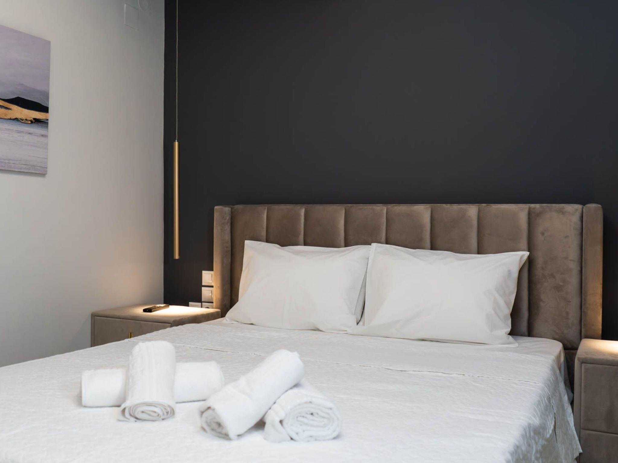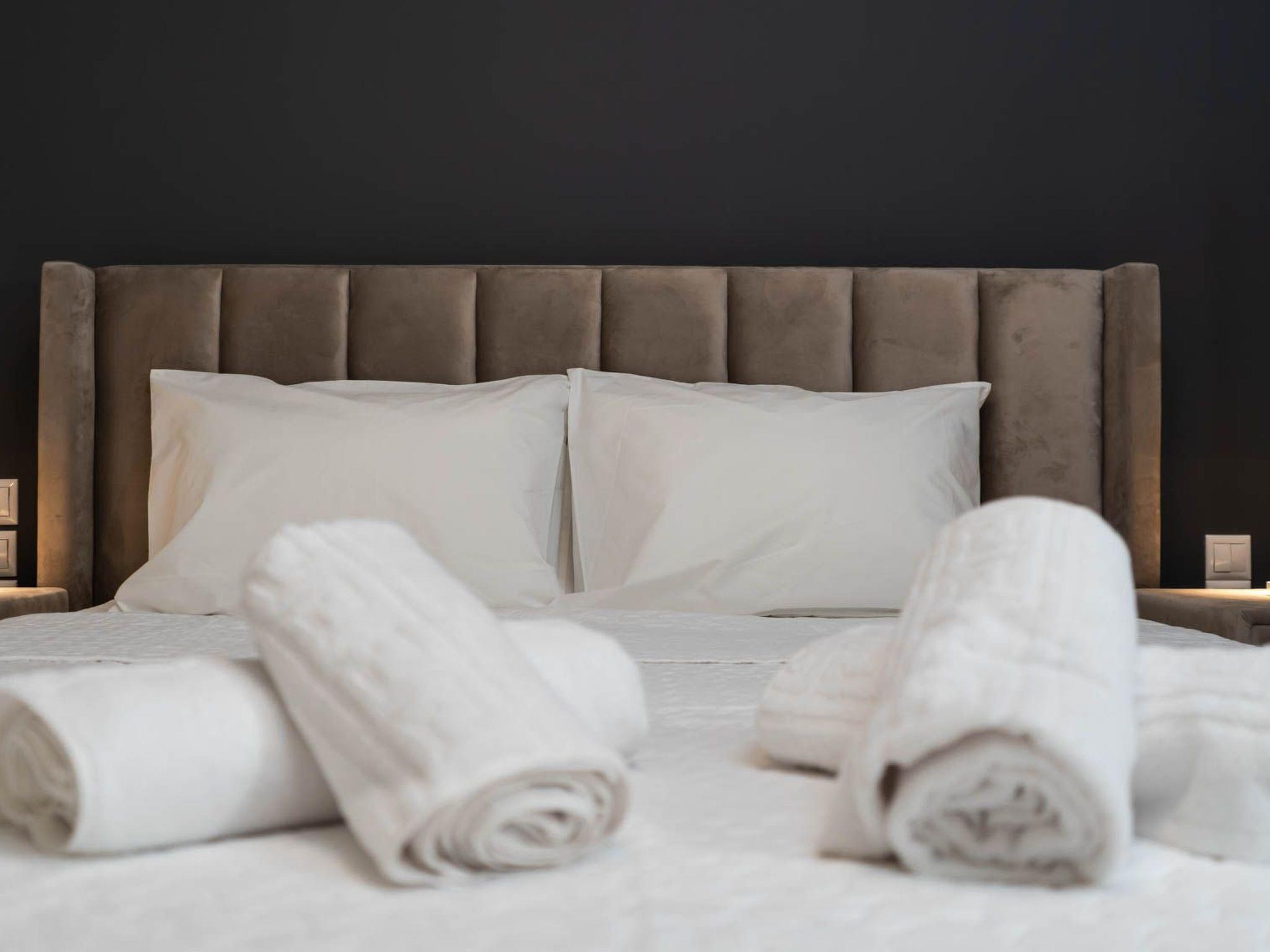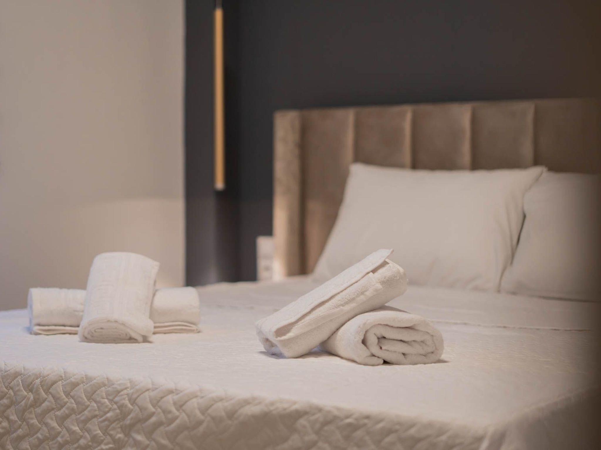 The heart of the apartment is the cozy living room, thoughtfully furnished with a convertible sofa that effortlessly transforms into an additional bed. This provides sleeping accommodations for up to six people, making it a perfect choice for families or groups of friends traveling together. As night falls, gather around the large smart TV, which is equipped with internet access, in each of the three rooms. The expansive screen in the living room ensures that your movie nights are nothing short of spectacular.