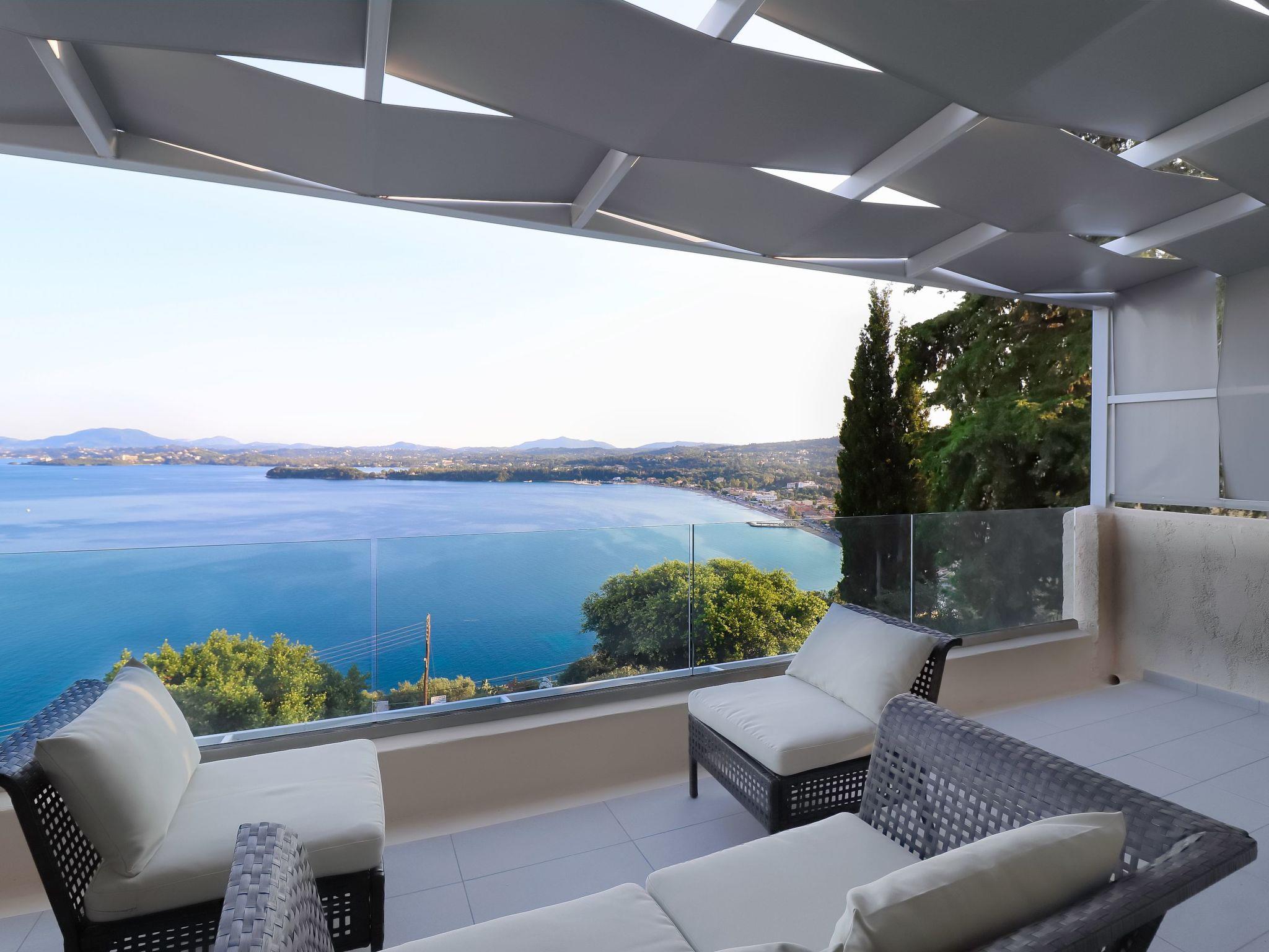 Villa Faiax in a peaceful location with uninterrupted sea views over the bay of Ipsos, two minutes’ walk to restaurant, cafe & bar (Grand Balcon & Off Town) and a 15 mins walk down to the Beach & Water Front Restaurants of Ipsos beach.Suitable for up to 10 people, ideal for large families and groups of visitors. Three storey building that consists of 4 bedrooms, all with ensuite bathrooms, large pool with panoramic sea view, fully equipped kitchen, smart TV, WIFI, AC. There is a spacious open-plan sunken lounge with comfortable sofas, huge wall-mounted TV and dining area all with French windows opening onto the very large patio areas with glass walls to enjoy the stunning views.On the second floor there is the spacious lounge with stylish modern furniture and atmosphere, Smart led TV, dining room and fully equipped modern kitchen. The large glass window offers plenty of light and coolness, while from the terrace of the lounge you can enjoy the magnificent sea view! The spiral staircase brings you to the top floor where there are three good size fully fitted bedrooms each with super comfortable beds ensuring a perfect night’s sleep (One King-size bedroom and two twin rooms with single beds which can be zipped together to form Super-Kings). Each bedroom has its own en-suite contemporary shower room, wall mounted flat screen TV, fitted wardrobes and safety deposit box.The large fully equipped kitchen is there for you to prepare your meals and breakfast. With microwave oven, Nespresso coffee maker, refrigerator, dishwasher, ceramic hob, oven, toaster and kettle.Going out, the pool dominates the area with its exhilarating tranquility. You may even want to spoil yourself with a traditional Greek meal using the B.B.Q. The large dining area there can accommodate barbecue or cocktail nights, enjoying the magnificent view. There is also outdoor showers and small fridges, serving the pool area. Finally, a spacious garage area offers shade up to two cars.The location allows for great privacy while being within walking distance of the beautiful beach of Ipsos. The strategic location of the villa gives you the opportunity to visit Corfu Town, the largest water park on the island as well as its most popular beaches within 20 min drive.
