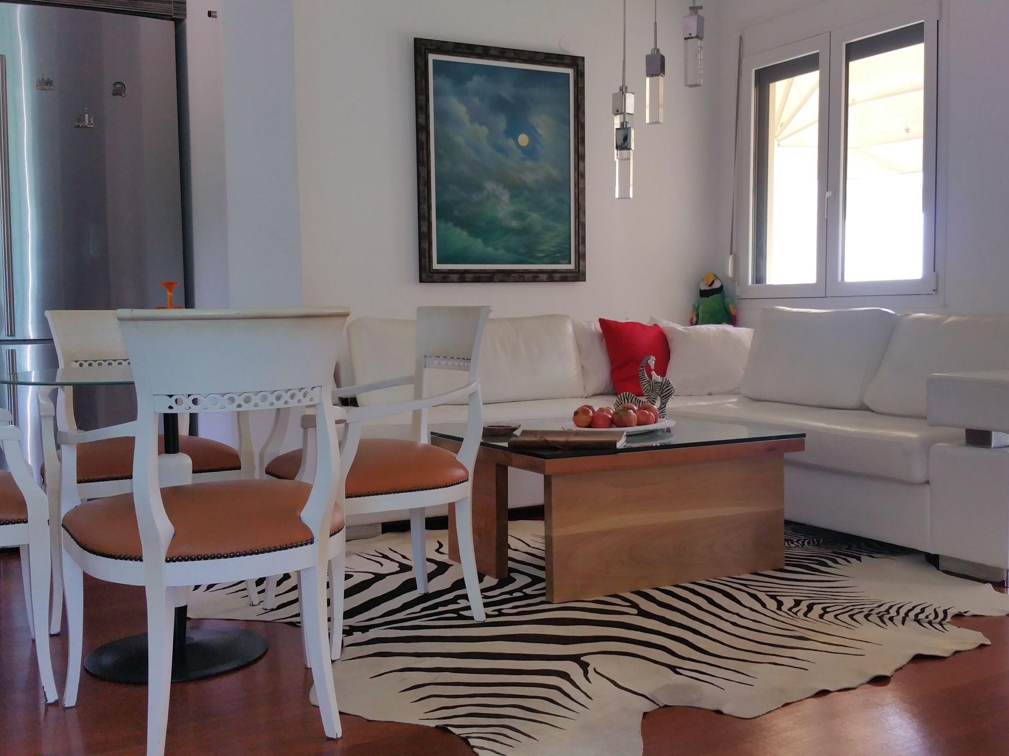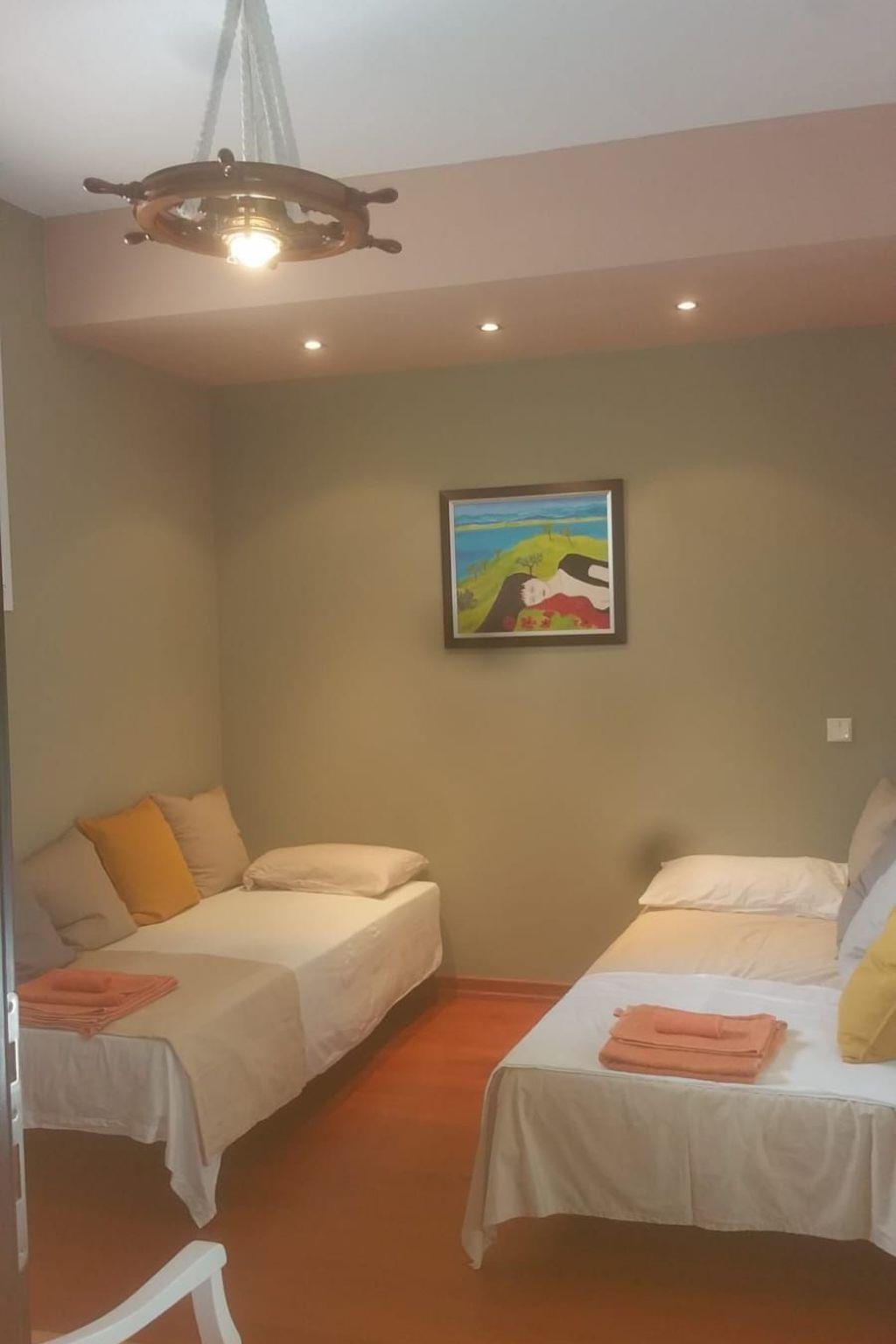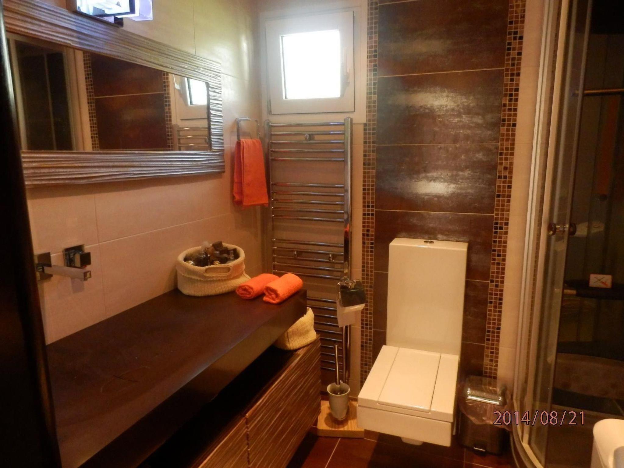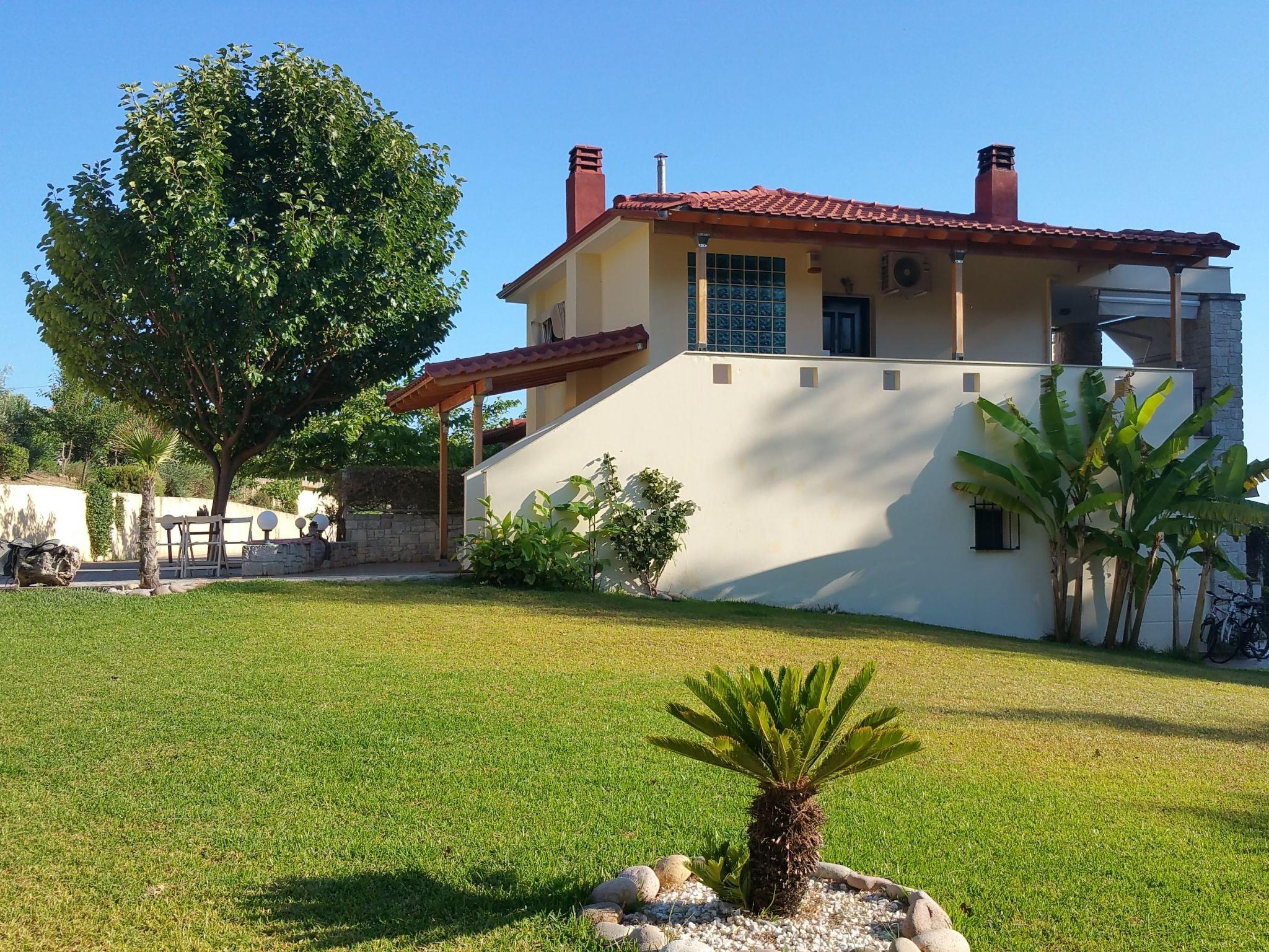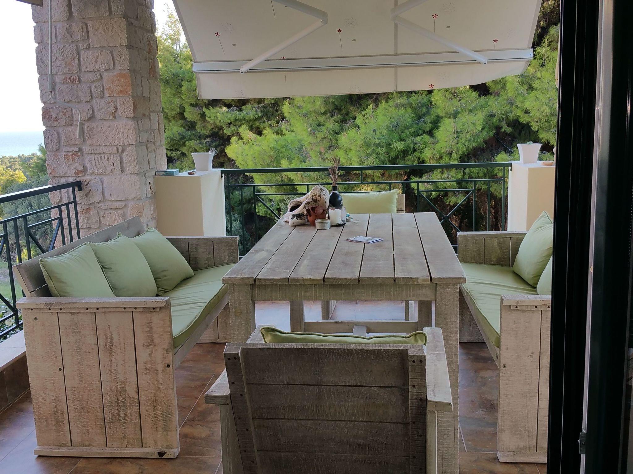 This very tasteful and comfortable holiday home is located on the outskirts of Possidi on a beautiful sandy beach. It is the end house of a row of houses and is situated directly on a small hill, surrounded by many trees of the neighbouring forest and many plants. The house is 100m² in size and has two floors. On the lower floor are the three bedrooms, which were freshly renovated in summer 2021. One of them is furnished with two single beds and a wardrobe. The other two bedrooms each have a double bed. A set of changeable bed linen is available for all beds. On this floor you will find the bathroom with WC, washbasin and a modern shower and steam cabin. Towels and a washing machine are available here. There is a small minibar with fridge in the hallway where you can store your drinks. The upper floor of the house consists of the living and kitchen area. There is a cosy leather sofa in the large living room. On cooler evenings, you can relax here in front of the fireplace. The open-plan kitchen is modernly equipped with an electric cooker (ceramic hob), oven, toaster, kettle and large fridge with freezer compartment. Four people can sit at the round table. The second bathroom with WC, washbasin and shower is located on this floor. All windows in the house are fitted with mosquito screens. The large balcony gives the house a special touch, as here you can enjoy the view of the forest all the way to the sea while smelling the conifers. There is a private barbecue and parking for up to three cars. The residential complex's pool can also be used. This is shared with 5 other holiday homes. Possidi is located on the first finger of the Halkidiki peninsula. The village has marvellous sandy beaches where you can enjoy the sunsets with an enchanting view of Olympus, the mountain of the gods. Small tavernas right on the beach, pizzerias, fast food outlets, bars, souvenir shops and a small supermarket can be reached on foot in approx. 15 minutes, the beach in 10 minutes. If you are travelling by car, you will find parking facilities everywhere. The journey from the nearest airport in Thessaloniki takes approx. 1 hour and 15 minutes by hire car.