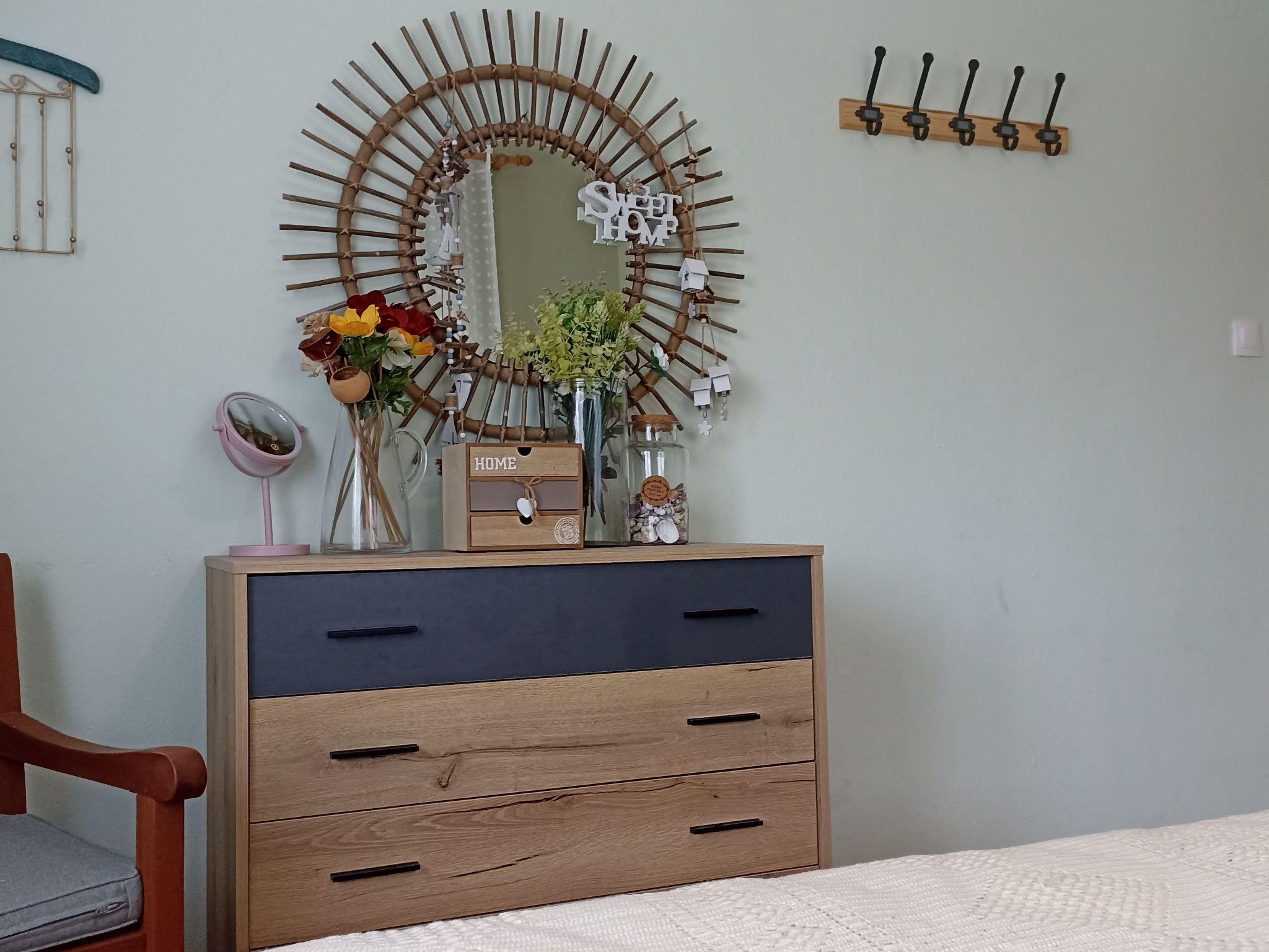 L'intérieur de la villa comprend deux chambres confortables, un salon spacieux, une cuisine entièrement équipée et une salle de bains. Chaque pièce a été meublée avec goût, mêlant pièces originales et décoration élégante pour créer une atmosphère chaleureuse, reflet du style grec local. Le balcon, offrant une vue directe sur la mer, complète cet intérieur harmonieux et accueillant.