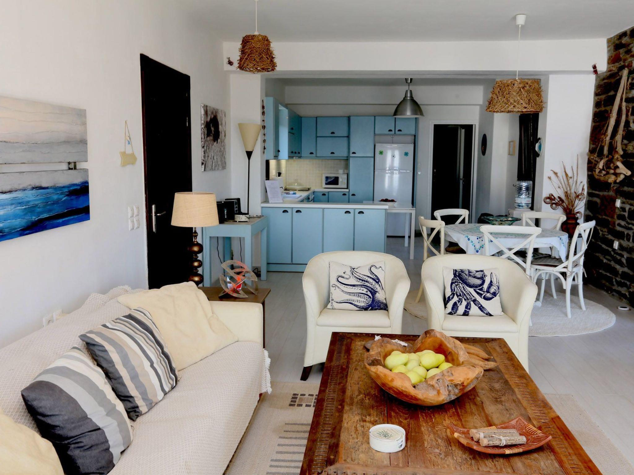 1 km for tavernas and shopping and organized beach, 3 km to water sports beach. In Kastellakia Bay on Kea island in the Cyclades, this holiday villa has access to the Kastellakia Beach and amazing sunset views 100 meters from the house. Access to Kea from Athens and its airport is easy, swift (door to door in 2 hours).