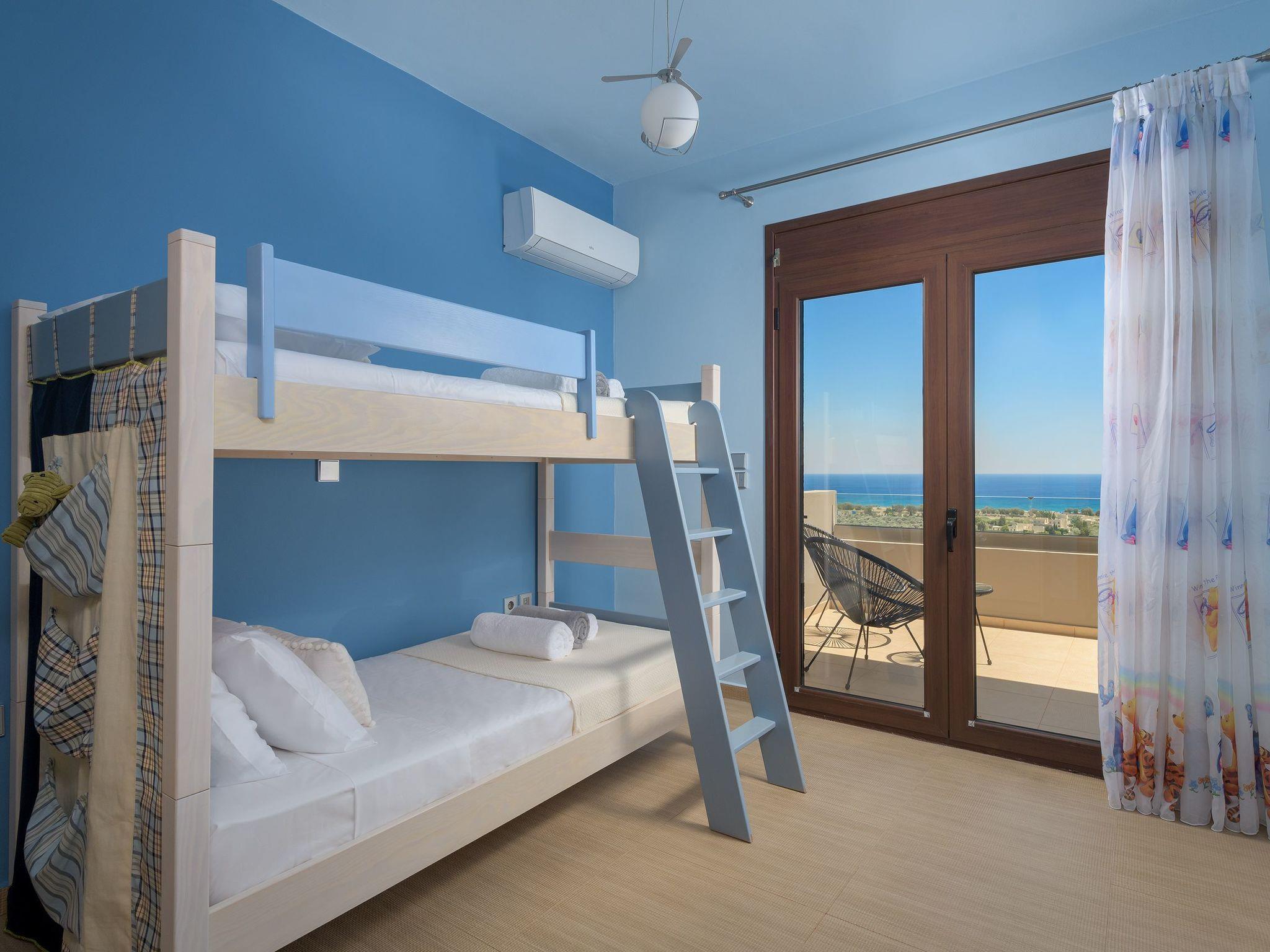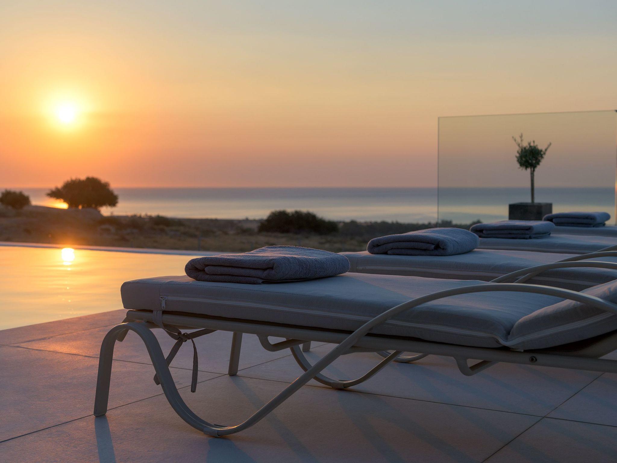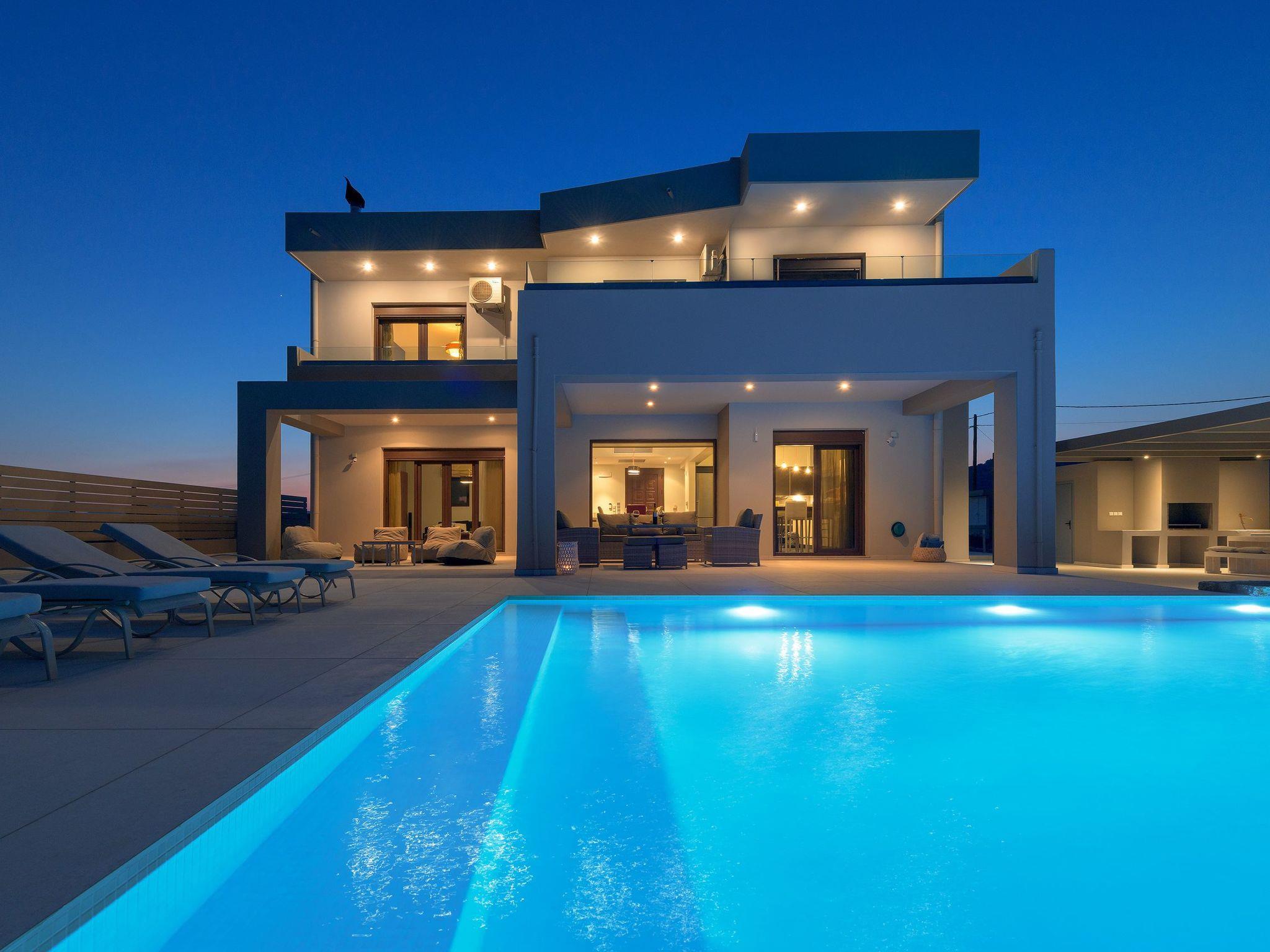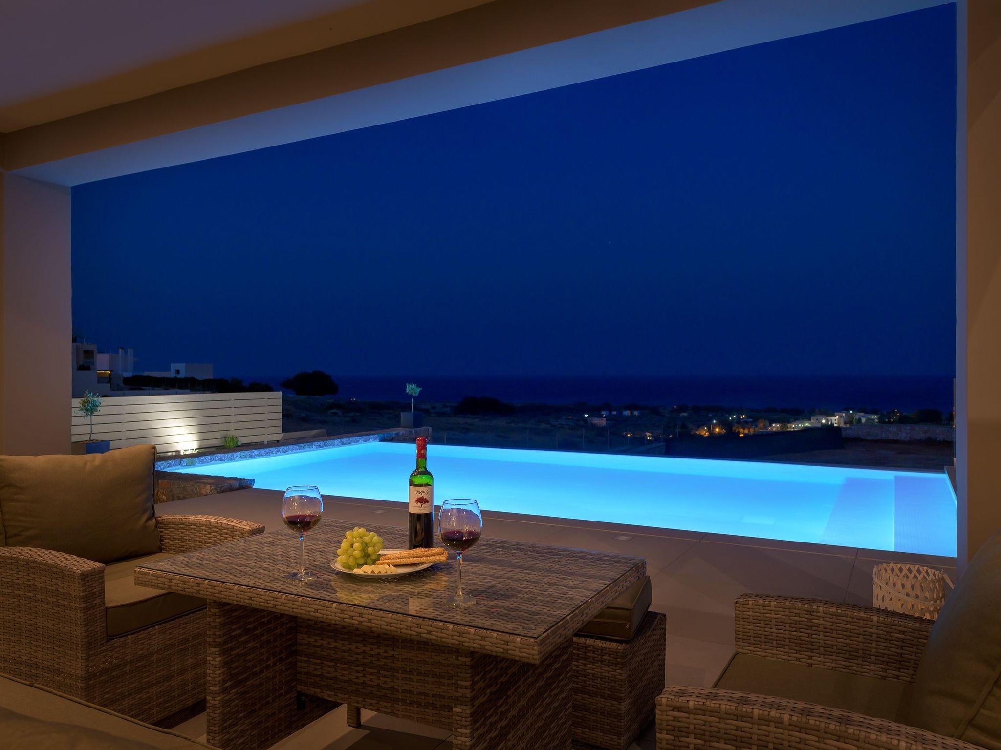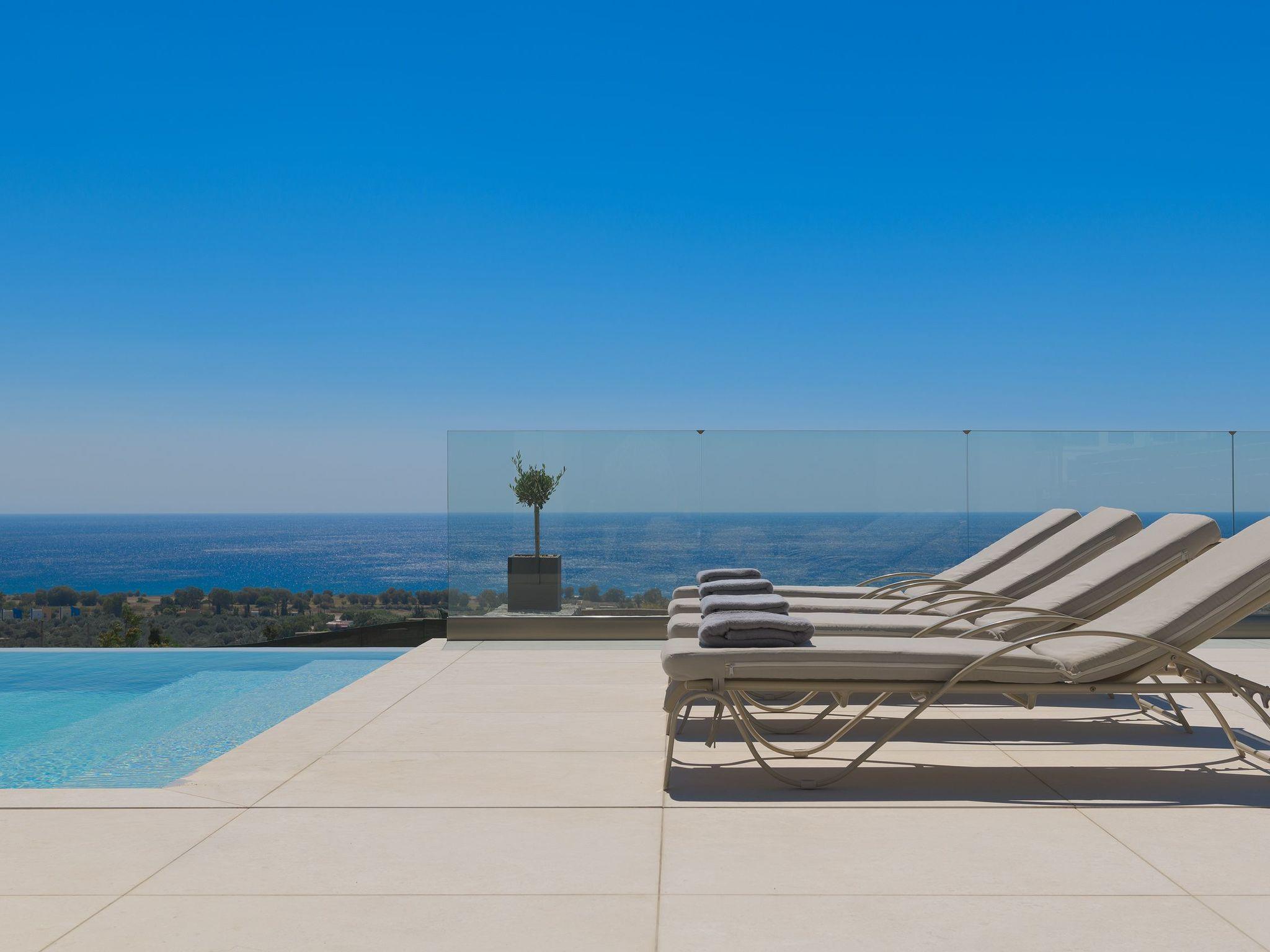Alav Pool Villa has two floors and provides over 200sqm of living space. You will find four bedrooms, 3 with double beds and one with bunk beds. All bedrooms are fully air-conditioned and have a unique style and character. All the upstairs bedrooms open to their private furnished balconies where you can find the ideal place to relax and let yourself be mesmerized by the amazing sea view. There are three bathrooms and a WC. One of the bathrooms has a bathtub and the others have a shower. On the ground floor, you can find a modern, fully equipped kitchen with all the necessary equipment and appliances to prepare fantastic meals, as well as a conveniently arranged dining area with a great view of the sea stretching into the horizon. Also, guests will find the lounge where you can relax on the comfortable, stylish couch and enjoy the entertainment center. There are a screen Tv and free wifi access throughout the property. The lounge offers access to the furnished verandas and the pool area. The elegant contemporary design of the outdoor facilities of Alav Pool Villa combine a 45 sqm infinity style pool, as well as an oversized terrace with a built-in BBQ, a dining area, and a wc. Children will surely appreciate the grassy area with the mini football pitch, where they can spend their time carefree. In the evening you can make the most of the BBQ installation and the outdoor kitchen facilities, and dine under the magnificent starry summer sky.
