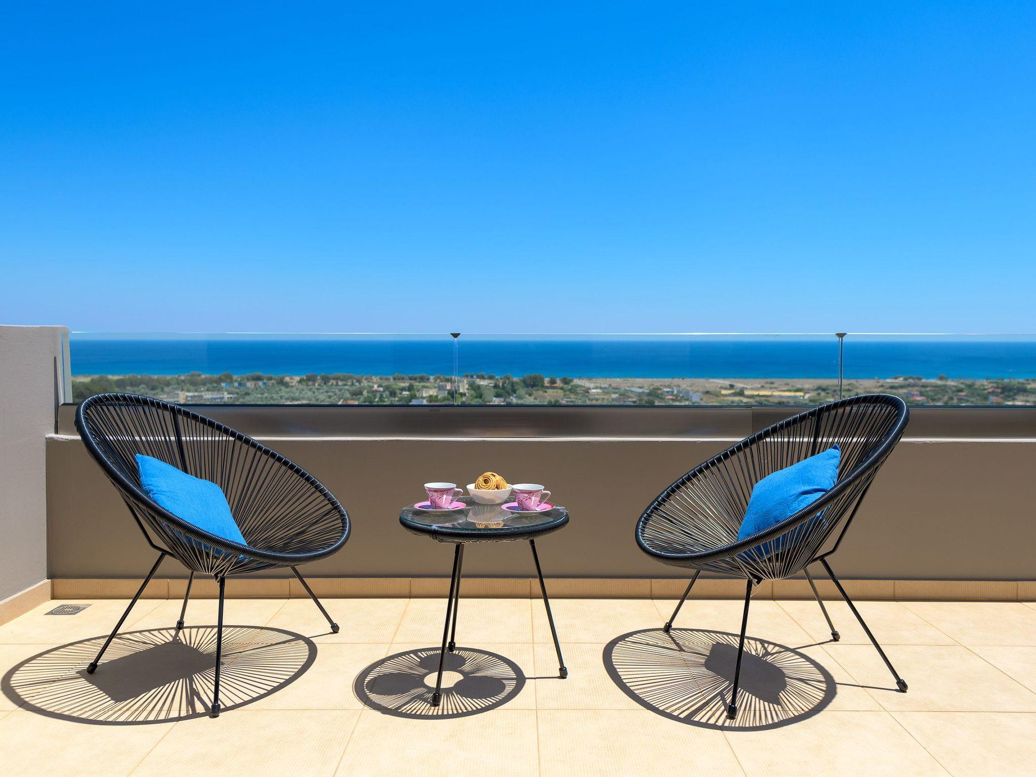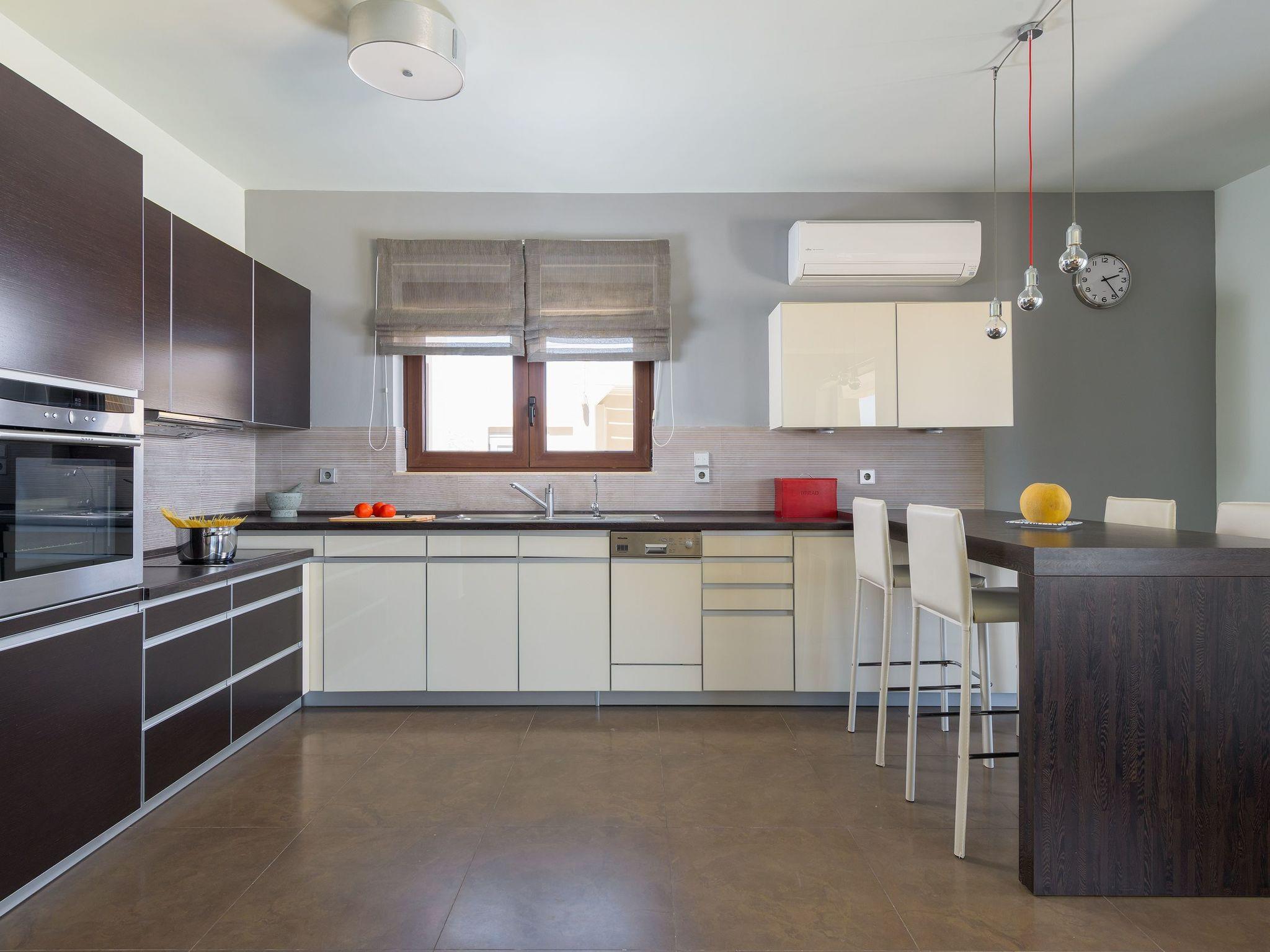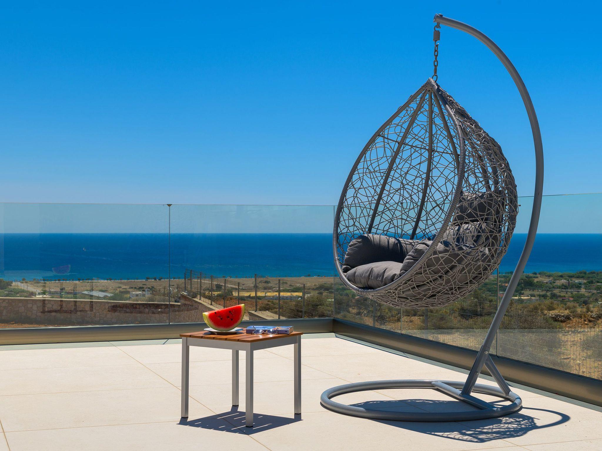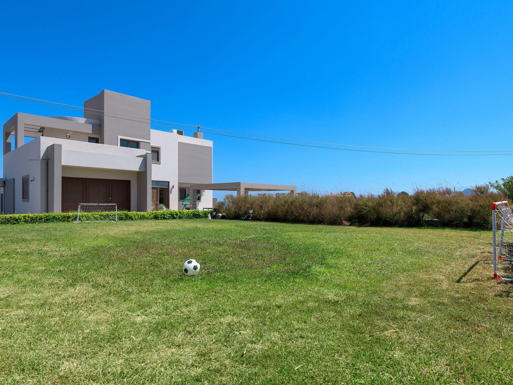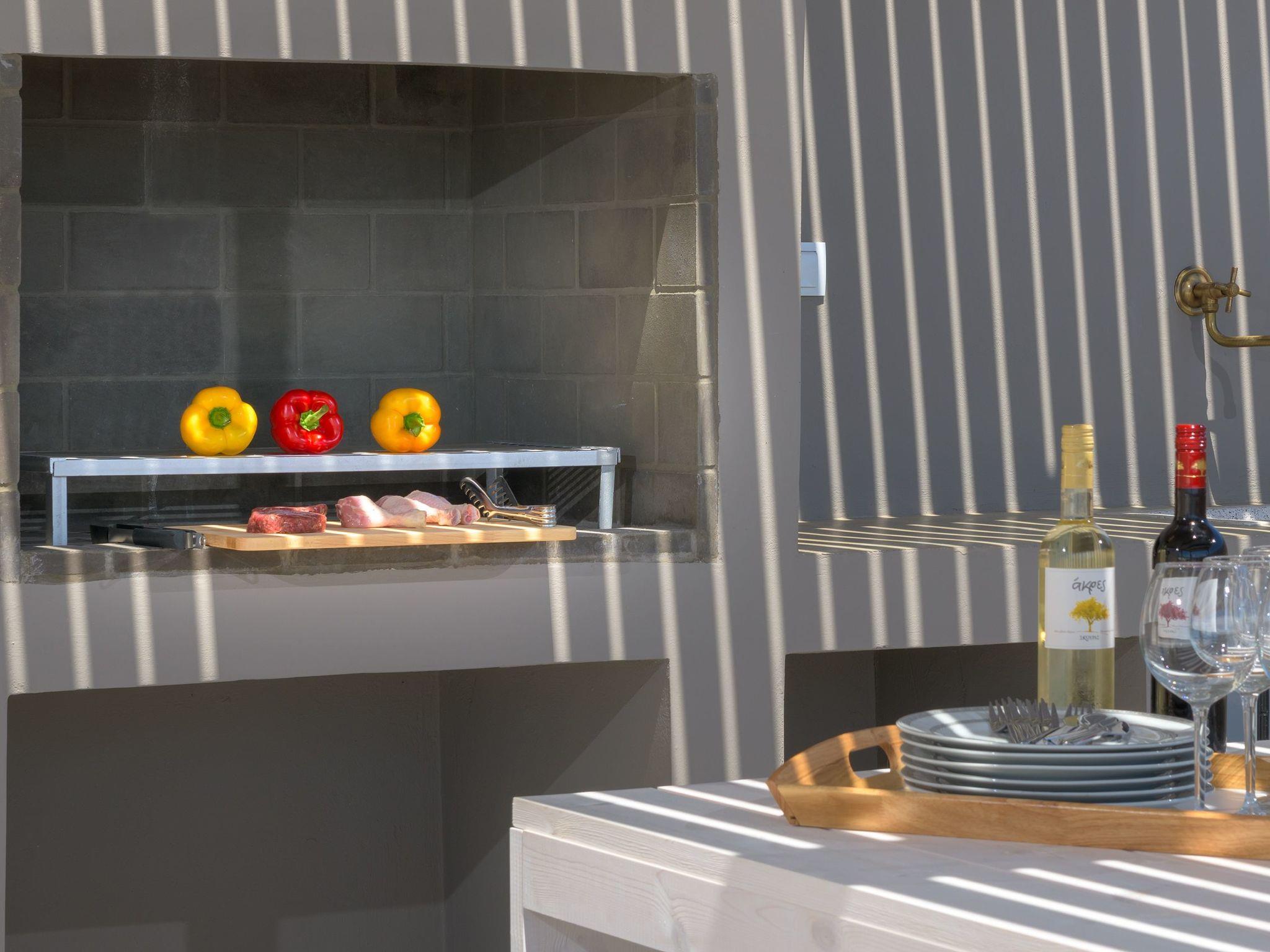 Alav Pool Villa has two floors and provides over 200sqm of living space. You will find four bedrooms, 3 with double beds and one with bunk beds. All bedrooms are fully air-conditioned and have a unique style and character. All the upstairs bedrooms open to their private furnished balconies where you can find the ideal place to relax and let yourself be mesmerized by the amazing sea view. There are three bathrooms and a WC. One of the bathrooms has a bathtub and the others have a shower. On the ground floor, you can find a modern, fully equipped kitchen with all the necessary equipment and appliances to prepare fantastic meals, as well as a conveniently arranged dining area with a great view of the sea stretching into the horizon. Also, guests will find the lounge where you can relax on the comfortable, stylish couch and enjoy the entertainment center. There are a screen Tv and free wifi access throughout the property. The lounge offers access to the furnished verandas and the pool area. The elegant contemporary design of the outdoor facilities of Alav Pool Villa combine a 45 sqm infinity style pool, as well as an oversized terrace with a built-in BBQ, a dining area, and a wc. Children will surely appreciate the grassy area with the mini football pitch, where they can spend their time carefree. In the evening you can make the most of the BBQ installation and the outdoor kitchen facilities, and dine under the magnificent starry summer sky.