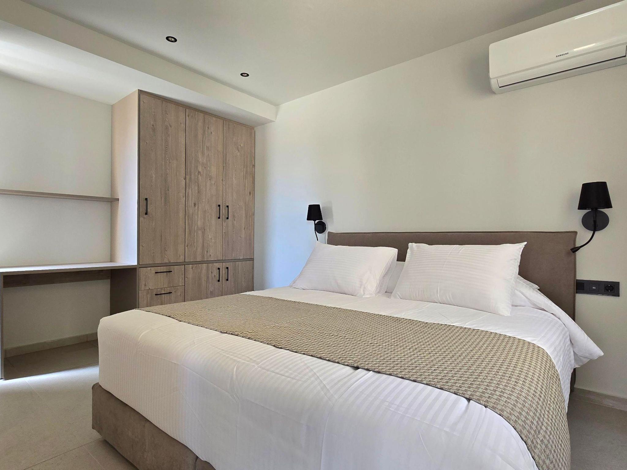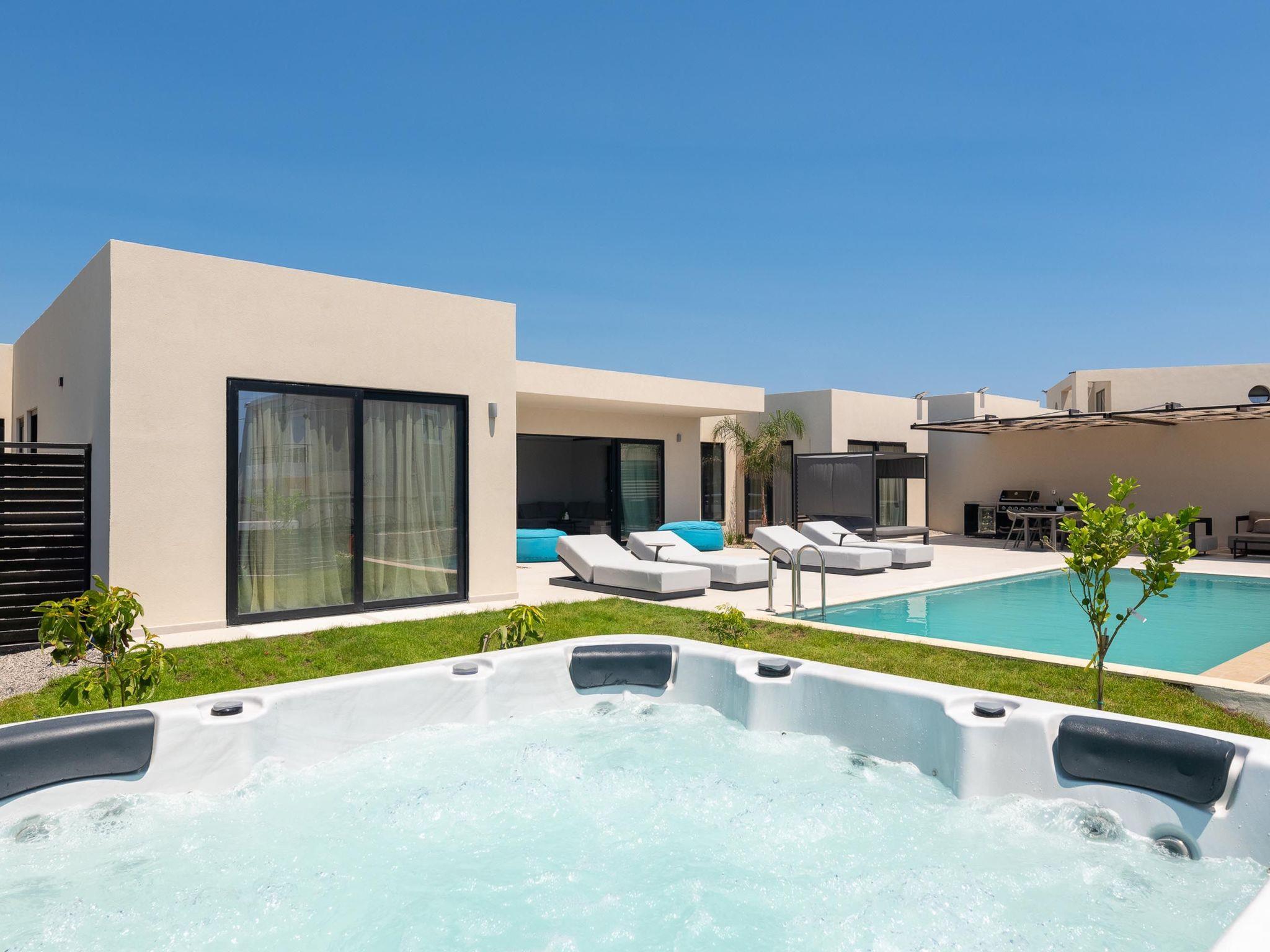 Welcome to the magic luxury living of Trapezia Villas. Trapezia Luxury Living boasts a stunning design that combines modern aesthetics with timeless elegance. Every detail is meticulously crafted to create a sophisticated and luxurious atmosphere. They offers expansive living spaces, including large living rooms, dining areas, and three fully equipped bedrooms with en-suite. The high ceilings and open floor plan enhance the sense of grandeur and provide ample room for relaxation and entertainment. All Trapezia villas are equipped with top-of-the-line amenities to ensure an unparalleled experience of luxury. From a fully-equipped outdoor gourmet kitchen to a private swimming pool and spa, every aspect of comfort and indulgence is taken care of. Trapezia Luxury Living is the epitome of opulence and sophistication, offering a truly exceptional living experience for those seeking the finest in accommodation.Type B villas are one floor detached luxury villa that hosts up to 6 guests. There are 3 fully air-conditioned bedrooms with unique decorations. All of the bedrooms offer ensuite bathrooms with a shower. There’s a fully equipped kitchen in warm colors, suitable for any meal preparation accompanied by the seating area and the living room. There’s a smart TV and free WIFI access throughout the property. Outdoors, there’s a private swimming pool and jacuzzi with sunbeds and a seating area where you can relax under the rays of the Aegean sun. You can spend your time by your private swimming pool or enjoy a fresh meal prepared in the BBQ installation. This amazing property and the beautiful location make the perfect match for a memorable stay and unforgettable holidays in Rhodes!