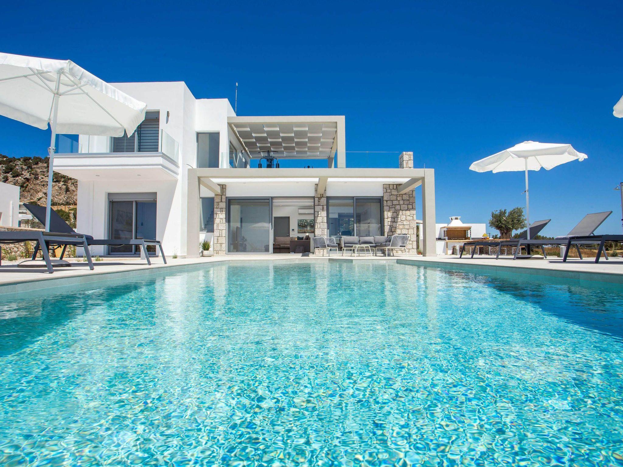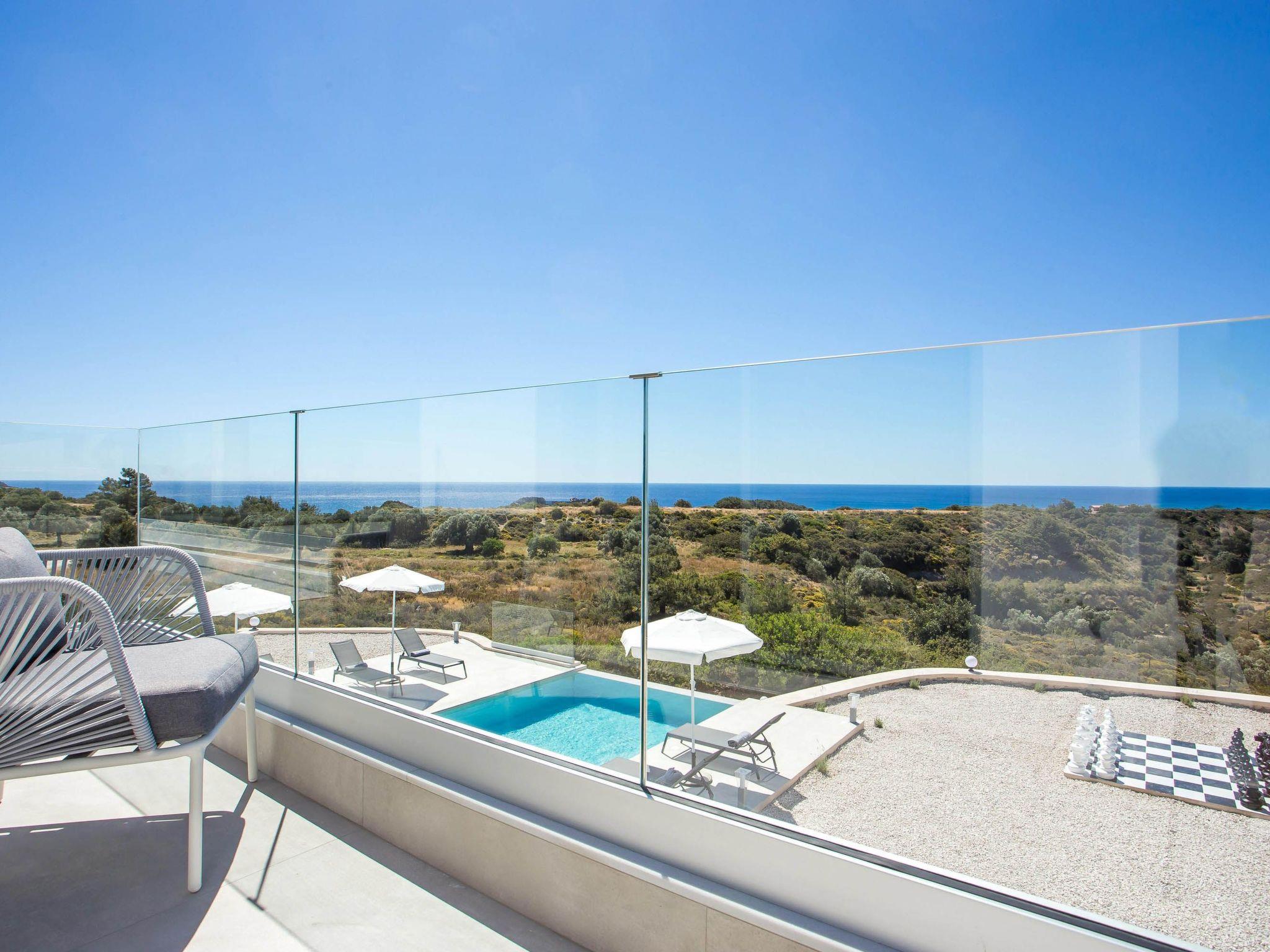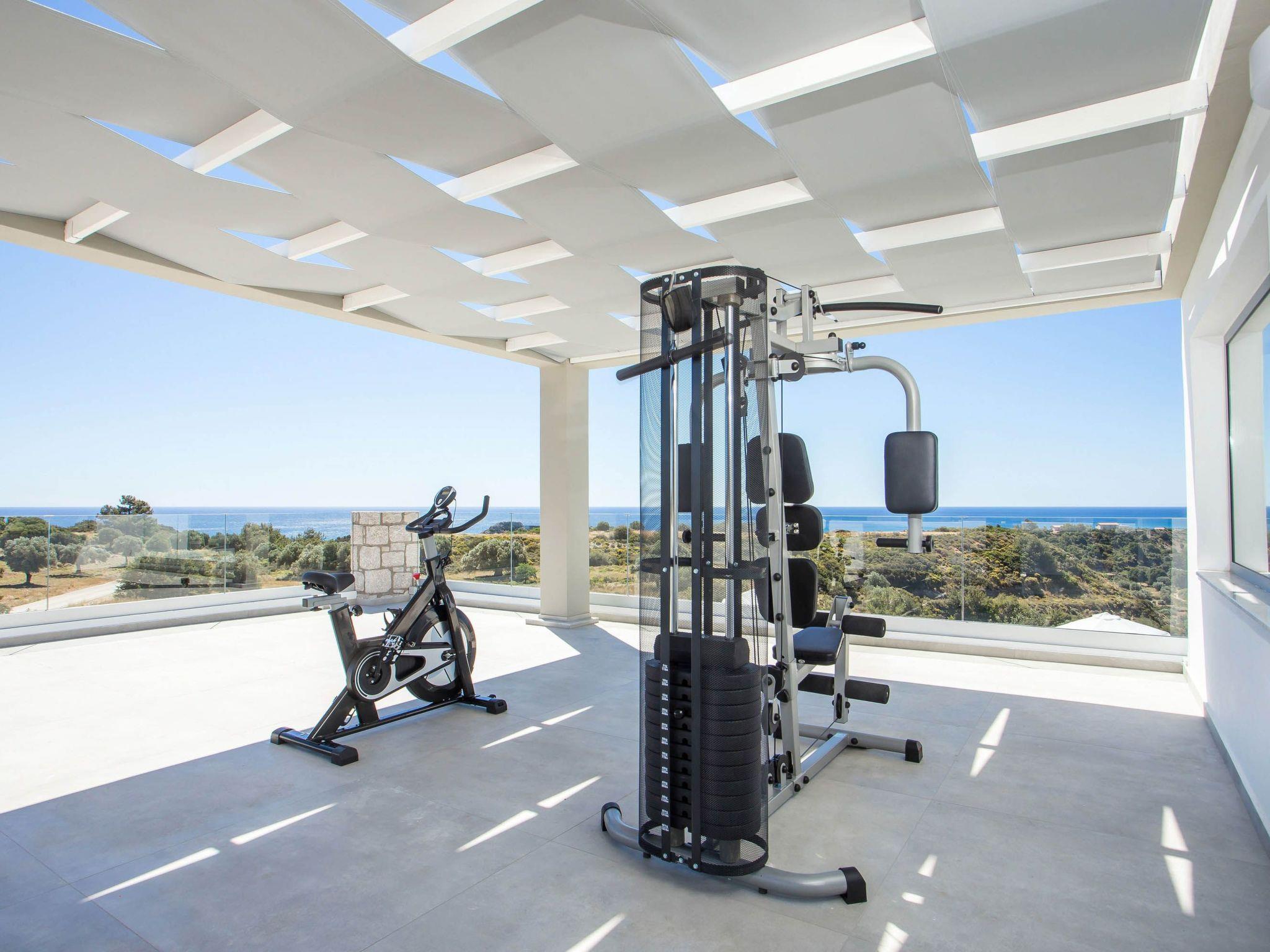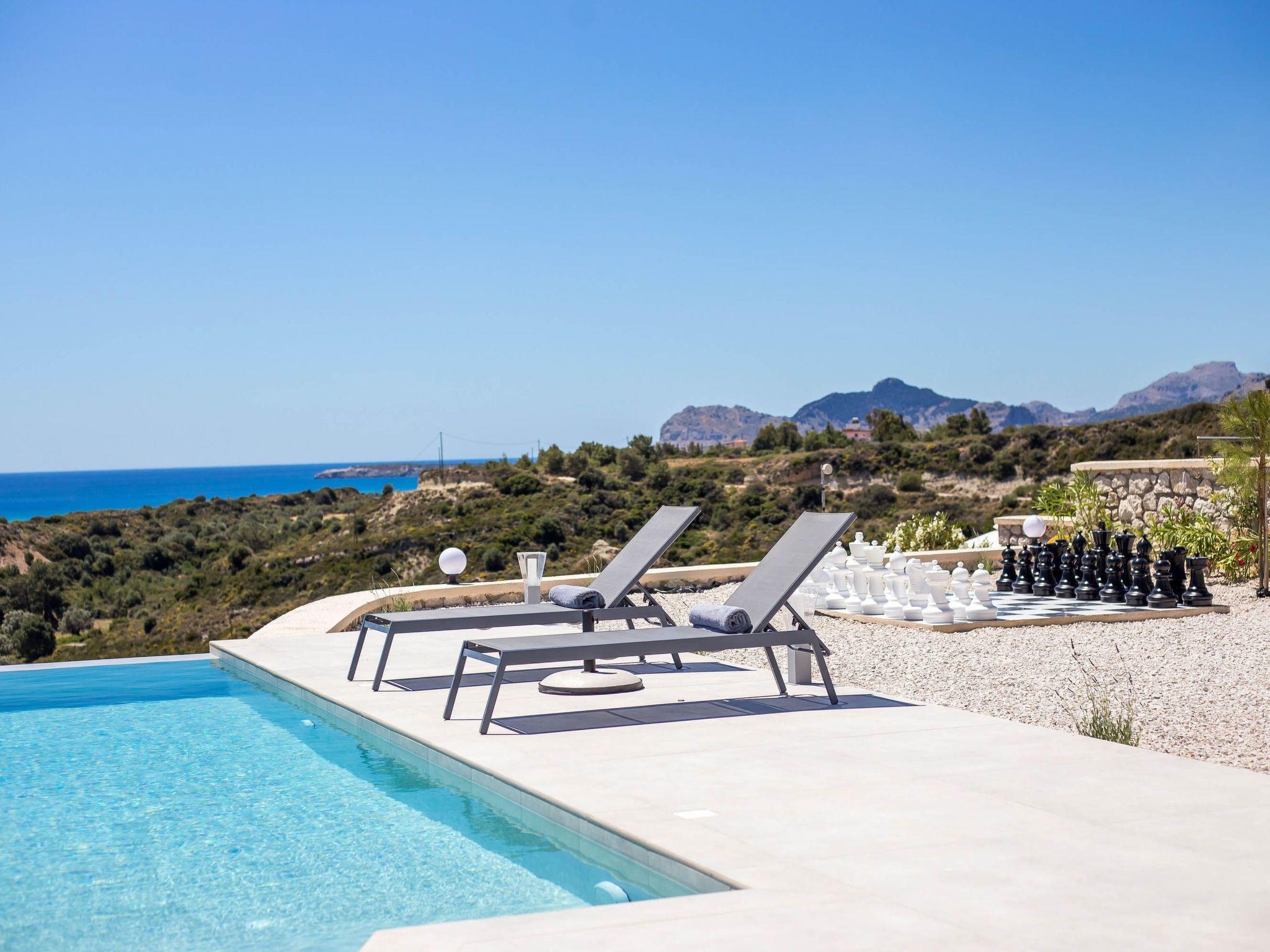 Your house in Rhodes combines comfort, relaxation, and luxury in a great location of Psalidi near all kinds of conveniences and places of interest. It offers a stunning private swimming pool and a contemporary design that will steal your heart. Also, the villa has an amazing view of the sea and is quite close to the cleanest beach of the island, Traganou beach, in only a 10-minute drive. Ideal for families and groups of friends, it accommodates up to 6 people.This stunning villa has 3 fully airconditioned bedrooms, one with a king-sized bed and 2 with double beds. Two of the bedrooms feature ensuite bathrooms with a shower. Also, there is a sharing bathroom with a shower as well. The decoration style in warm colors will make you relax and enjoy your holidays to the fullest. Guests will find a fully equipped kitchen suitable for any meal preparation as well as a seating area. Also, there is a living room with a smart Tv with cable channels and Netflix where you can relax and enjoy your company while arranging your next outdoor activity! All areas are fully air conditioned and there is free WIFI access throughout the property. Outdoors, there is a marvelous private swimming pool surrounded by its sunbeds and the breathtaking sea view. You can also find BBq facilities where you can prepare a delicious meal and have a gathering with your loved ones. Also, there’s an outdoor giant chess game for fun moments by the pool. And for those who don’t miss their workout even on vacation the villa provides you with outdoor gym equipment! This villa has everything you might need to feel comfortable and at home.