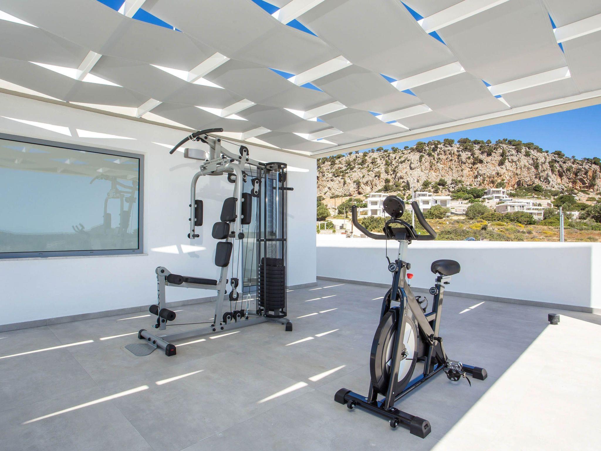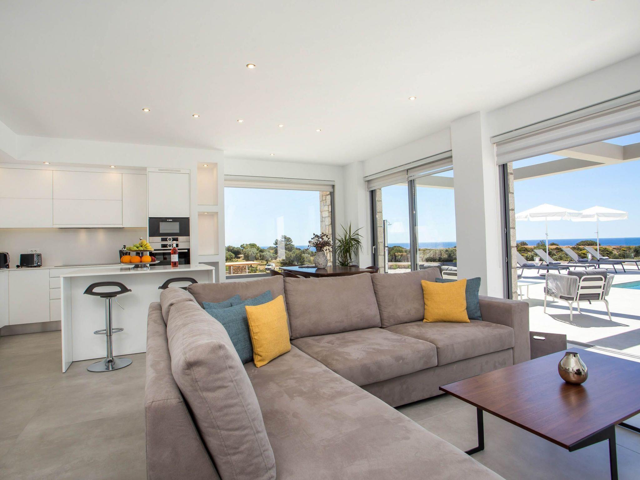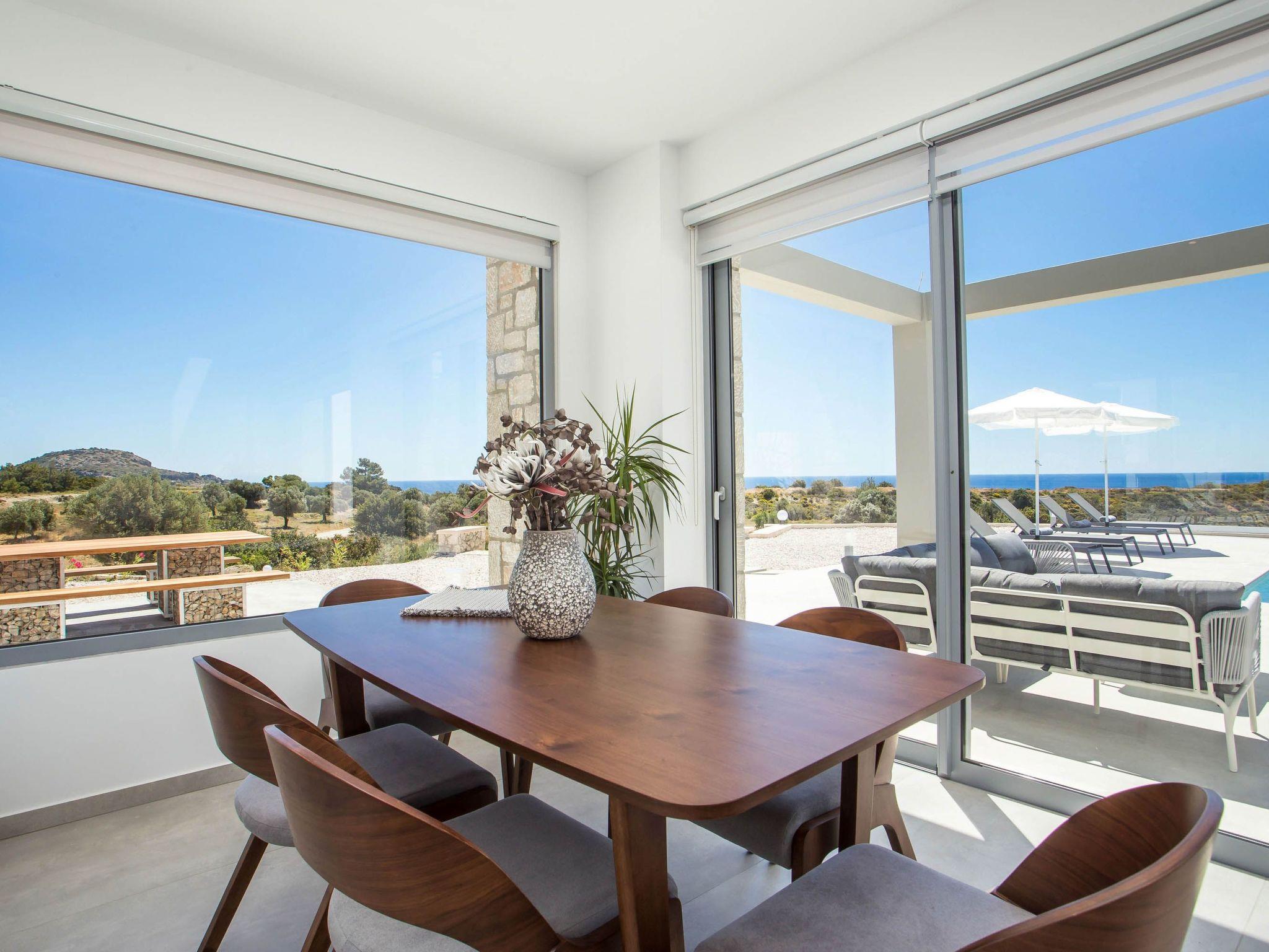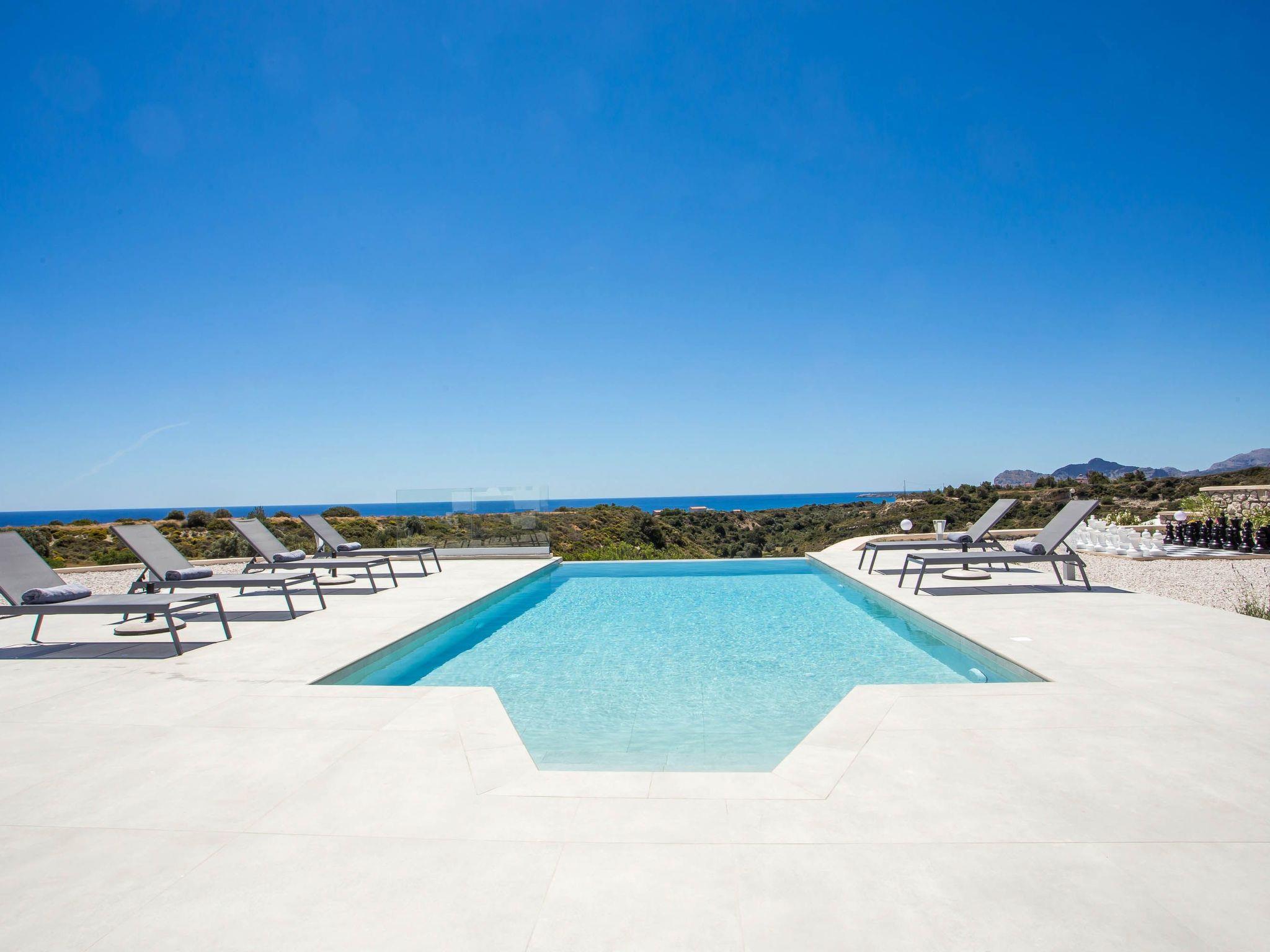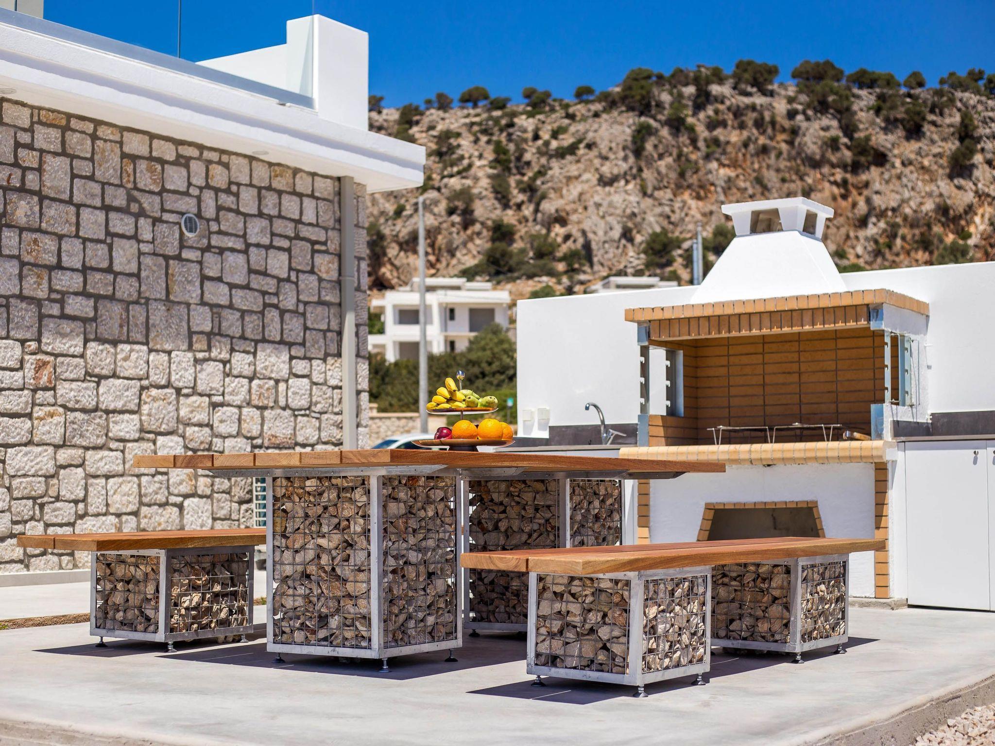 Your house in Rhodes combines comfort, relaxation, and luxury in a great location of Psalidi near all kinds of conveniences and places of interest. It offers a stunning private swimming pool and a contemporary design that will steal your heart. Also, the villa has an amazing view of the sea and is quite close to the cleanest beach of the island, Traganou beach, in only a 10-minute drive. Ideal for families and groups of friends, it accommodates up to 6 people.This stunning villa has 3 fully airconditioned bedrooms, one with a king-sized bed and 2 with double beds. Two of the bedrooms feature ensuite bathrooms with a shower. Also, there is a sharing bathroom with a shower as well. The decoration style in warm colors will make you relax and enjoy your holidays to the fullest. Guests will find a fully equipped kitchen suitable for any meal preparation as well as a seating area. Also, there is a living room with a smart Tv with cable channels and Netflix where you can relax and enjoy your company while arranging your next outdoor activity! All areas are fully air conditioned and there is free WIFI access throughout the property. Outdoors, there is a marvelous private swimming pool surrounded by its sunbeds and the breathtaking sea view. You can also find BBq facilities where you can prepare a delicious meal and have a gathering with your loved ones. Also, there’s an outdoor giant chess game for fun moments by the pool. And for those who don’t miss their workout even on vacation the villa provides you with outdoor gym equipment! This villa has everything you might need to feel comfortable and at home.