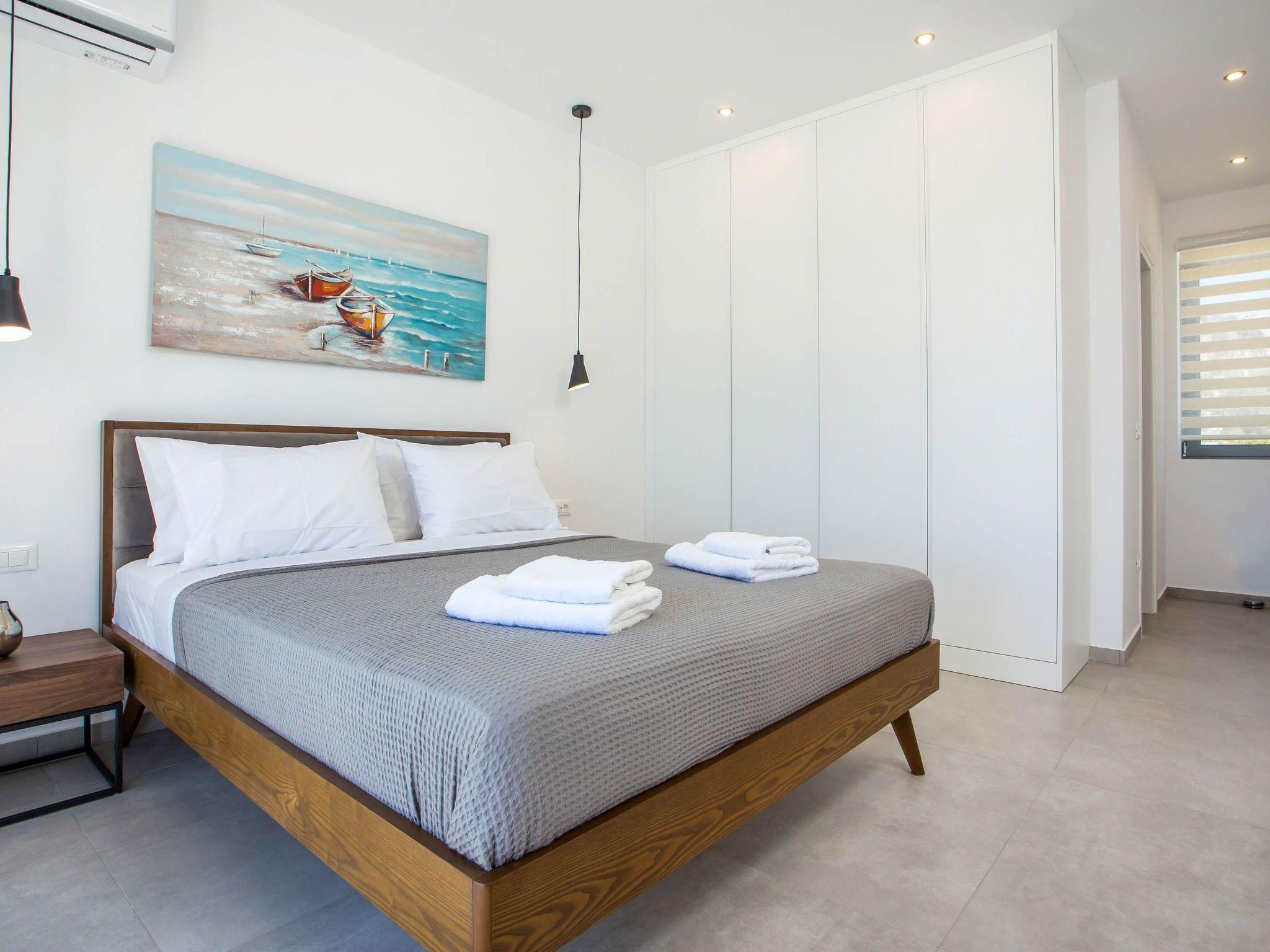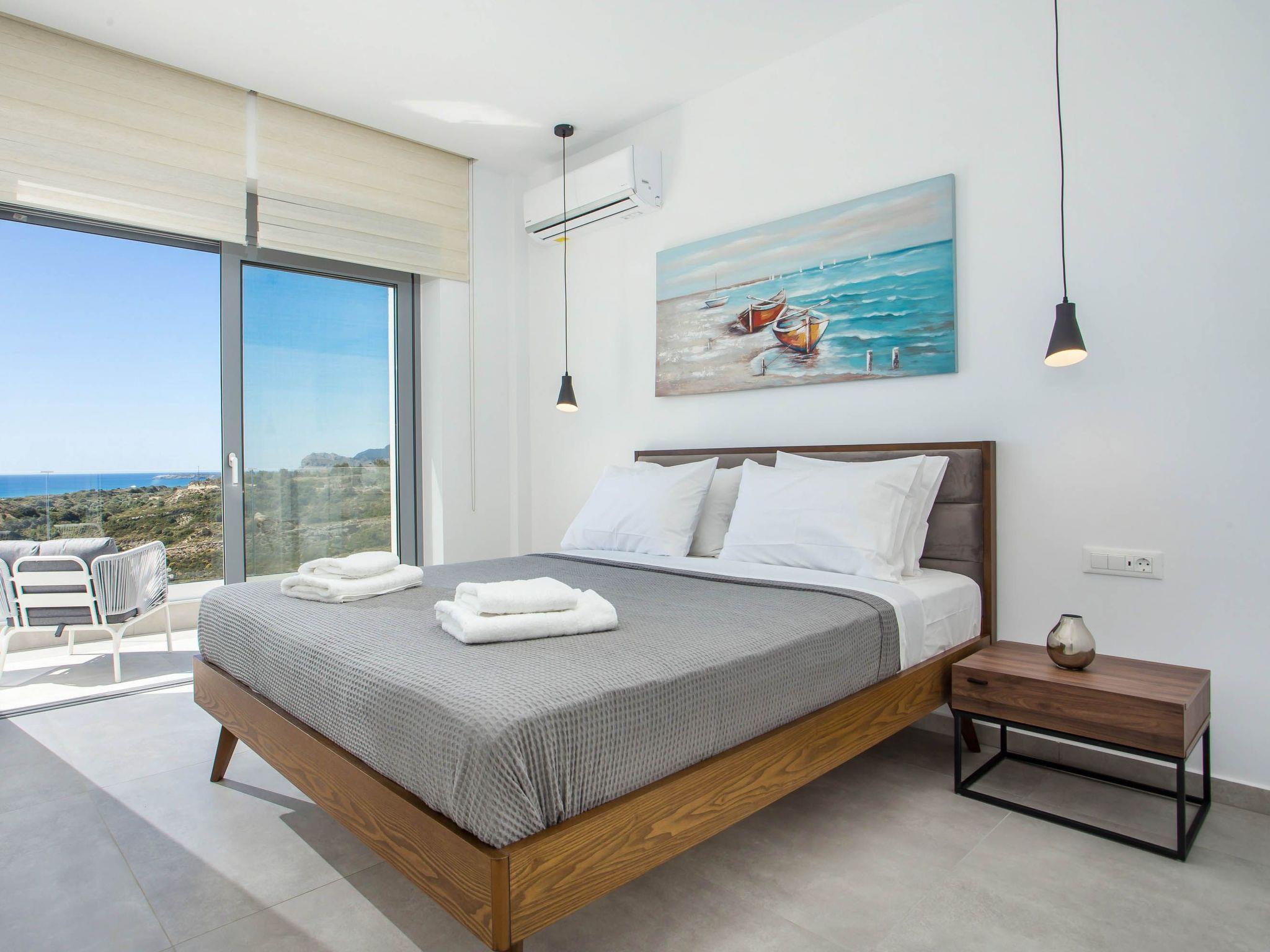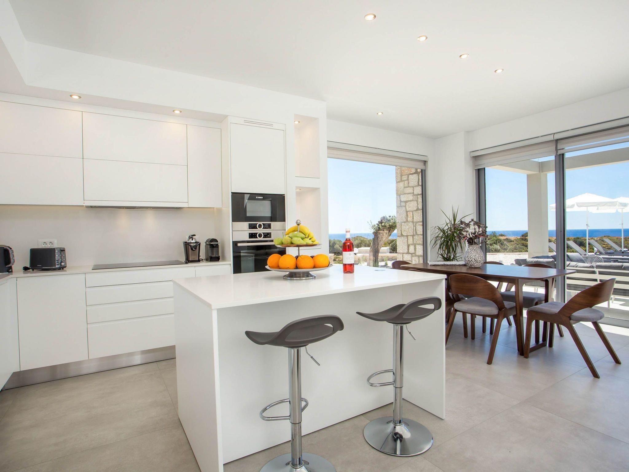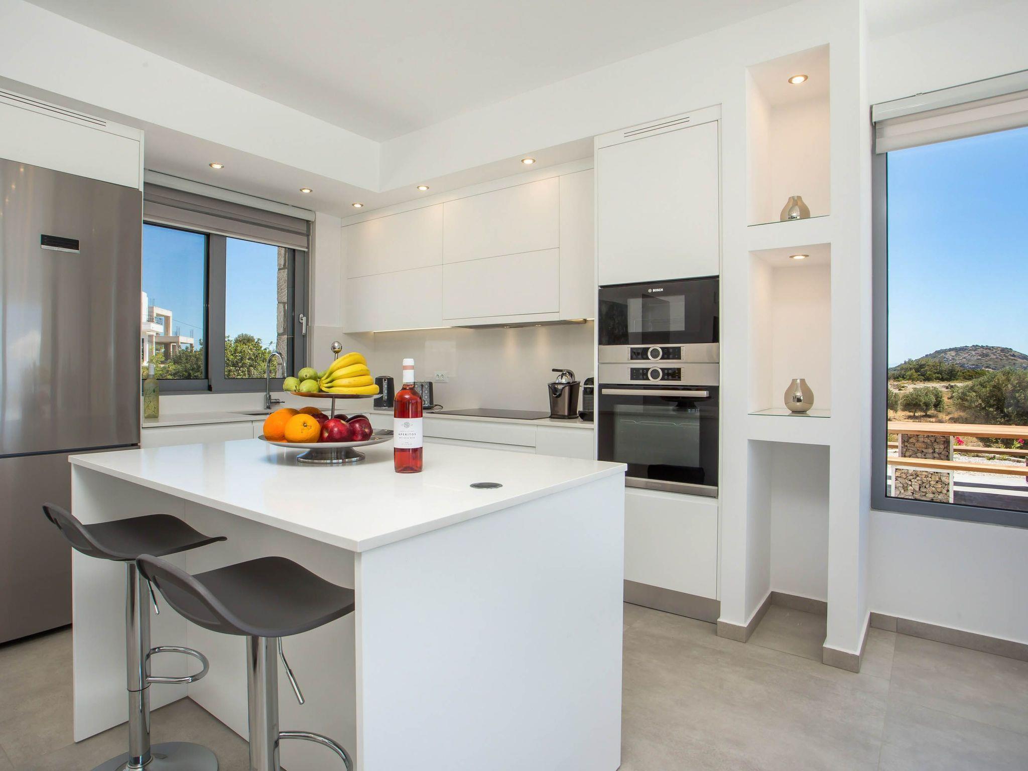 Your house in Rhodes combines comfort, relaxation, and luxury in a great location of Psalidi near all kinds of conveniences and places of interest. It offers a stunning private swimming pool and a contemporary design that will steal your heart. Also, the villa has an amazing view of the sea and is quite close to the cleanest beach of the island, Traganou beach, in only a 10-minute drive. Ideal for families and groups of friends, it accommodates up to 6 people.This stunning villa has 3 fully airconditioned bedrooms, one with a king-sized bed and 2 with double beds. Two of the bedrooms feature ensuite bathrooms with a shower. Also, there is a sharing bathroom with a shower as well. The decoration style in warm colors will make you relax and enjoy your holidays to the fullest. Guests will find a fully equipped kitchen suitable for any meal preparation as well as a seating area. Also, there is a living room with a smart Tv with cable channels and Netflix where you can relax and enjoy your company while arranging your next outdoor activity! All areas are fully air conditioned and there is free WIFI access throughout the property. Outdoors, there is a marvelous private swimming pool surrounded by its sunbeds and the breathtaking sea view. You can also find BBq facilities where you can prepare a delicious meal and have a gathering with your loved ones. Also, there’s an outdoor giant chess game for fun moments by the pool. And for those who don’t miss their workout even on vacation the villa provides you with outdoor gym equipment! This villa has everything you might need to feel comfortable and at home.