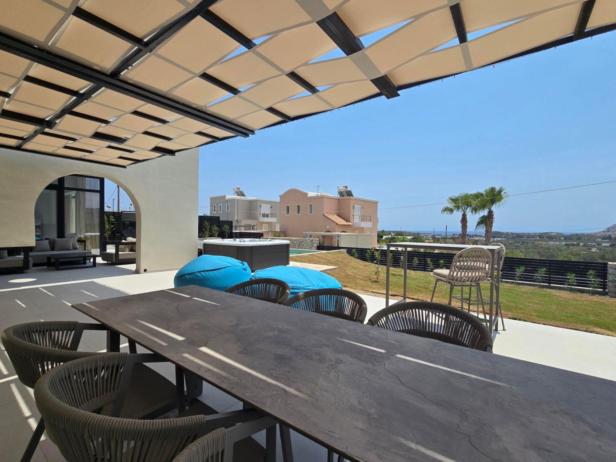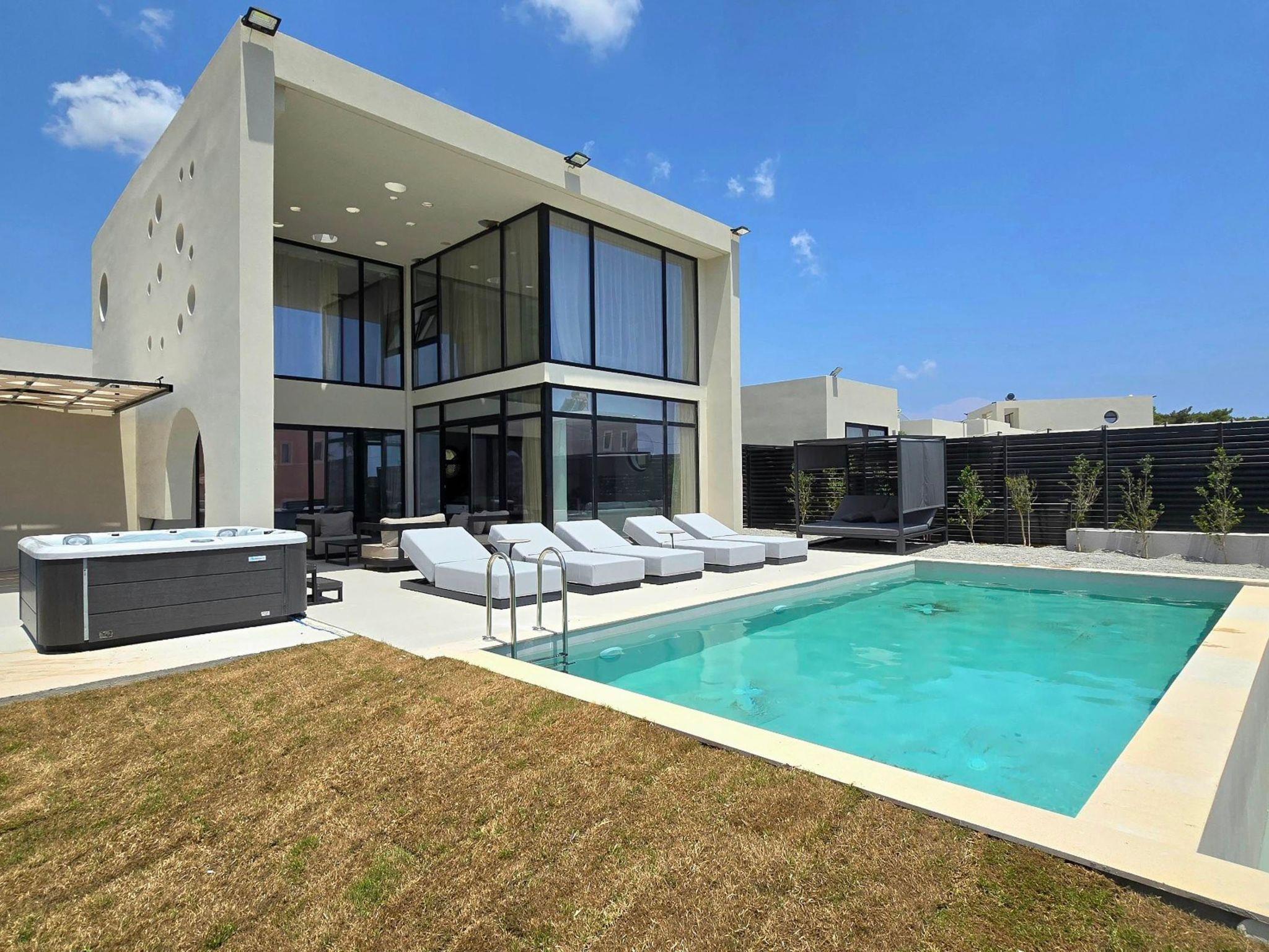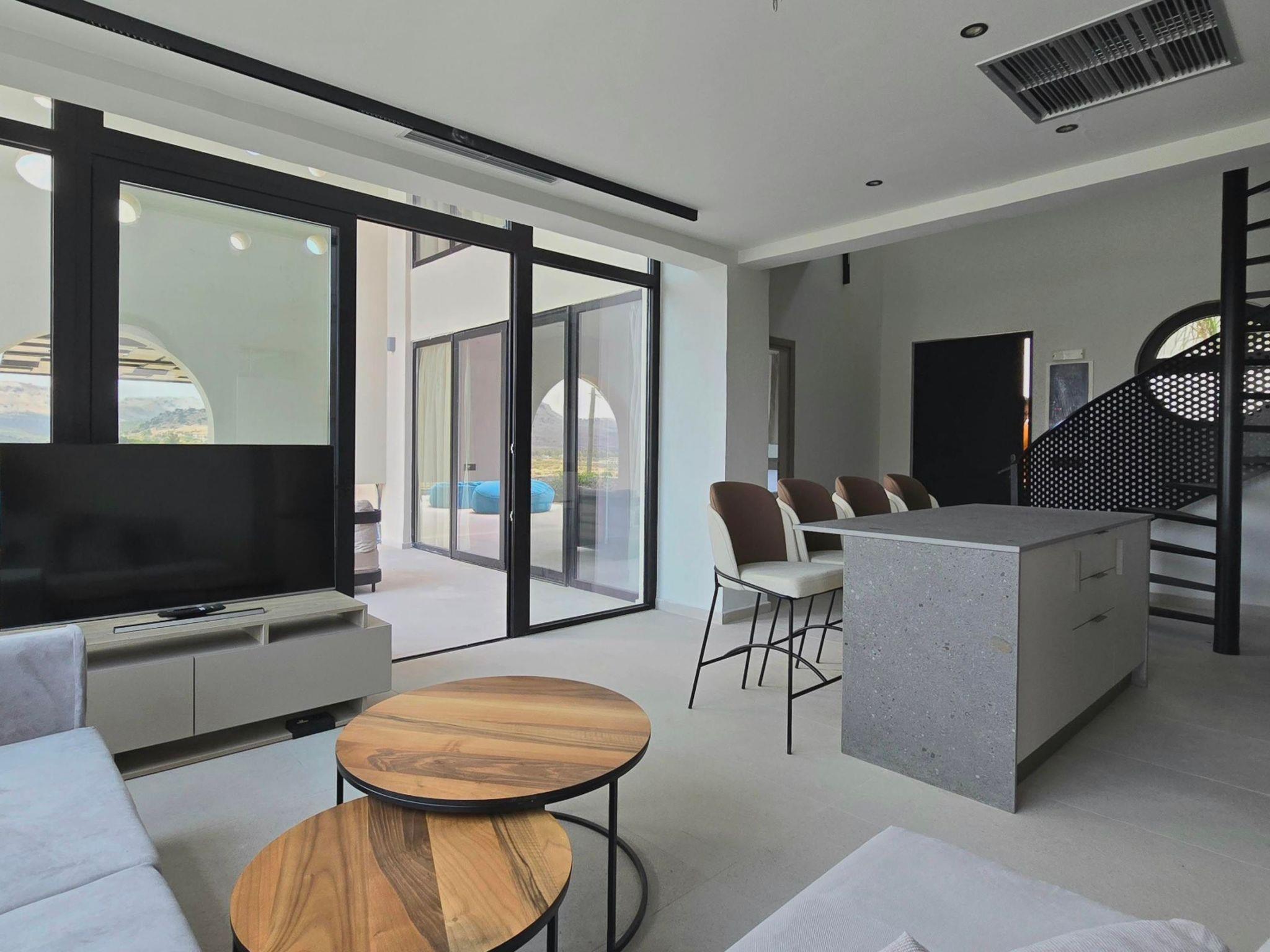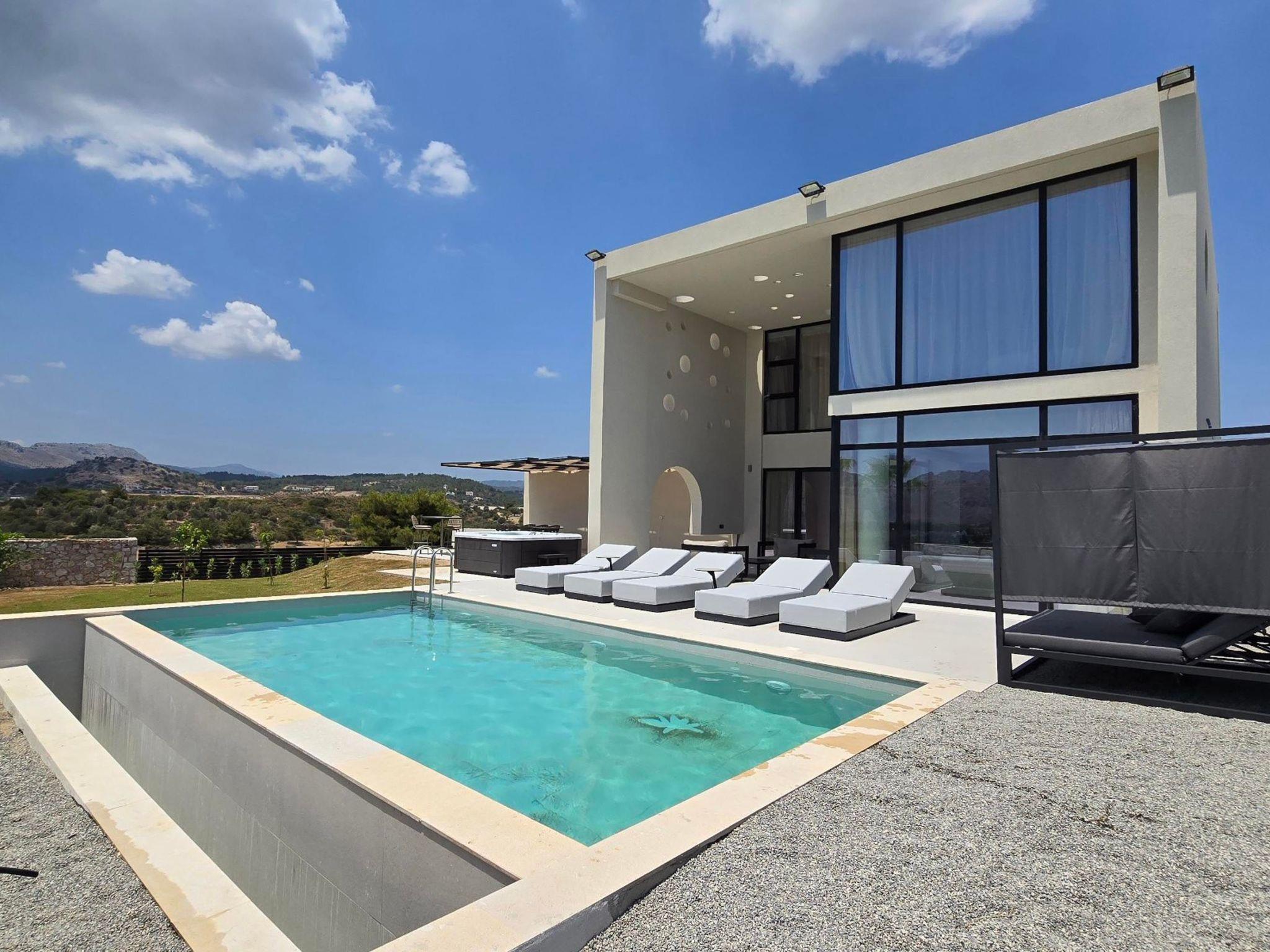 Welcome to the magic luxury living of Trapezia Villas. Trapezia Luxury Living boasts a stunning design that combines modern aesthetics with timeless elegance. Every detail is meticulously crafted to create a sophisticated and luxurious atmosphere. They offers expansive living spaces, including large living rooms, dining areas, and three fully equipped bedrooms with en-suite. The high ceilings and open floor plan enhance the sense of grandeur and provide ample room for relaxation and entertainment. All Trapezia villas are equipped with top-of-the-line amenities to ensure an unparalleled experience of luxury. From a fully-equipped outdoor gourmet kitchen to a private swimming pool and spa, every aspect of comfort and indulgence is taken care of. Trapezia Luxury Living is the epitome of opulence and sophistication, offering a truly exceptional living experience for those seeking the finest in accommodation.Type A villas are two floor luxury detached villas that hosts up to 6 guests.There are 3 fully air-conditioned bedrooms with unique decorations. All of the bedrooms offer ensuite bathrooms with a shower. There’s a fully equipped kitchen in warm colors, suitable for any meal preparation accompanied by the seating area and the living room. There’s a smart TV and free WIFI access throughout the property. Outdoors, there’s a private swimming pool and jacuzzi with sunbeds and a seating area where you can relax under the rays of the Aegean sun. The amazing outdoor kitchen with the dinning are promises memorable dinner’s under the Greek sky. You can spend your time by your private swimming pool or enjoy a fresh meal prepared in the BBQ installation. This amazing property and the beautiful location make the perfect match for a memorable stay and unforgettable holidays in Rhodes!