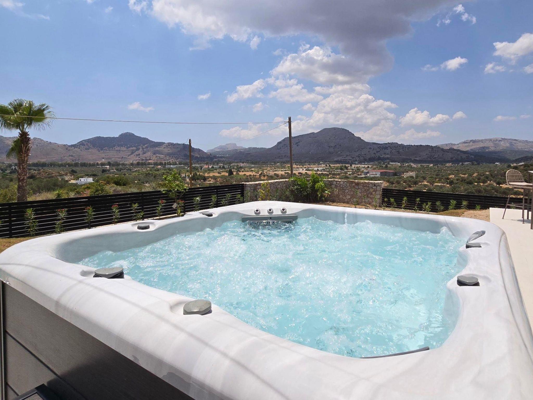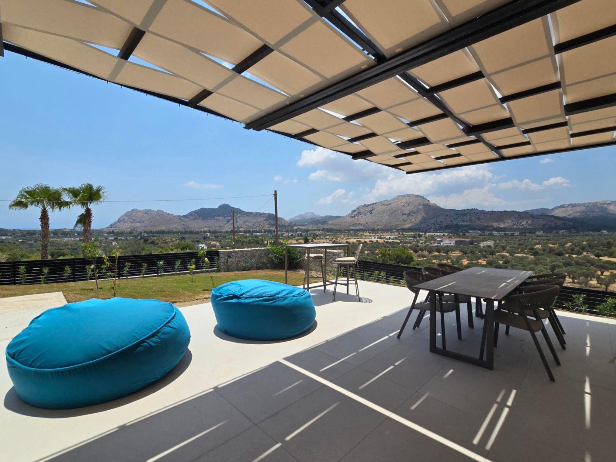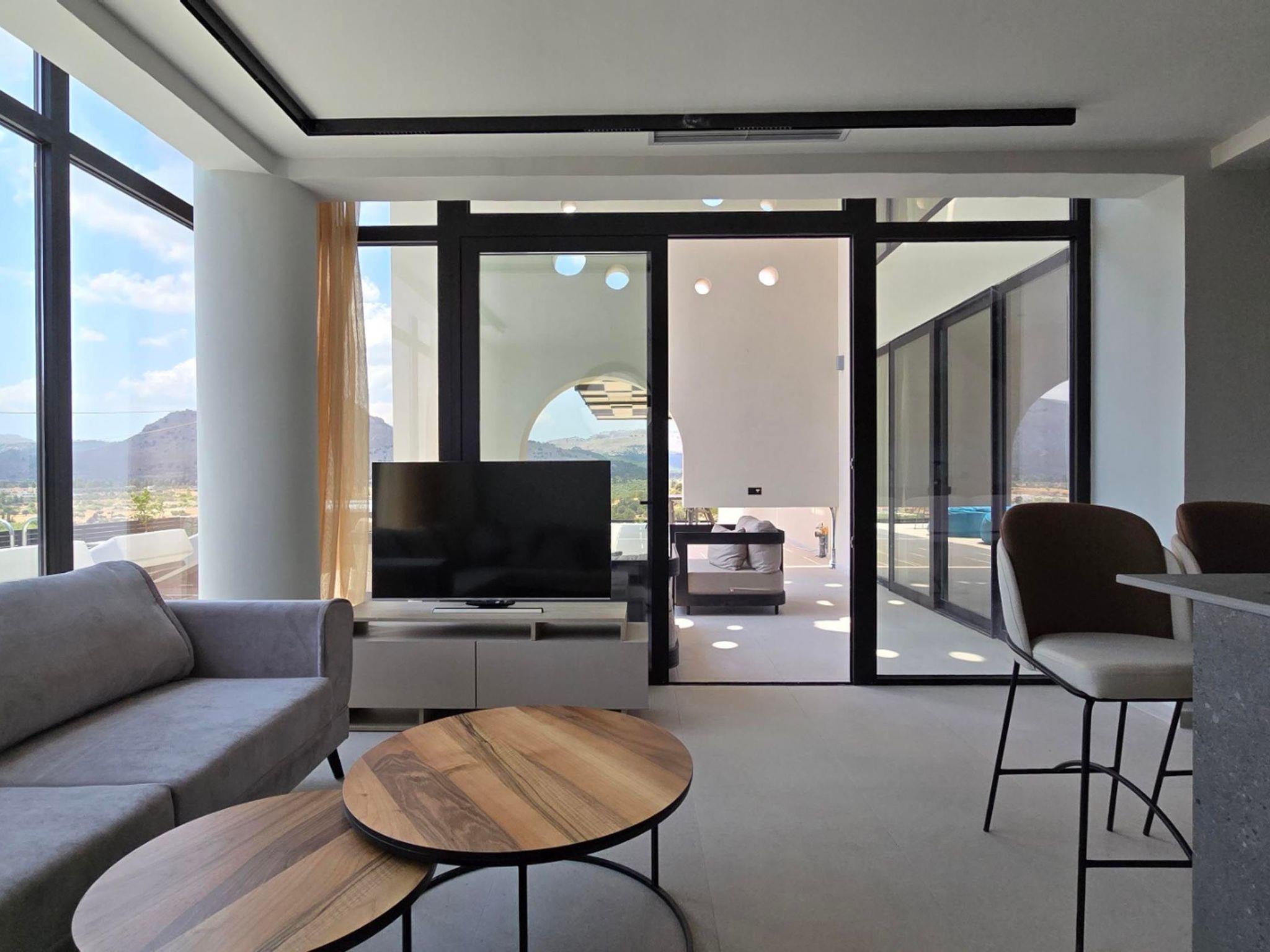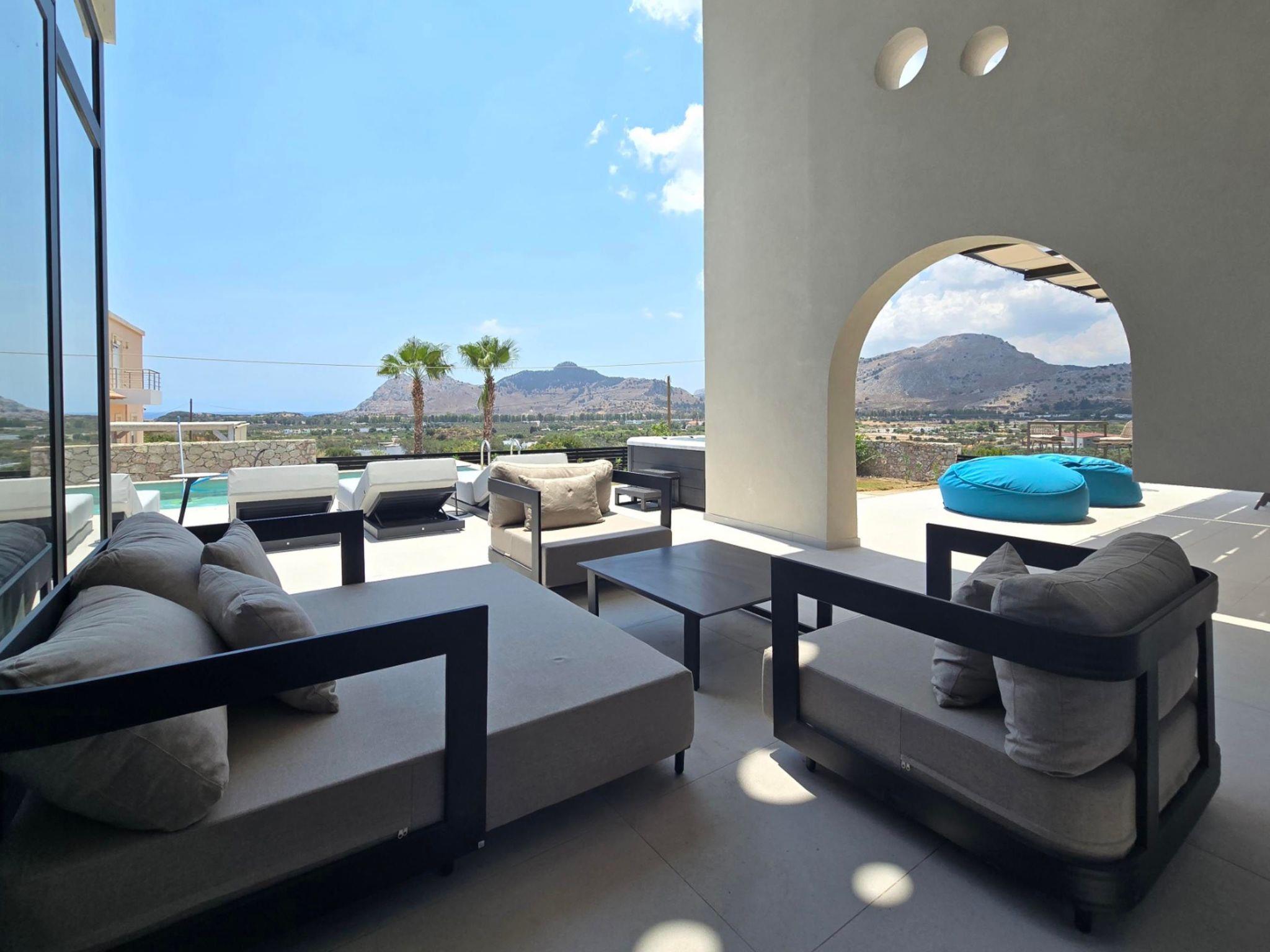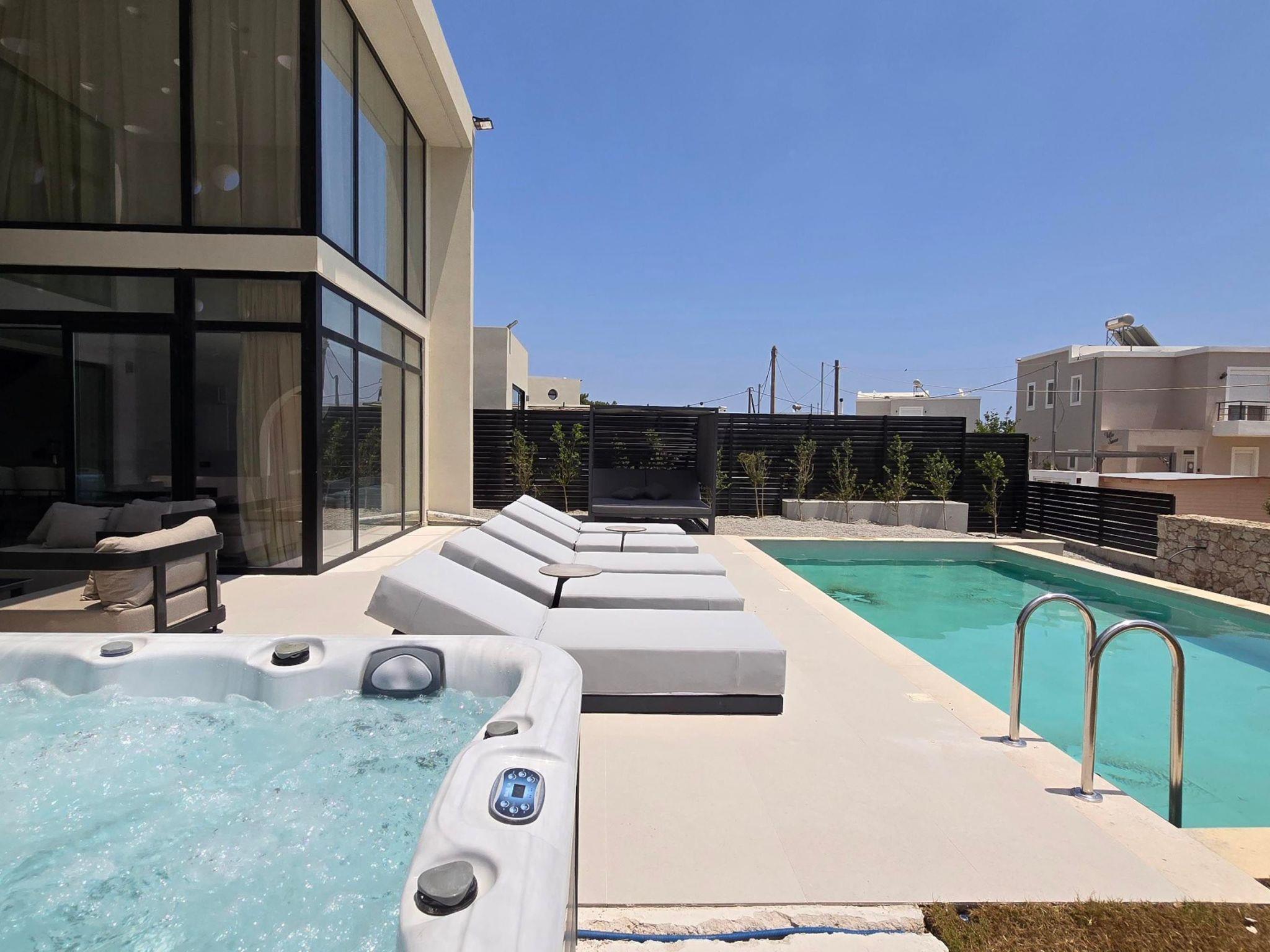 Welcome to the magic luxury living of Trapezia Villas. Trapezia Luxury Living boasts a stunning design that combines modern aesthetics with timeless elegance. Every detail is meticulously crafted to create a sophisticated and luxurious atmosphere. They offers expansive living spaces, including large living rooms, dining areas, and three fully equipped bedrooms with en-suite. The high ceilings and open floor plan enhance the sense of grandeur and provide ample room for relaxation and entertainment. All Trapezia villas are equipped with top-of-the-line amenities to ensure an unparalleled experience of luxury. From a fully-equipped outdoor gourmet kitchen to a private swimming pool and spa, every aspect of comfort and indulgence is taken care of. Trapezia Luxury Living is the epitome of opulence and sophistication, offering a truly exceptional living experience for those seeking the finest in accommodation.Type A villas are two floor luxury detached villas that hosts up to 6 guests.There are 3 fully air-conditioned bedrooms with unique decorations. All of the bedrooms offer ensuite bathrooms with a shower. There’s a fully equipped kitchen in warm colors, suitable for any meal preparation accompanied by the seating area and the living room. There’s a smart TV and free WIFI access throughout the property. Outdoors, there’s a private swimming pool and jacuzzi with sunbeds and a seating area where you can relax under the rays of the Aegean sun. The amazing outdoor kitchen with the dinning are promises memorable dinner’s under the Greek sky. You can spend your time by your private swimming pool or enjoy a fresh meal prepared in the BBQ installation. This amazing property and the beautiful location make the perfect match for a memorable stay and unforgettable holidays in Rhodes!