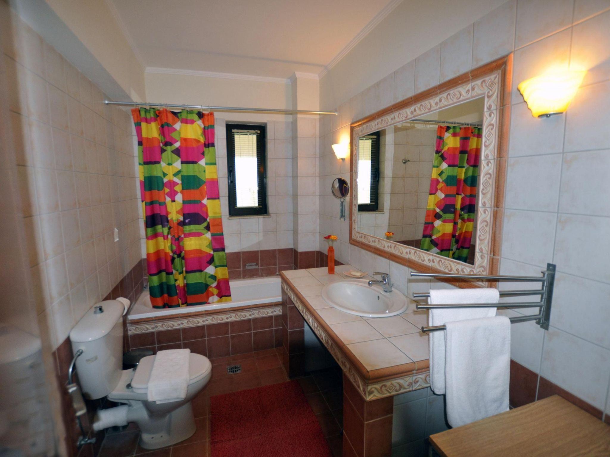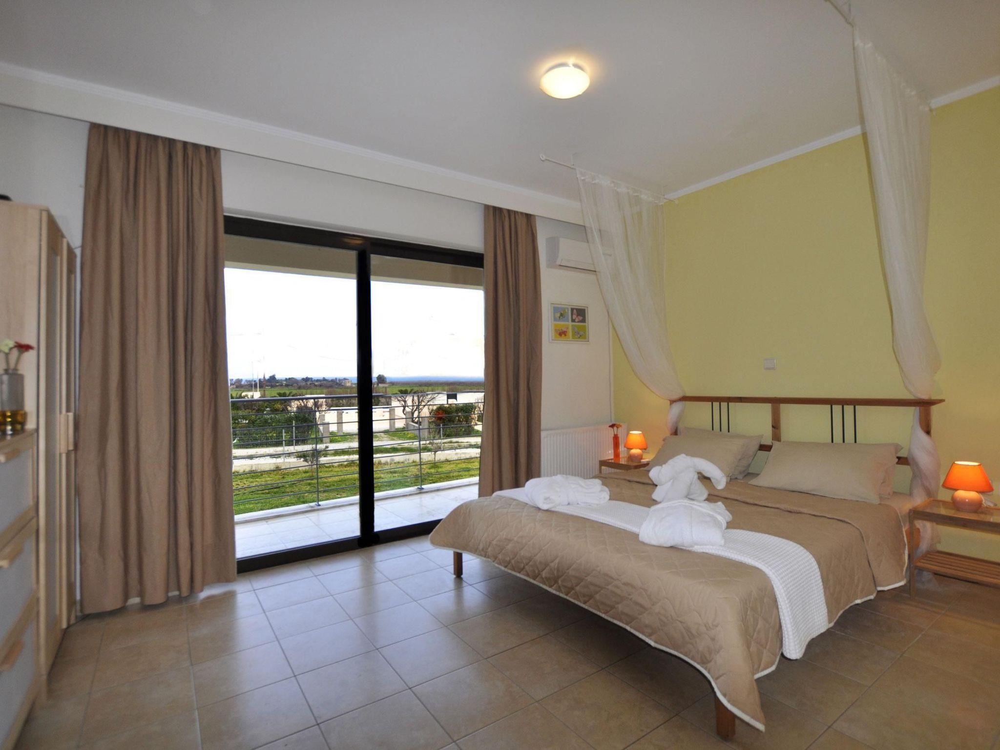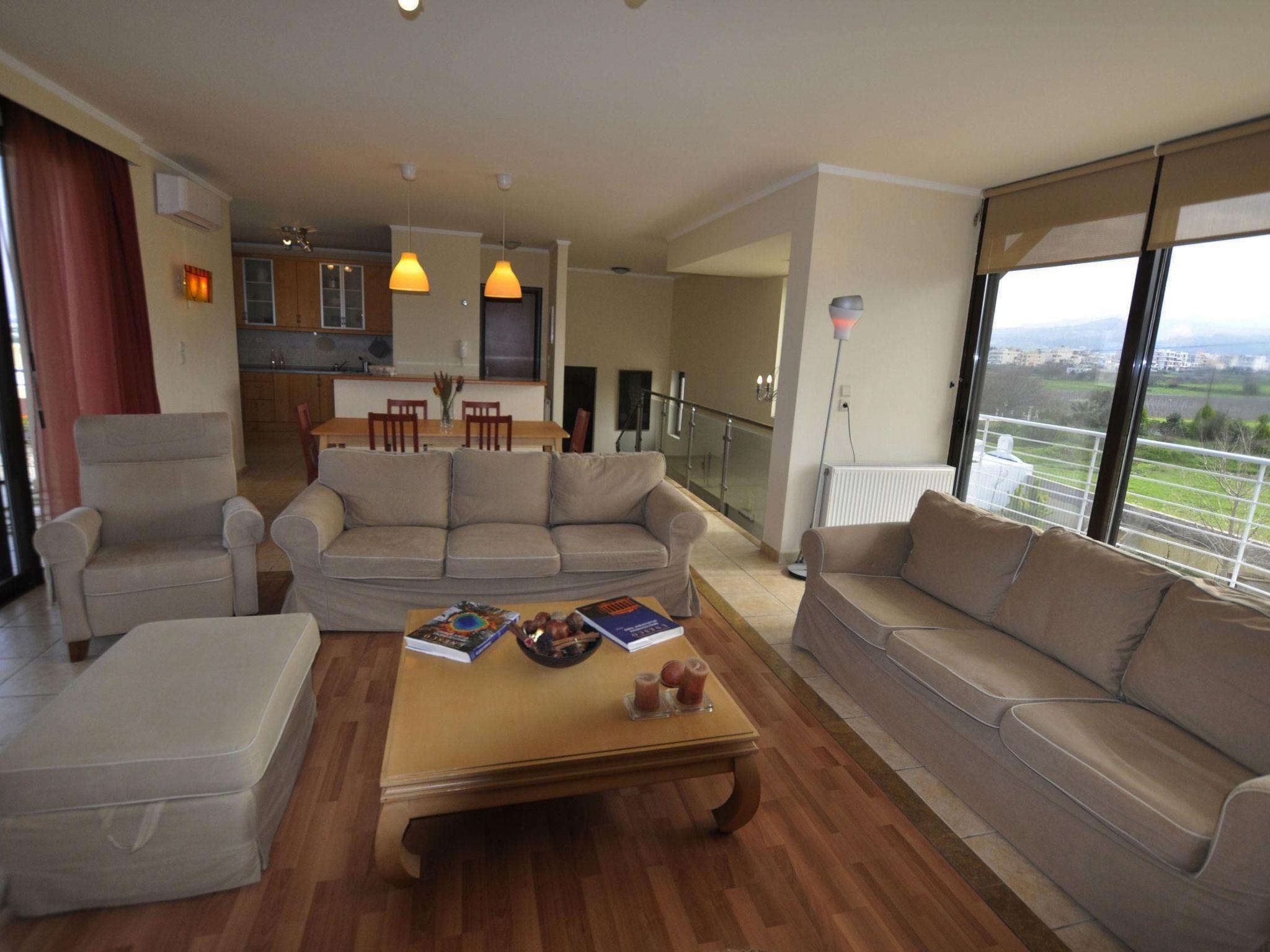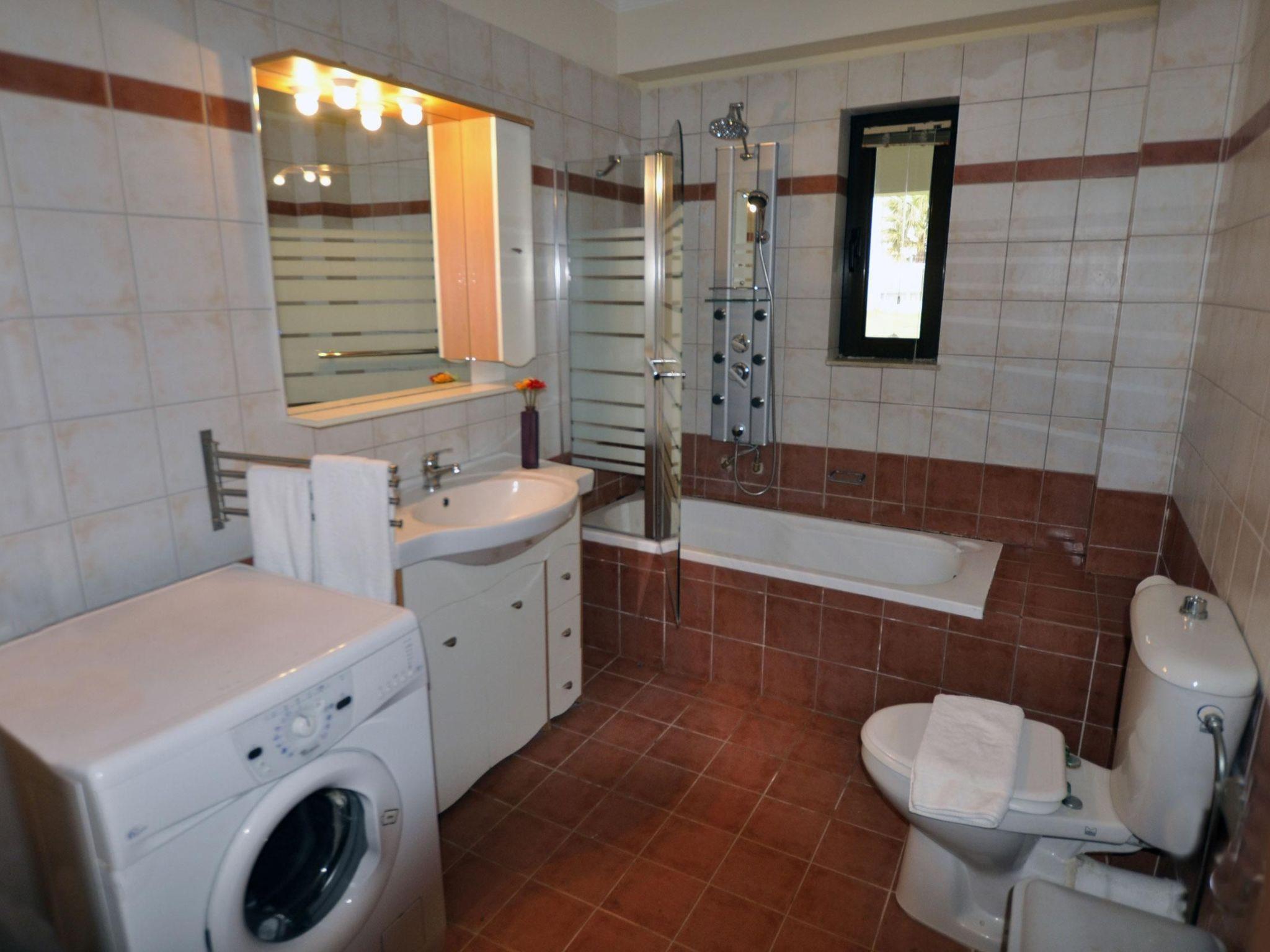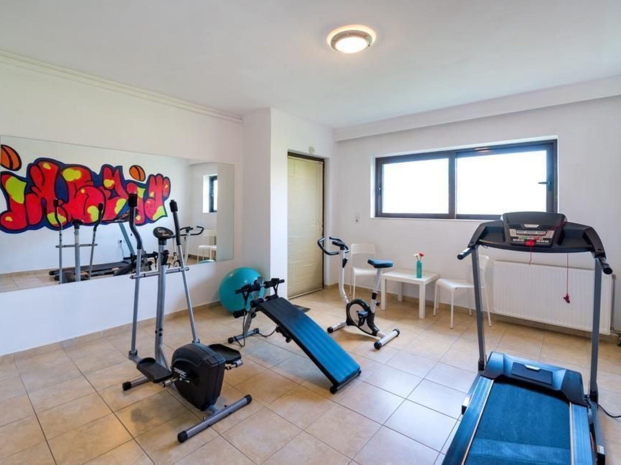 The luxuriously furnished villa is spread over three floors, provides around 250m² of living space and can accommodate up to ten people. One of the four bedrooms is on the ground floor. It measures 28m² and has a double bed, a sofa bed and a view of the garden. It also has a big bathroom with a bath and a shower cubicle with massage jets. Right next to the bathroom there is the fitness room, ideal for guests who would like to keep up with exercise on holiday. The first floor has two further bedrooms, each with a double bed and a view of the sea. There is also a big bathroom with a bath. There is a 30m² studio with two single beds, a kitchenette and an en-suite bathroom with a shower. The 60m² living room is on the second floor, providing a comfortable suite by the fireplace with a flatscreen TV (satellite receiver). Behind the sitting area there is the dining space with an open, fully-equipped kitchen. There are two big windows (3 x 2 metres) on the south side of the living room, with a view of the biggest mountain on the island, Dikaios. Another bathroom rounds off the accommodation. The house has central heating and each room has air conditioning. Board games for children, a Playstation 3 and wireless Internet access are provided. Two hairdryers, a children’s bed, scales, a safe, a fire extinguisher and a First Aid Kit are also available.